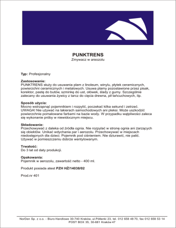 PUNKTRENS Zmywacz w areozolu Typ: Profesjonalny Zastosowanie: PUNKTRENS s³u¿y do usuwania plam z linoleum, winylu, p³ytek ceramicznych, powierzchni ceramicznych i metalowych. Usuwa plamy pozostawione przez pisak, korektor, pastê do butów, szminkê do ust, o³ówek, œlady z gumy. Szczególnie zalecany do usuwania ¿ywicy z tarcz do ciêcia drewna, pi³ ³añcuchowych, itp. Sposób u¿ycia: Mocno wstrz¹sn¹æ pojemnikiem i rozpyliæ, poczekaæ kilka sekund i zetrzeæ. UWAGA! Nie u¿ywaæ na lakierach samochodowych ani pleksi. Mo¿e uszkodziæ powierzchnie pomalowane farbami na bazie wody. W przypadku w¹tpliwoœci zaleca siê wykonanie próby w niewidocznym miejscu. Sk³adowanie: Przechowywaæ z daleka od Ÿród³a ognia. Nie rozpylaæ w stronê ognia ani ¿arz¹cych siê obiektów. Unikaæ wdychania par i aerozolu. Przechowywaæ w miejscach niedostêpnych dla dzieci. Pojemnik pod ciœnieniem. Nie dziurawiæ, nie paliæ. U¿ywaæ w pomieszczeniu dobrze wentylowanym. Trwa³oœæ: Do 3 lat od daty produkcji. Opakowania: Pojemnik w aerozolu, zawartoœæ netto - 400 ml. Produkt posiada atest PZH H¯/14038/02 Prod.nr 401 NorDen Sp. z o.o. - Biuro Handlowe 30-740 Kraków, ul.Pó³³anki 23, tel. 012 658 48 70, fax 012 658 53 14 POST BOX 35, 30-681 Kraków 47