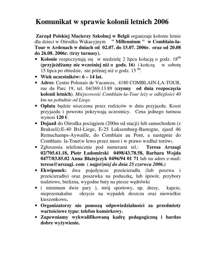 Komunikat w sprawie kolonii letnich 2006 Zarząd Polskiej Macierzy Szkolnej w Belgii organizuje kolonie letnie dla dzieci w Ośrodku Wakacyjnym " Millennium " w Comblain-laTour w Ardenach w dniach od 02.07. do 15.07. 2006r. oraz od 20.08 do 26.08. 2006r. (trzy turnusy). • Kolonie rozpoczynają się w niedzielę 2 lipca kolacją o godz. 1800 (przyjeżdżamy nie wcześniej niż o godz. 16) i kończą w sobotę 15 lipca po obiedzie, nie później niż o godz. 15 00. • Wiek uczestników: 6 – 14 lat. • Adres: Centre Polonais de Vacances, 4180 COMBLAIN-LA-TOUR, rue du Parc 19, tel. 04/369.13.89 (czynny od dnia rozpoczęcia kolonii letnich). Miejscowość Comblain-la-Tour leży w odleglości 40 km na południe od Liege. • Opłata będzie uiszczona przez rodziców w dniu przyjazdu. Koszt przyjazdu i powrotu pokrywają uczestnicy. Cena jednego turnusu wynosi 120 €. • Dojazd do Ośrodka pociągiem (200m od stacji) lub samochodem (z Brukseli):E-40 Bxl-Liege, E-25 Luksemburg-Bastogne, zjazd 46 Remuchamps-Aywaille, do Comblain au Pont, a następnie do Comblain- la-Tour(w lewo przez most i w prawo wzdłuż torów). • Zgłoszenia telefonicznie pod numerami tel.: Teresa Arszagi 02/705.61.18, Piotr Ładomirski 0498/43.78.58, Barbara Wojda 0477/83.85.02 Anna Błażejczyk 0496/94 01 71 lub na adres e-mail: teresa@arszagi. com ( najpóżniej do dnia 25 czerwca 2006.) • Ekwipunek: dwa pojedyncze prześcieradła (lub poszwa i prześcieradło) oraz poszewka na poduszkę, lub śpiwór, przybory toaletowe, bielizna, wygodne buty na piesze wędrówki • ( minimum dwie pary ), strój sportowy, np. dresy, kapcie, nieprzemakalne okrycie na wypadek deszczu oraz niewielkie kieszonkowe. • Organizatorzy nie ponoszą odpowiedzialności za przedmioty wartościowe typu: telefon komórkowy. • Zapewniamy wykwalifikowaną kadrę pedagogiczną i bardzo dobre wyżywienie.