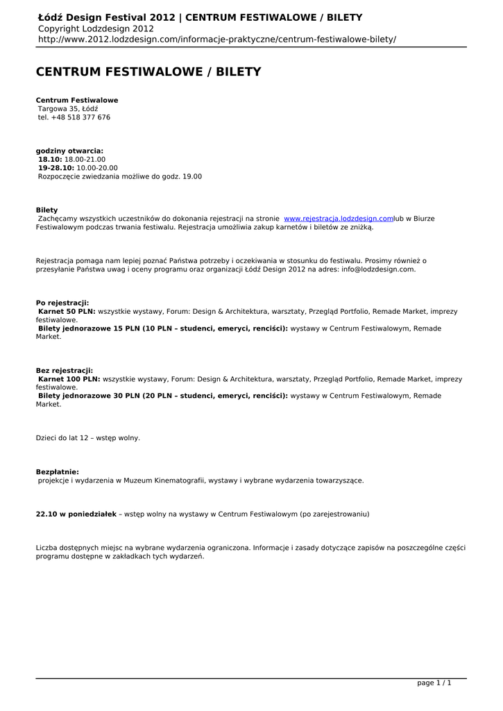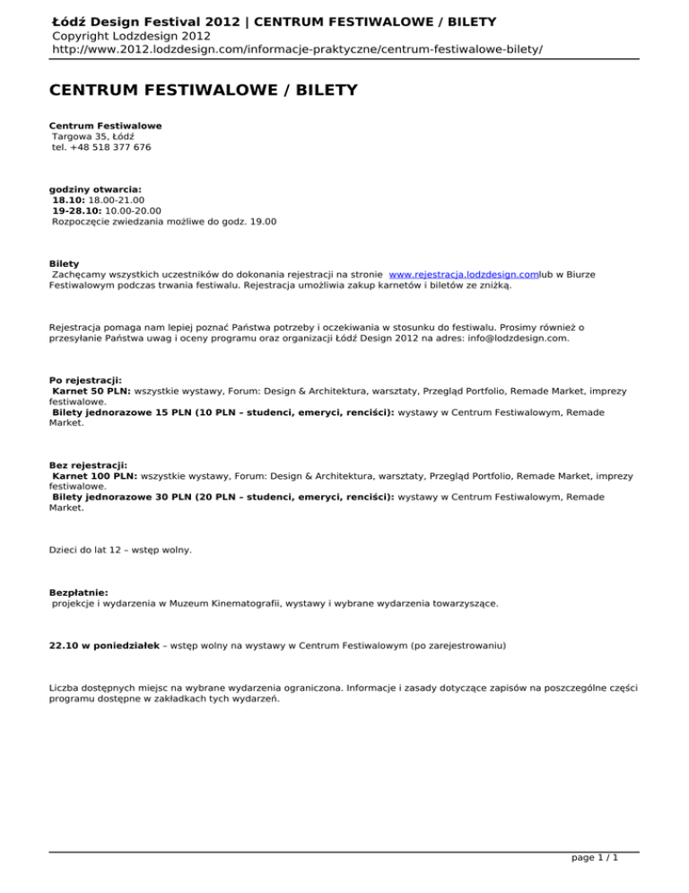 Łódź Design Festival 2012 | CENTRUM FESTIWALOWE / BILETY Copyright Lodzdesign 2012 http://www.2012.lodzdesign.com/informacje-praktyczne/centrum-festiwalowe-bilety/ CENTRUM FESTIWALOWE / BILETY Centrum Festiwalowe Targowa 35, Łódź tel. +48 518 377 676 godziny otwarcia: 18.10: 18.00-21.00 19-28.10: 10.00-20.00 Rozpoczęcie zwiedzania możliwe do godz. 19.00 Bilety Zachęcamy wszystkich uczestników do dokonania rejestracji na stronie www.rejestracja.lodzdesign.comlub w Biurze Festiwalowym podczas trwania festiwalu. Rejestracja umożliwia zakup karnetów i biletów ze zniżką. Rejestracja pomaga nam lepiej poznać Państwa potrzeby i oczekiwania w stosunku do festiwalu. Prosimy również o przesyłanie Państwa uwag i oceny programu oraz organizacji Łódź Design 2012 na adres: [email protected]. Po rejestracji: Karnet 50 PLN: wszystkie wystawy, Forum: Design & Architektura, warsztaty, Przegląd Portfolio, Remade Market, imprezy festiwalowe. Bilety jednorazowe 15 PLN (10 PLN – studenci, emeryci, renciści): wystawy w Centrum Festiwalowym, Remade Market. Bez rejestracji: Karnet 100 PLN: wszystkie wystawy, Forum: Design & Architektura, warsztaty, Przegląd Portfolio, Remade Market, imprezy festiwalowe. Bilety jednorazowe 30 PLN (20 PLN – studenci, emeryci, renciści): wystawy w Centrum Festiwalowym, Remade Market. Dzieci do lat 12 – wstęp wolny. Bezpłatnie: projekcje i wydarzenia w Muzeum Kinematografii, wystawy i wybrane wydarzenia towarzyszące. 22.10 w poniedziałek – wstęp wolny na wystawy w Centrum Festiwalowym (po zarejestrowaniu) Liczba dostępnych miejsc na wybrane wydarzenia ograniczona. Informacje i zasady dotyczące zapisów na poszczególne części programu dostępne w zakładkach tych wydarzeń. page 1 / 1