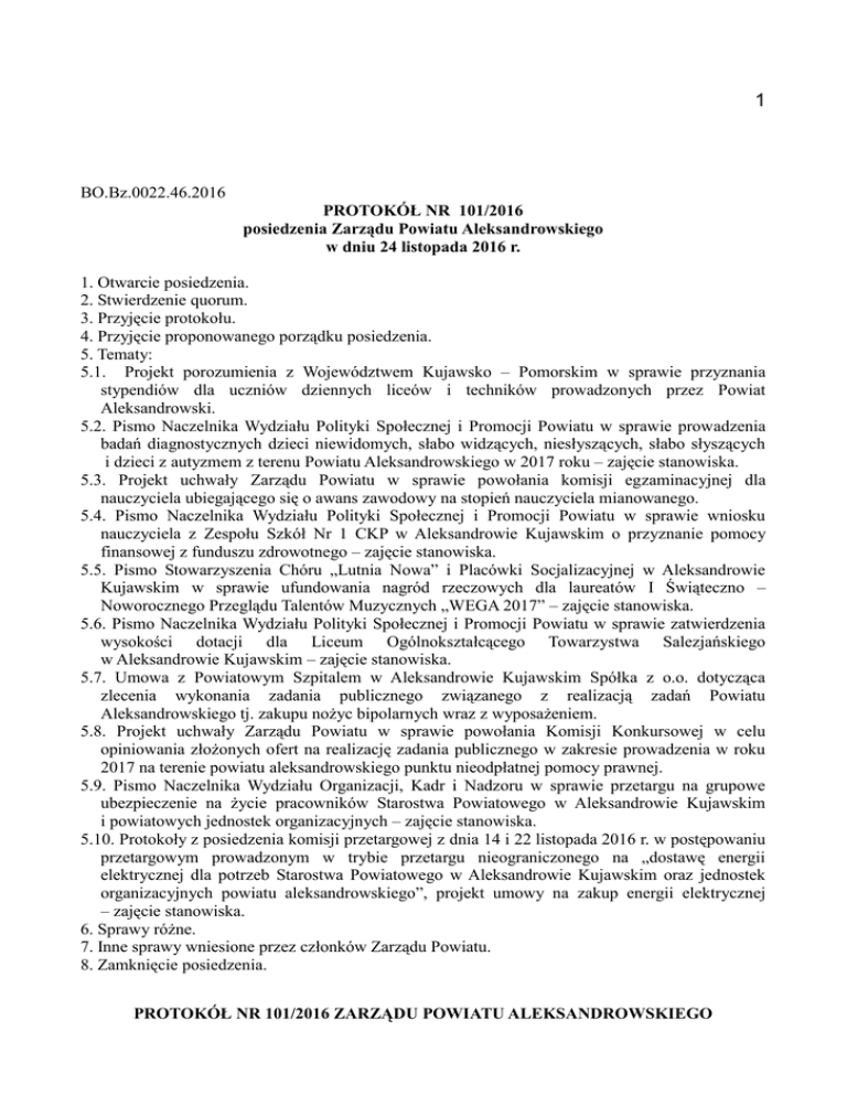 1 BO.Bz.0022.46.2016 PROTOKÓŁ NR 101/2016 posiedzenia Zarządu Powiatu Aleksandrowskiego w dniu 24 listopada 2016 r. 1. Otwarcie posiedzenia. 2. Stwierdzenie quorum. 3. Przyjęcie protokołu. 4. Przyjęcie proponowanego porządku posiedzenia. 5. Tematy: 5.1. Projekt porozumienia z Województwem Kujawsko – Pomorskim w sprawie przyznania stypendiów dla uczniów dziennych liceów i techników prowadzonych przez Powiat Aleksandrowski. 5.2. Pismo Naczelnika Wydziału Polityki Społecznej i Promocji Powiatu w sprawie prowadzenia badań diagnostycznych dzieci niewidomych, słabo widzących, niesłyszących, słabo słyszących i dzieci z autyzmem z terenu Powiatu Aleksandrowskiego w 2017 roku – zajęcie stanowiska. 5.3. Projekt uchwały Zarządu Powiatu w sprawie powołania komisji egzaminacyjnej dla nauczyciela ubiegającego się o awans zawodowy na stopień nauczyciela mianowanego. 5.4. Pismo Naczelnika Wydziału Polityki Społecznej i Promocji Powiatu w sprawie wniosku nauczyciela z Zespołu Szkół Nr 1 CKP w Aleksandrowie Kujawskim o przyznanie pomocy finansowej z funduszu zdrowotnego – zajęcie stanowiska. 5.5. Pismo Stowarzyszenia Chóru „Lutnia Nowa” i Placówki Socjalizacyjnej w Aleksandrowie Kujawskim w sprawie ufundowania nagród rzeczowych dla laureatów I Świąteczno – Noworocznego Przeglądu Talentów Muzycznych „WEGA 2017” – zajęcie stanowiska. 5.6. Pismo Naczelnika Wydziału Polityki Społecznej i Promocji Powiatu w sprawie zatwierdzenia wysokości dotacji dla Liceum Ogólnokształcącego Towarzystwa Salezjańskiego w Aleksandrowie Kujawskim – zajęcie stanowiska. 5.7. Umowa z Powiatowym Szpitalem w Aleksandrowie Kujawskim Spółka z o.o. dotycząca zlecenia wykonania zadania publicznego związanego z realizacją zadań Powiatu Aleksandrowskiego tj. zakupu nożyc bipolarnych wraz z wyposażeniem. 5.8. Projekt uchwały Zarządu Powiatu w sprawie powołania Komisji Konkursowej w celu opiniowania złożonych ofert na realizację zadania publicznego w zakresie prowadzenia w roku 2017 na terenie powiatu aleksandrowskiego punktu nieodpłatnej pomocy prawnej. 5.9. Pismo Naczelnika Wydziału Organizacji, Kadr i Nadzoru w sprawie przetargu na grupowe ubezpieczenie na życie pracowników Starostwa Powiatowego w Aleksandrowie Kujawskim i powiatowych jednostek organizacyjnych – zajęcie stanowiska. 5.10. Protokoły z posiedzenia komisji przetargowej z dnia 14 i 22 listopada 2016 r. w postępowaniu przetargowym prowadzonym w trybie przetargu nieograniczonego na „dostawę energii elektrycznej dla potrzeb Starostwa Powiatowego w Aleksandrowie Kujawskim oraz jednostek organizacyjnych powiatu aleksandrowskiego”, projekt umowy na zakup energii elektrycznej – zajęcie stanowiska. 6. Sprawy różne. 7. Inne sprawy wniesione przez członków Zarządu Powiatu. 8. Zamknięcie posiedzenia. PROTOKÓŁ NR 101/2016 ZARZĄDU POWIATU ALEKSANDROWSKIEGO 2 Ad 1. Pan Dariusz Wochna Starosta Aleksandrowski – otwieram posiedzenie Zarządu Powiatu Aleksandrowskiego. Witam Wicestarostę Aleksandrowskiego pana Wojciecha Marjańskiego, Skarbnika Powiatu panią Dorotę Sobierajską i Sekretarza Powiatu pana Piotra Marciniaka. Posiedzenie Zarządu Powiatu zostało otwarte o godzinie 9:30. Ad. 2. Pan Dariusz Wochna – stwierdzam quorum. W posiedzeniu uczestniczy dwóch członków Zarządu Powiatu. Posiedzenie jest prawomocne i Zarząd może podejmować uchwały. Lista obecności stanowi załącznik do protokołu. Ad 3. Pan Dariusz Wochna – proponuję przyjąć bez czytania protokół nr 100/2016 posiedzenia Zarządu Powiatu z dnia 21 listopada 2016r. Czy są uwagi, propozycje zmian, czy uzupełnień do przedłożonego protokołu nr 100/2016 posiedzenia Zarządu Powiatu z dnia 21 listopada 2016r.? Nie widzę. Proponuję przyjąć go bez czytania. Kto jest za? Dziękuję. Przebieg głosowania: Za – 2, Przeciw – nie było, Wstrzymujących się – nie było. Jednogłośnie. Członkowie Zarządu Powiatu, w wyniku głosowania przyjęli protokół nr 100/2016 posiedzenia Zarządu Powiatu z dnia 21 listopada 2016r. Ad 4. Pan Dariusz Wochna – przechodzimy do proponowanego porządku dzisiejszego posiedzenia. Wnoszę o rozszerzenie porządku o punkt: 5.10. Protokoły z posiedzenia komisji przetargowej z dnia 14 i 22 listopada 2016 r. w postępowaniu przetargowym prowadzonym w trybie przetargu nieograniczonego na „dostawę energii elektrycznej dla potrzeb Starostwa Powiatowego w Aleksandrowie Kujawskim oraz jednostek organizacyjnych powiatu aleksandrowskiego”, projekt umowy na sprzedaż energii elektrycznej – zajęcie stanowiska. Kto jest za? Dziękuję. Przebieg głosowania: Za – 2, Przeciw – nie było, Wstrzymujących się – nie było. Jednogłośnie. Pan Dariusz Wochna – czy są inne wnioski o zmianę porządku? Nie widzę. Przechodzimy do realizacji dzisiejszego porządku posiedzenia rozszerzonego o punkty 5.10. Porządek posiedzenia Zarządu Powiatu, stanowi załącznik do protokołu. PROTOKÓŁ NR 101/2016 ZARZĄDU POWIATU ALEKSANDROWSKIEGO 3 Ad 5.1. Projekt porozumienia z Województwem Kujawsko – Pomorskim w sprawie przyznania stypendiów dla uczniów dziennych liceów i techników prowadzonych przez Powiat Aleksandrowski. Pan Dariusz Wochna – przechodzimy do punktu 5.1. Projekt porozumienia z Województwem Kujawsko – Pomorskim w sprawie przyznania stypendiów dla uczniów dziennych liceów i techników prowadzonych przez Powiat Aleksandrowski. Naczelnik Wydziału Polityki Społecznej i Promocji Powiatu przedkłada projekt porozumienia z Województwem Kujawsko – Pomorskim w sprawie przyznania stypendiów dla uczniów dziennych liceów i techników prowadzonych przez Powiat Aleksandrowski. Na mocy niniejszego porozumienia trzech uczniów ze szkół ponadgimnazjalnych prowadzonych przez powiat tj. Zespołu Szkół Nr 1 CKP w Aleksandrowie Kujawskim, Zespołu Szkół Nr 2 w Aleksandrowie Kujawskim i Liceum Ogólnokształcącego w Ciechocinku otrzyma stypendia pr