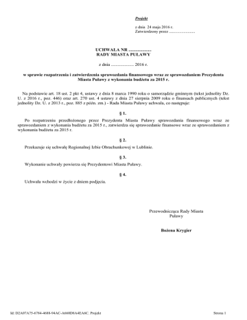 Projekt z dnia 24 maja 2016 r. Zatwierdzony przez ......................... UCHWAŁA NR .................... RADY MIASTA PUŁAWY z dnia .................... 2016 r. w sprawie rozpatrzenia i zatwierdzenia sprawozdania finansowego wraz ze sprawozdaniem Prezydenta Miasta Puławy z wykonania budżetu za 2015 r. Na podstawie art. 18 ust. 2 pkt 4, ustawy z dnia 8 marca 1990 roku o samorządzie gminnym (tekst jednolity Dz. U. z 2016 r., poz. 446) oraz art. 270 ust. 4 ustawy z dnia 27 sierpnia 2009 roku o finansach publicznych (tekst jednolity Dz. U. z 2013 r., poz. 885 z późn. zm.) - Rada Miasta Puławy uchwala, co następuje: § 1. Po rozpatrzeniu przedłożonego przez Prezydenta Miasta Puławy sprawozdania finansowego wraz ze sprawozdaniem z wykonania budżetu za 2015 r., zatwierdza się sprawozdanie finansowe wraz ze sprawozdaniem z wykonania budżetu za 2015 r. § 2. Przekazuje się uchwałę Regionalnej Izbie Obrachunkowej w Lublinie. § 3. Wykonanie uchwały powierza się Prezydentowi Miasta Puławy. § 4. Uchwała wchodzi w życie z dniem podjęcia. Przewodnicząca Rady Miasta Puławy Bożena Krygier Id: D2A07A75-6784-4688-94AC-A660D8A4EA6C. Projekt Strona 1 UZASADNIENIE W związku z nałożeniem na organ stanowiący przez ustawę z dnia 27 sierpnia 2009 r. o finansach publicznych obowiązku rozpatrzenia i zatwierdzenia sprawozdania finansowego JST oraz sprawozdania z wykonania budżetu po otrzymaniu pozytywnej opinii Komisji Rewizyjnej a także pozytywnej opinii RIO o tym sprawozdaniu wnoszę o podjęcie uchwały o rozpatrzeniu i zatwierdzeniu tych sprawozdań. Id: D2A07A75-6784-4688-94AC-A660D8A4EA6C. Projekt Strona 1