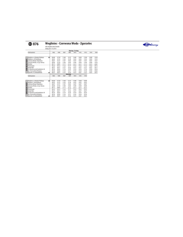 v 876 Wegliniec - Czerwona Woda - Zgorzelec Alle Angaben ohne Gewähr. Gültig ab 01.10.2016 EURO-NEISSE-TICKET Fahrtnummer Wegliniec, ul. Wojska Polskiego Wegliniec, ul Pilsudskiego Czerwona Woda, Piaskownia Czerwona Woda, ul. Zgr. Glowny Strzelno Przesieczany Zarska Wies ul Lubanska-przed budynkiem 30 Zg-c Kosciuszki/ul.Wyspian Zgorzelec, d.a.(Busbahnhof) ab an EURO-NEISSE-TICKET Fahrtnummer Wegliniec, ul. Wojska Polskiego Wegliniec, ul Pilsudskiego Czerwona Woda, Piaskownia Czerwona Woda, ul. Zgr. Glowny Strzelno Przesieczany Zarska Wies ul Lubanska-przed budynkiem 30 Zg-c Kosciuszki/ul.Wyspian Zgorzelec, d.a.(Busbahnhof) ab an 1402 1404 1407 Montag - Freitag 1409 1410 1412 06.00 06.03 06.07 06.09 06.17 06.22 06.27 06.34 06.36 06.41 07.50 07.53 07.57 07.59 08.07 08.12 08.17 08.24 08.26 08.31 11.00 11.03 11.07 11.09 11.17 11.22 11.27 11.34 11.36 11.41 14.00 14.03 14.07 14.09 14.17 14.22 14.27 14.34 14.36 14.41 1402 1404 12.55 12.58 13.02 13.04 13.12 13.17 13.22 13.29 13.31 13.36 Samstag 1407 1409 06.00 06.03 06.07 06.09 06.17 06.22 06.27 06.34 06.36 06.41 07.50 07.53 07.57 07.59 08.07 08.12 08.17 08.24 08.26 08.31 11.00 11.03 11.07 11.09 11.17 11.22 11.27 11.34 11.36 11.41 12.55 12.58 13.02 13.04 13.12 13.17 13.22 13.29 13.31 13.36 1413 1414 1444 16.00 16.03 16.07 16.09 16.17 16.22 16.27 16.34 16.36 16.41 17.00 17.03 17.07 17.09 17.17 17.22 17.27 17.34 17.36 17.41 18.00 18.03 18.07 18.09 18.17 18.22 18.27 18.34 18.36 18.41 19.50 19.53 19.57 19.59 20.07 20.12 20.17 20.24 20.26 20.31 1410 1412 1414 14.00 14.03 14.07 14.09 14.17 14.22 14.27 14.34 14.36 14.41 16.00 16.03 16.07 16.09 16.17 16.22 16.27 16.34 16.36 16.41 18.00 18.03 18.07 18.09 18.17 18.22 18.27 18.34 18.36 18.41