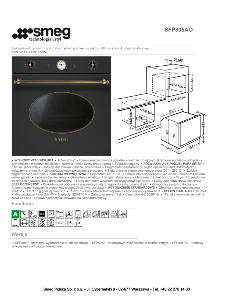 SFP805AO Piekarnik elektryczny z czyszczeniem pirolitycznym, wysokość: 60 cm, klasa A, zegar analogowy EAN13: 8017709184292 WZORNICTWO / OBSŁUGA Antracytowy* Sterowanie za pomocą pokręteł w kolorze mosiężnym (kremowe podkładki pokręteł) Wykończenie w kolorze mosiężnym (uchwyt, ramka szyby oraz zegara) Zegar analogowy ROZWIĄZANIA / FUNKCJE / PARAMETRY 6 funkcji pieczenia 2 funkcje dodatkowe: piroliza, eco-piroliza Programator elektroniczny: zegar, opóźniony start, automatyczne wyłączenie, minutnik Sygnał dźwiękowy zakończenia pieczenia Elektroniczne sterowanie temperaturą (50° – 280°C) Szybkie nagrzewanie piekarnika KOMORA WEWNĘTRZNA Pojemność netto: 70 l Emalia łatwoczyszcząca Ever Clean Ruchoma osłona górnej grzałki 5 poziomów pieczenia Oświetlenie wnętrza: 1 lampa halogenowa Metalowe drabinki boczne W pełni przeszklona wewnętrzna powierzchnia drzwi piekarnika Łatwy demontaż wewnętrznej szyby drzwi piekarnika Łatwy demontaż drzwi piekarnika BEZPIECZEŃSTWO Blokada drzwi podczas czyszczenia pirolitycznego 4 szyby, „zimne drzwi” Obwodowy system chłodzący Automatyczne wyłączenie elementów grzejnych po otwarciu drzwi WYPOSAŻENIE STANDARDOWE Głęboka blacha emaliowana (40 mm): 2 Ruszt do głębokiej blachy: 1 Ruszt: 2 Prowadnice teleskopowe z częściowym wysuwem: 1 SPECYFIKACJA TECHNICZNA Moc przyłączeniowa: 3,0 kW Napięcie: 220-240 V Zabezpieczenie: 13 A Częstotliwość: 50/60 Hz *Panel sterowania ze stali, a drzwi ze szkła - obydwa elementy lakierowane na kolor antracytowy. Functions Wersje SFP805P - kremowy, wykończenie w kolorze złotym wykończenie w kolorze mosiężnym SFP805A - antracytowy, wykończenie w kolorze złotym SFP805PO - kremowy, Smeg Polska Sp. z o.o. - ul. Cybernetyki 9 - 02-677 Warszawa - Tel. +48 22 276 14 00