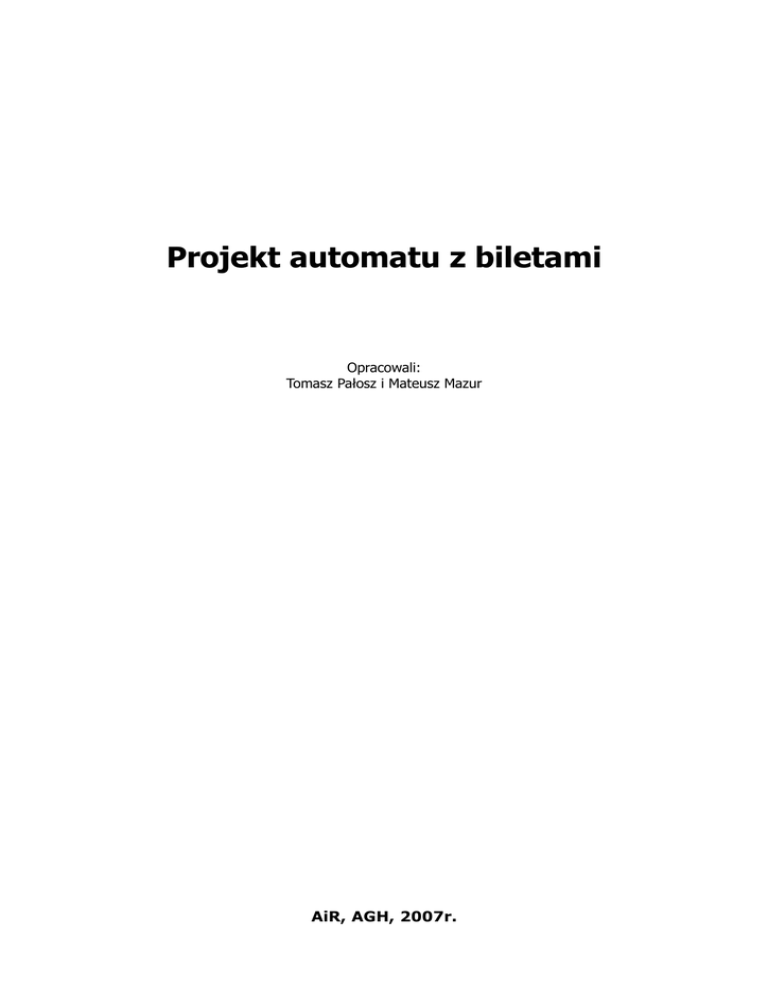Projekt automatu z biletami Opracowali: Tomasz Pałosz i Mateusz Mazur AiR, AGH, 2007r. 1. Diagram DFD: 2. Scenariusze użycia: Kupno biletu: 1. Wybranie przez użytkownika typu biletu (miejski, ulgowy, cały, godzinny). 2. Sprawdzenie jaka jest cena wybranego biletu. 3. Wywołanie przypadku użycia "Obsługa pieniędzy i drukowania". Wyświetl cene: 1. Wybranie przez użytkownika typu biletu (miejski, ulgowy, cały, godzinny). 2. Zaczęrpnięcie informacji z cennika o cenie biletu. 3. Wyświetlenie ceny biletu. Obsługa pieniędzy i drukowania: 1. Sprawdzenie czy użytkownik wrzucił odpowiednią kwote do automatu. 2. Wydanie reszty lub komunikat o błędzie (niewrzuceniu wystarczającej kwoty lub niemożliwości wydania reszty). 3. Jeśli nie było błędu to wydrukowanie biletu lub błąd (brak papieru lub tonera). 4. Jeśli był błąd (za wyjątkiem niewrzucenia wystarczającej kwoty) to powiadomienie o błędzie serwis. Serwis: 1. Zidentyfikowanie błędu. 2. Naprawienie błędu (dodanie lub odebranie odpowiednich monet, naprawa automatu, dodanie papieru lub tonera). 3. Zaktualizowanie danych o przeprowadzonych poprawkach serwisanta. Kontrola 1. Sprawdzenie danych o poprawkach serwisanta. 2. Sprawdzenie zgodności kwoty i poprawności przeprowadzonych operacji. 3.Widok procesowy Procesy: – obsługi intrface'u, służący do komunikacji z użytkownikiem/serwisantem – obsługi połączenia z bazą cen biletów – zarządzający funkcjami związanymi z przyjmowaniem pieniędzy, ich wydawaniem – obsługi drukowania biletów – rejestrujący wszelkie zmiany wprowadzane w bazach zasobów pieniężnych 4. Widok wdrożeniowy 5. Proponowana architektura Architektura zdarzeniowa - Event-based, Implicit Invocation Zdarzenia z zewnątrz: 1. wybranie biletu. 2. wrzucenie monet. 3. serwisowanie. 4. kontrola. 5. wciśnięcie wydania monet. Wybranie biletu. 1). pobranie ceny biletu z zewnętrznego systemu "Cennik". 2). wyświetlenie ceny na wyświetlaczu. 3). przekazanie, do obsługi pieniędzy, że wybrano bilet. (Wywołanie zdarzenia do obsługi pieniędzy i drukowania). Wrzucenie monet. 1). Sprawdzenie czy wrzucono odpowiednią kwotę. 2). Jeśli kwota jest większa o ceny biletu to sprawdzenie czy w automacie są monety do wydania reszty. Ewentualne wydanie reszty. 3). W przeciwnym przypadku wydrukowanie biletu jeśli jest papier oraz toner. Serwisowanie. 1). Zabranie monet z automatu. 2). Dołożenie monet, których jest mało. 3). Dołożenie tonera oraz papieru. 4). Wprowadzenie zmian do rejestru zmian w zasobniku. Kontrola. 1). Sprawdzenie czy aktualny stan automatu zgadza się ze stanem wyliczonym na podstawie rejestru zmian. 5. Struktura logiczna 6. Struktura implementacyjna