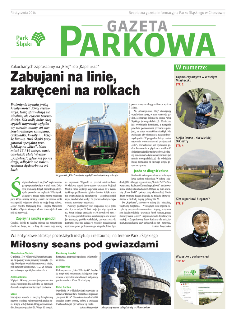 31 stycznia 2014 Bezpłatna gazeta informacyjna Parku Śląskiego w Chorzowie Zakochanych zapraszamy na „Elkę” i do „Kapelusza” W numerze: ZDJĘCIE: PARK ŚLĄSKI Zabujani na linie, zakręceni na rolkach Walentynki bywają próbą kreatywności. Kino, restauracja, teatr, sprawdzają się idealnie, ale czasem powszednieją. Dla osób, które chcą spędzić naprawdę wyjątkowy wieczór, mamy coś niepowtarzalnego: szampana, czekoladki, kwiaty i… kolejkę linową. Park Śląski przygotował specjalną przejażdżkę na „Elce”. Natomiast 15 i 16 lutego, warto odwiedzić Halę Wystaw „Kapelusz”, gdzie już po raz drugi, odbędzie się walentynkowa dyskoteka na rolkach. Ś Tajemniczy artysta w Wesołym Miasteczku STR. 2 potem rozsyłane drogą mailową – wylicza Mirek. Na „Walentynkową Elkę” obowiązują wcześniejsze zapisy, w tym rezerwacja godzin. Można tego dokonać na stronie Parku Śląskiego (www.parkslaski.pl). Konieczne jest wypełnienie formularza, a następnie przesłanie potwierdzenia przelewu za przejazd, na adres: [email protected]. Nie zwlekajcie, aby skorzystać z najdogodniejszych godzin. W przypadku dużego zainteresowania walentynkowymi przejazdami „Elki”, przewidywane jest wydłużenie godzin kursowania w piątek oraz możliwość dodania przejazdów także w sobotę. Będziemy informować o tym na wspomnianej już stronie www.parkslaski.pl, do odwiedzin której, niezależnie od lutowego święta, gorąco zachęcamy. Alejka Denso – dla Wielkiej Orkiestry STR. 4 Jazda na długość całusa W gondoli „Elki” możecie spędzić walentynkowy wieczór więto zakochanych na „Elce” to pierwsze tego typu przedsięwzięcie w skali kraju. Dołączy z pewnością do tych najbardziej nietypowych sposobów na spędzenie Walentynek. W czasie 45 minut, będzie można podziwiać park, który – mamy nadzieję – ukaże swe zimowe uroki oraz spędzić wyjątkowe chwile ze swoją drugą połową. „Elka” pojedzie tradycyjną trasą – między Stadionem Śląskim, a Śląskim Wesołym Miasteczkiem – jednak wolniej niż zazwyczaj. Zapisy na randkę w gondoli Gondola kolejki to idealne miejsce na romantyczne chwile we dwoje, ale… – Pary nie zawsze mają szansę na intymność. Wagoniki są przecież ośmioosobowe. O właściwy nastrój bywa trudno – przyznaje Wojciech Mirek z Parku Śląskiego. Zapewnia jednak, że w Walentynki tego problemu nie będzie – bowiem kolejka zostanie otwarta tylko dla zakochanych. – Do jednej gondoli wejdą zaledwie dwie osoby. Na pewno zadbamy o odpowiednią atmosferę – zapowiada. Pierwszy, podstawowy kurs rozpocznie się o godzinie 16, a ostatni po 20. Ilość miejsc jest więc ograniczona. Koszt jednego przejazdu to 50 złotych od pary. – W tej cenie, poza biletami za kurs kolejką w obie strony, jest szampan, pudełko czekoladek, czerwona róża dla partnerki oraz trzy zdjęcia w wysokiej rozdzielczości, wykonane przez profesjonalnego fotografa, które będą Bardzo ciekawie zapowiada się też walentynkowa odsłona rollkowiska. W sobotę i niedzielę (15 i 16 lutego) organizatorzy „Skate in Park” ze Stowarzyszenia Społeczno-Kulturalnego „Green”, zaplanowali moc atrakcji dla zakochanych. Odbędą się m.in. warsztaty „I love Rolki” i pokazy jazdy ekstremalnej. Gwoździem programu będzie dyskoteka na rolkach, która wystartuje w niedzielę, między godziną 18 a 22. Do „Kapelusza”, zarówno w sobotę jak i niedzielę, wejdziemy bezpłatnie. – W ubiegłym roku impreza cieszyła się sporym zainteresowaniem. Liczymy, że tym razem będzie podobnie – przyznaje Paweł Komosa, prezes stowarzyszenia „Green” i zapowiada wiele dodatkowych atrakcji. – Zorganizujemy liczne konkursy dla zakochanych, np. na długość jazdy całujących się par – zapewnia. Kim są parkowi biegacze? STR. 6 Łukasz Respondek Walentynkowe atrakcje pozostałych instytucji i restauracji na terenie Parku Śląskiego Planetarium Śląskie O godzinie 17, w Walentynki, Planetarium zaprasza na specjalny seans, połączony z muzyką i poezją. Obowiązuje wcześniejsza rezerwacja miejsc, pod numerem telefonu (32) 745 27 28 lub adresem mailowym: [email protected]. Zielona Dolina W piątek, 14 lutego, restauracja zaprasza na karaoke. Następnego dnia odbędzie się natomiast dyskoteka w rytm romantycznych przebojów. Łania Nastrojowy wieczór z muzyką fortepianową na żywo, to jedna z walentynkowych atrakcji Łani. Kolejną jest dyskoteka, którą poprowadzi didżej. Początek o godzinie 21. Wstęp: 10 złotych. Kamienny Kasztel Restauracja proponuje specjalne, walentynkowe menu. Leśniczówka Klub zaprasza na „Leśne Walentynki”. Pary będą mogły zjeść romantyczną kolację przy lampce wina, w specjalnie oświetlonych na tę okazję pomieszczeniach. Cena: 30 zł od pary. ZDJĘCIE: PARK ŚLĄSKI Miłosny seans pod gwiazdami Rebel Garden O godzinie 19, w klubokawiarni rozpocznie się zabawa w klimacie New Romantic, z dopiskiem „do granic kiczu”. Dla osób w strojach z lat 80. (tureckie swetry, pepegi, sofixy, a zwłaszcza trwała ondulacja), przewidziane są zniżki. Łukasz Respondek Muzyczny seans odbędzie się w Planetarium Wszystko o parku w sieci STR. 12 Rozmowa miesiąca 2 Charakterystyczna postać o cynicznym uśmiechu, wśród karuzel śląskiego lunaparku Sezon cały rok ZDJĘCIE: JAKUB NOWAK Szwedzki odwiedził Wesołe Miasteczko ZDJĘCIE: PARK ŚLĄSKI Na „Krzywych Lustrach” w Śląskim Wesołym Miasteczku pojawiła się znana postać. Jest cmentarzysko, krzesło elektryczne i jest on. Rozmawiam ze Szwedzkim, autorem postaci, która zagościła już na setkach murów w Polsce i za granicą. Artysta bardzo chroni swoją prawdziwą tożsamość, nawet do zdjęcia pozuje w masce. Ale na wywiad udało się go namówić. ARKADIUSZ GODLEWSKI, prezes Parku Śląskiego Rekordy kolejki E lka” nie zwalnia tempa. Zainteresowanie naszą starą – gruntownie odświeżoną atrakcją, przek