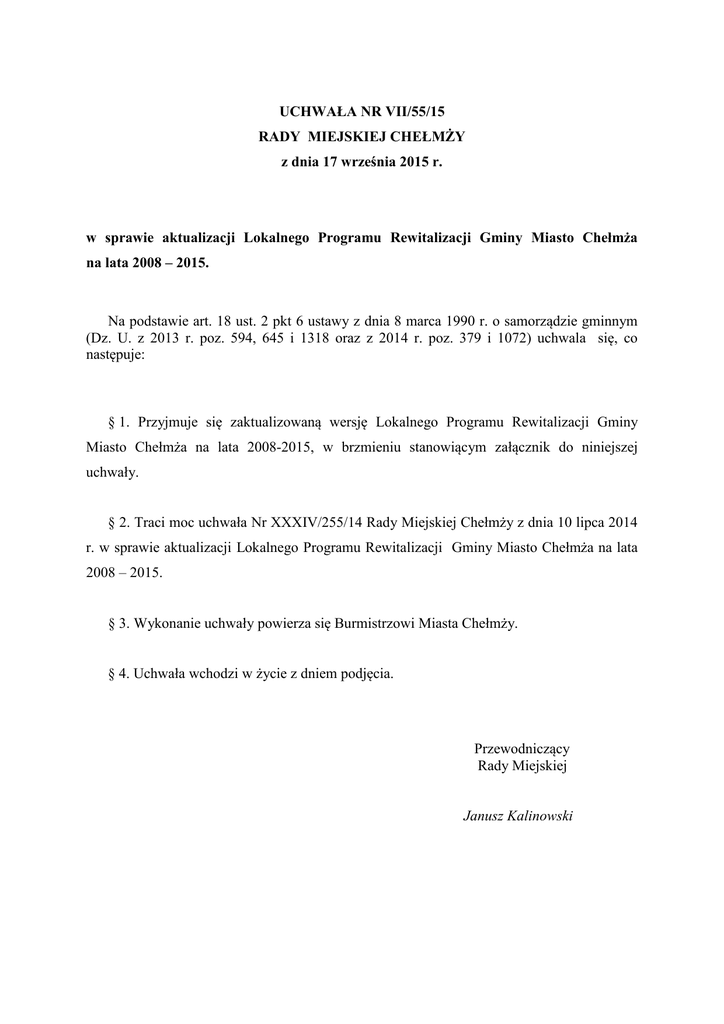 UCHWAŁA NR VII/55/15 RADY MIEJSKIEJ CHEŁMŻY z dnia 17 września 2015 r. w sprawie aktualizacji Lokalnego Programu Rewitalizacji Gminy Miasto Chełmża na lata 2008 – 2015. Na podstawie art. 18 ust. 2 pkt 6 ustawy z dnia 8 marca 1990 r. o samorządzie gminnym (Dz. U. z 2013 r. poz. 594, 645 i 1318 oraz z 2014 r. poz. 379 i 1072) uchwala się, co następuje: § 1. Przyjmuje się zaktualizowaną wersję Lokalnego Programu Rewitalizacji Gminy Miasto Chełmża na lata 2008-2015, w brzmieniu stanowiącym załącznik do niniejszej uchwały. § 2. Traci moc uchwała Nr XXXIV/255/14 Rady Miejskiej Chełmży z dnia 10 lipca 2014 r. w sprawie aktualizacji Lokalnego Programu Rewitalizacji Gminy Miasto Chełmża na lata 2008 – 2015. § 3. Wykonanie uchwały powierza się Burmistrzowi Miasta Chełmży. § 4. Uchwała wchodzi w życie z dniem podjęcia. Przewodniczący Rady Miejskiej Janusz Kalinowski Uzasadnienie do uchwały nr VII/55/15 Rady Miejskiej Chełmży z dnia 17 września 2015 r. w sprawie aktualizacji Lokalnego Programu Rewitalizacji Gminy Miasto Chełmża na lata 2008 – 2015. Zgodnie z przyjętym systemem zarządzania, monitorowania i ewaluacji, Lokalny Program Rewitalizacji Gminy Miasto Chełmża na lata 2008-2015 aktualizowany jest co najmniej raz w roku kalendarzowym, w oparciu o wnioski i zalecenia sformułowane na podstawie analizy przebiegu wdrażania działań rewitalizacyjnych. Systematyczne monitorowanie postępów realizacji poszczególnych zadań zaplanowanych w ramach Programu oraz sytuacji społeczno-ekonomicznej obszaru wskazanego do rewitalizacji, pozwala na wczesną identyfikację wszelkich trudności i potencjalnych zagrożeń dla urzeczywistnienia zakładanych rezultatów rewitalizacji. Aktualizacja Lokalnego Programu Rewitalizacji w kolejnych latach obowiązywania, umożliwia modyfikację i dostosowanie kierunków interwencji, w celu wyeliminowania lub zminimalizowania zdiagnozowanych problemów. Wszelkie zmiany dokonywane w Programie podporządkowano osiągnięciu jak najlepszych efektów podejmowanych działań i jak najszerszej realizacji celu głównego. Zmiana treści Programu, w brzmieniu stanowiącym załącznik do niniejszej uchwały, została opracowana z uwzględnieniem zaleceń i rekomendacji wskazanych w sprawozdaniu z realizacji Lokalnego Programu Rewitalizacji Gminy Miasto Chełmża na lata 2008-2015 w okresie od 01.01.2014 r. do 31.12.2014 r. Mając na uwadze informacje przedłożone w powyższym dokumencie, w ramach przedmiotowej aktualizacji Programu wprowadzono następujące zmiany: – zmodyfikowano listę przedsięwzięć realizowanych w ramach Programu, w zakresie wartości poszczególnych projektów oraz zastosowanego montażu finansowego. Powyższą zmianę ujęto zarówno w planie finansowym realizacji działań, jak również w załącznikach nr 3 oraz nr 6, – w celu zachowania przejrzystości dokumentu, przedsięwzięcia, których realizacja została całkowicie zakończona, przeniesiono na koniec wykazu projektów, – powyższą zmianę uwzględniono również w załącznikach nr 3 oraz nr 6, – treść załącznika nr 7 uzupełniono o streszczenie sprawozdania z realizacji Programu w okresie od 01.01.2014 r. do 31.12.2014 r. 1 Aktualizacja Lokalnego Programu Rewitalizacji została opracowana w oparciu o określoną dla przedmiotowego dokumentu metodologię monitorowania i wdrażania, zgodnie z Wytycznymi dotyczącymi przygotowania Lokalnego Programu Rewitalizacji, przyjętymi uchwałą nr 70/874/08 Zarządu Województwa Kujawsko-Pomorskiego z dnia 11 września 2008 r. wraz z późniejszymi zmianami oraz na podstawie innych obowiązujących przepisów prawa. Mając na uwadze powyższe, podjęcie przedmiotowej uchwały jest zasadne. 2
