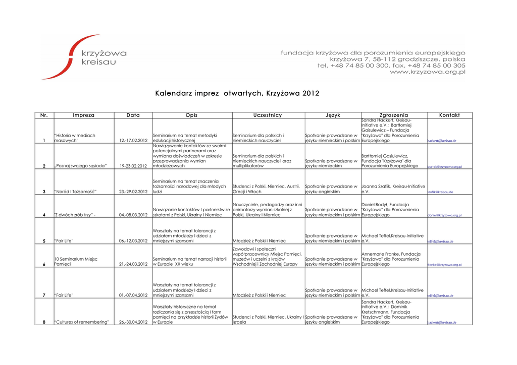 Kalendarz imprez otwartych, Krzyżowa 2012 Nr. 1 2 3 4 5 6 7 8 Impreza “Historia w mediach masowych” „Poznaj swojego sąsiada” “Naród I Tożsamość” "Z dwóch zrób trzy” - “Fair Life” 10 Seminarium Miejsc Pamięci “Fair Life” “Cultures of remembering” Data Opis Uczestnicy Język Zgłoszenia Seminarium dla polskich i niemieckich nauczycieli [email protected] Seminarium dla polskich i niemieckich nauczycieli oraz multiplikatorów Bartłomiej Gasiulewicz, Spotkanie prowadzone w Fundacja "Krzyżowa" dla języku niemieckim Porozumienia Europejskiego [email protected] Studenci z Polski, Niemiec, Austrii, Grecji i Włoch Spotkanie prowadzone w Joanna Szaflik, Kreisau-Initiative języku angielskim e.V. [email protected] 19-23.02.2012 Seminarium na temat metodyki edukacji historycznej Nawiązywanie kontaktów ze swoimi potencjalnymi partnerami oraz wymiana doświadczeń w zakresie przeprowadzania wymian młodzieżowych 23.-29.02.2012 Seminarium na temat znaczenia tożsamości narodowej dla młodych ludzi 04.-08.03.2012 Nauczyciele, pedagodzy oraz inni Daniel Bodył, Fundacja Nawiązanie kontaktów I partnerstw ze animatorzy wymian szkolnej z Spotkanie prowadzone w "Krzyżowa" dla Porozumienia szkołami z Polski, Ukrainy i Niemiec Polski, Ukrainy i Niemiec języku niemieckim i polskim Europejskiego 06.-12.03.2012 Warsztaty na temat tolerancji z udziałem młodzieży I dzieci z mniejszymi szansami Młodzież z Polski i Niemiec 21.-24.03.2012 Seminarium na temat narracji historii w Europie XX wieku Zawodowi i społeczni współpracownicy Miejsc Pamięci, Annemarie Franke, Fundacja muzeów i uczelni z krajów Spotkanie prowadzone w "Krzyżowa" dla Porozumienia Wschodniej i Zachodniej Europy języku niemieckim i polskim Europejskiego 01.-07.04.2012 Warsztaty na temat tolerancji z udziałem młodzieży I dzieci z mniejszymi szansami Młodzież z Polski i Niemiec 26.-30.04.2012 Warsztaty historyczne na temat rozliczania się z przeszłością I form pamięci na przykładzie historii Żydów w Europie Sandra Hackert, KreisauInitiative e.V.; Dominik Kretschmann, Fundacja Studenci z Polski, Niemiec, Ukrainy I Spotkanie prowadzone w "Krzyżowa" dla Porozumienia Izraela języku angielskim Europejskiego 12.-17.02.2012 Kontakt Sandra Hackert, KreisauInitiative e.V.; Bartłomiej Gaisulewicz – Fundacja Spotkanie prowadzone w "Krzyżowa" dla Porozumienia języku niemieckim i polskim Europejskiego [email protected] Spotkanie prowadzone w Michael Teffel,Kreisau-Initiative języku niemieckim i polskim e.V. [email protected] [email protected] Spotkanie prowadzone w Michael Teffel,Kreisau-Initiative języku niemieckim i polskim e.V. [email protected] [email protected] 9 “Local in Global: youth for sustainable countryside” 10 Trening “Model Krzyżowa – BASIC” 11 “Learn Democracy” - Basic Betzvata Trainig Course 12 „InterGenerationes” 13 Podróż studyjna Fundacji Freyi von Moltke-Stiftung dla Nowej Krzyżowej 14 „Europa-pierwszy gwizdek” wakacje z trąbką i piłką 15 16 „Jutro gramy dalej!” Trening „Model Krzyżowa – Arteterapia” 17 „My, dzieci Europy!” 18 „Fit for Mobility” 11.-18.05.2012 20.-25.05.2012 Aktywizacja młodzieży ze środowisk wiejskich w zgodzie z zasadami zrównoważonego rozwoju Młodzież w wieku 18-30 lat z terenów wiejskich z Polski, Niemiec, Czech, Słowacji, Ukrainy, Gruzji, Spotkanie prowadzone w Margret Kutschke, KreisauArmenii, Mołdowy i Danii języku angielskim Initiative e.V. [email protected] Zaprezentowanie różnych aspektów organizacji spotkań międzynarodowych z udziałem młodzieży defaworyzowanej/ niepełnosprawnej. Pracownicy i działacze młodzieżowi oraz pedagodzy specjalni, terapeuci i wychowawcy grup o szczególnych potrzebach, studenci zainteresowani rozwijaniem międzynarodowych młodzieżowych projektów Spotkanie prowadzone w inkluzyjnych. Uczestnicy z Polski, języku polskim, niemieckim Dominik Mosiczuk, KreisauNiemiec, Austrii i Czech i czeskim Initiative e.V. [email protected] 28.05.-03.06.2012 Poznawanie metod demokratycznego Nauczyciele i multiplikatorzy z wspólnego życia (Betzvata) w Polski, Niemiec, Rumunii, Danii i społeczeństwie Turcji Spotkanie prowadzone w Nina Lüders,Kreisau-Initiative języku angielskim. e.V. 24.-29.05.2012 Wymiany doświadczeń na temat znaczenia historii w życiu osobistym i jej Uczestnicy w wieku 19 - 99 lat z ogólnoludzkiego wymiaru. różnych krajów Europy Spotkanie prowadzone w języku polskim, niemieckim Michael Teffel,Kreisau-Initiative i angielskim e.V.; [email protected] 25.-28.05.2012 Warsztaty na temat historii Krzyżowej Partnerzy i przyjaciele Krzyżowej Esther Reichert, Fundacja Freya Spotkanie prowadzone w von Moltke-Stiftung dla Nowej języku niemieckim Krzyżowej 03.-10.06.2012 Warsztaty muzyczne i sportowe -doskonalenie gry na instrumentach dętych oraz w piłkę nożną Spotkanie prowadzone w Adelajda Lebioda, Fundacja Dzieci z Polski, Niemiec i Ukrainy w języku niemieckim, polskim "Krzyżowa" dla Porozumienia wieku 10-16 lat i ukraińskim Europejskiego [email protected] Młodzież z Polski, Niemiec i Ukrainy Spotkanie prowadzone w Dominik Mosiczuk, Kreisauw wieku 18-25 lat języku polskim i niemieckim Initiative e.V. [email protected] Pracownicy i działacze młodzieżowi oraz pedagodzy specjalni, terapeuci i wychowawcy grup o szczególnych potrzebach, studenci zainteresowani rozwijaniem międzynarodowych młodzieżowych projektów Spotkanie prowadzone w inkluzyjnych. Uczestnicy z Polski, języku polskim, niemieckim Dominik Mosiczuk, KreisauNiemiec, Austrii i Czech i czeskim Initiative e.V. [email protected] 10.-17.06.2012 25.-29.06.2012 Polsko-niemiecko-ukraiński projekt młodzieżowy na temat zrównoważonego rozwoju w kontekście EURO2012. Nawiązanie kontaktów oraz wymiana doświadczeń między multiplikatorami. Zaprezentowanie najlepszych praktyk z wykorzystania sztuki jako formy pracy z młodzieżą w ramach projektów z udziałem o