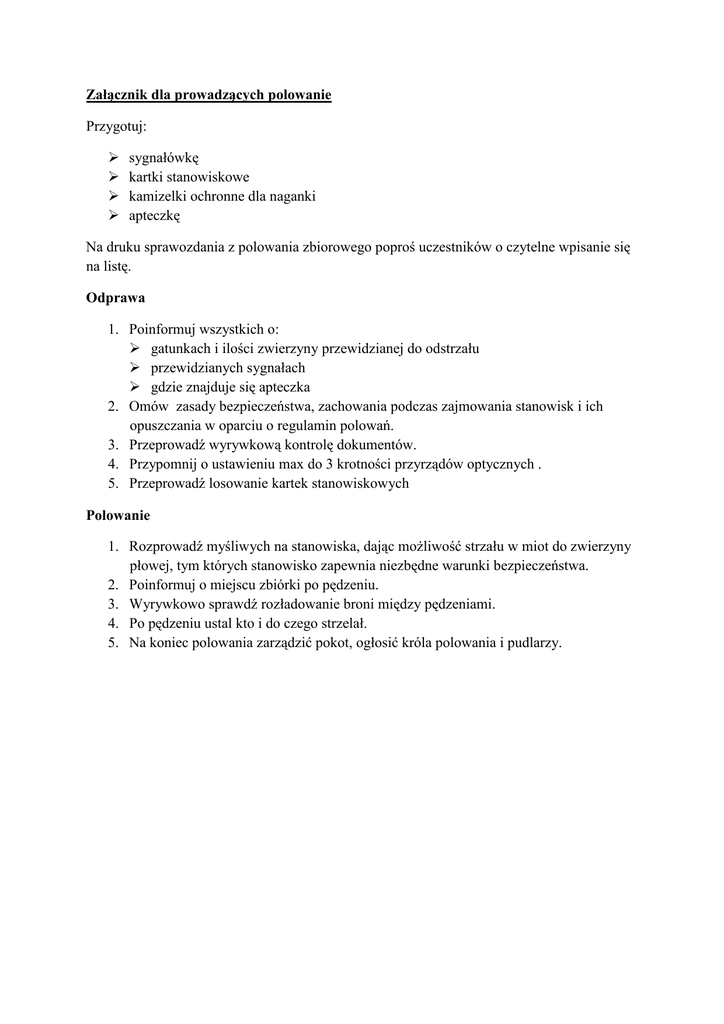Załącznik dla prowadzących polowanie Przygotuj: sygnałówkę kartki stanowiskowe kamizelki ochronne dla naganki apteczkę Na druku sprawozdania z polowania zbiorowego poproś uczestników o czytelne wpisanie się na listę. Odprawa 1. Poinformuj wszystkich o: gatunkach i ilości zwierzyny przewidzianej do odstrzału przewidzianych sygnałach gdzie znajduje się apteczka 2. Omów zasady bezpieczeństwa, zachowania podczas zajmowania stanowisk i ich opuszczania w oparciu o regulamin polowań. 3. Przeprowadź wyrywkową kontrolę dokumentów. 4. Przypomnij o ustawieniu max do 3 krotności przyrządów optycznych . 5. Przeprowadź losowanie kartek stanowiskowych Polowanie 1. Rozprowadź myśliwych na stanowiska, dając możliwość strzału w miot do zwierzyny płowej, tym których stanowisko zapewnia niezbędne warunki bezpieczeństwa. 2. Poinformuj o miejscu zbiórki po pędzeniu. 3. Wyrywkowo sprawdź rozładowanie broni między pędzeniami. 4. Po pędzeniu ustal kto i do czego strzelał. 5. Na koniec polowania zarządzić pokot, ogłosić króla polowania i pudlarzy.