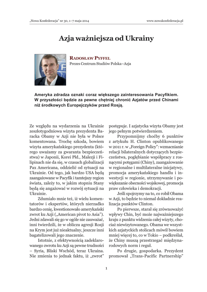 „Nowa Konfederacja” nr 30, 1–7 maja 2014 www.nowakonfederacja.pl Azja ważniejsza od Ukrainy RAdosłAw Pyffel Prezes Centrum Studiów Polska–Azja Ameryka zdradza oznaki coraz większego zainteresowania Pacyfikiem. W przyszłości będzie za pewne chętniej chronić Azjatów przed Chinami niż środkowych Europejczyków przed Rosją. Ze względu na wydarzenia na Ukrainie zeszłotygodniowa wizyta prezydenta Baracka Obamy w Azji nie była w Polsce komentowana. Trochę szkoda, bowiem wizyta amerykańskiego prezydenta (którego uważamy za gwaranta bezpieczeństwa) w Japonii, Korei Płd., Malezji i Filipinach nie da się, w czasach globalizacji Pax Americana, oddzielić od sytuacji na Ukrainie. Od tego, jak bardzo USA będą zaangażowane w Pacyfik i tamtejszy region świata, zależy to, w jakim stopniu Stany będą się angażować w rozwój sytuacji na Ukrainie. Zdumiało mnie też, iż wielu komentatorów i ekspertów, których nierzadko bardzo cenię, kwestionowało amerykański zwrot ku Azji („American pivot to Asia”). Jedni zdawali się go w ogóle nie zauważać, inni twierdzili, że w obliczu agresji Rosji na Krym jest już nieaktualny, jeszcze inni bagatelizowali jego znaczenie. Istotnie, z efektywnością zadeklarowanego zwrotu ku Azji są pewne trudności – Syria, Bliski Wschód, teraz Ukraina. Nie zmienia to jednak faktu, iż „zwrot” postępuje. I azjatycka wizyta Obamy jest jego pełnym potwierdzeniem. Przypomnijmy choćby 6 punktów z artykułu H. Clinton opublikowanego w 2011 r. w „Foreign Policy”: wzmacnianie relacji bilateralnych dotyczących bezpieczeństwa, pogłębianie współpracy z rosnącymi potęgami (Chiny), zaangażowanie w regionalne i multilateralne inicjatywy, promocja amerykańskiego handlu i inwestycji w regionie, utrzymywanie i powiększanie obecności wojskowej, promocja praw człowieka i demokracji. Jeśli spojrzymy na to, co robił Obama w Azji, to będzie to niemal dokładnie realizacja punktów Clinton. Po pierwsze, starał się zrównoważyć wpływy Chin, być może najważniejszego kraju z punktu widzenia całej wizyty, chociaż niewizytowanego. Obama we wszystkich azjatyckich stolicach mówił bowiem mniej więcej to, co w Tokio – podkreślał, że Chiny muszą przestrzegać międzynarodowych norm i reguł. Po drugie, gospodarka. Prezydent promował „Trans-Pacific Partnership” 1 „Nowa Konfederacja” nr 30, 1–7 maja 2014 www.nowakonfederacja.pl (Partnerstwo Transpacyficzne) – regionalną organizację multilateralną wykluczającą Chiny. Obama zapewniał przy tym sojuszników, zwłaszcza Japonię, że USA są obecne w regionie („Ameryka jest i będzie krajem Pacyfiku”). Promował też współpracę ekonomiczną. Choć republikańska opozycja oskarżała go, iż skończy się jedynie na deklaracjach. Po trzecie, podniesienie morale stacjonujących wojsk poprzez wizyty w bazach i spotkania z żołnierzami (mogą być potrzebni). Niepokojący może być naturalnie także fakt, iż Amerykanie zredukowali budżet obronny o blisko 7 proc. Należy jednak pamiętać, że w najmniejszym stopniu ta redukcja osłabi ich na Dalekim Wschodzie. Ewidentnie widać natomiast, że będzie im bardzo trudno grać na dwa fronty (tj. w Europie i w Azji, nie mówiąc o Bliskim Wschodzie czy innych regionach świata). Po czwarte, nastąpiła przełomowa wizyta w Malezji, która została wyśmiana przez Joshuę Kurlantzicka jako bezsensowna. Zdaniem tego wpływowego komentatora Malezja nie nadaje się do TPP, nie chce się reformować, w dodatku łamie prawa człowieka, np. wtrącając do więzienia lidera opozycji pod pretekstem… sodomii. Tyle tylko, że w czasach „zwrotu” pozyskanie sojusznika w regionie czy nawet zapewnienie sobie życzliwej neutralności danego kraju mogą być na wagę złota. Amerykanie już dokonali rewolucyjnej zmiany w swojej polityce wobec Birmy, która po kilkudziesięciu latach izolacji przez Zachód niebezpiecznie zbliżyła się do Chin. Teraz mogą zrobić to samo w stosunku do Malezji, przymykając przy tym oko na pewne „niedostatki”. Niedawno wszak doszło do pierwszej w historii wizyty prezydenta USA w Birmie, a w Malezji do pierwszej od lat pięćdziesięciu. Patrząc na całą sprawę z perspektywy polskiej, nie należy popadać w panikę. Z pewnością nie mamy do czynienia ze „scenariuszem dezintegracyjnym” (nazwa pochodzi z Białej Księgi BBN), w którym w kwestii bezpieczeństwa Polska byłaby zdana wyłącznie na siebie. Ameryka to gwarant naszego bezpieczeństwa i nadal jest hegemonem. Zdradza jednak coraz większe zainteresowanie Pacyfikiem. Może to oznaczać, iż w perspektywie dekady czy dwóch nie będzie w stanie angażować się zbytnio w wydarzenia w Europie Centralnej. Azja jest dużo atrakcyjniejsza, a jej konsumenci mają znacznie zasobniejsze portfele. Kupią i zapłacą za amerykańskie produkty więcej niż środkowi europejczycy Powody, dla których Amerykanie będą bardziej chcieli współpracować z Azjatami i chronić ich przed Chinami, a nie środkowych Europejczyków przed Rosją, są dwa: Pierwszy to taki, że Rosja, nawet jeśli utrzyma status mocarstwa, będzie mocarstwem wagi średniej, które nigdy nie będzie w stanie zagrozić hegemonii Ameryki. Jeśli zaś Chiny uporają się z problemami wewnętrznymi, ich potencjał skazuje je wręcz na rywalizację z USA. Drugi powód to coraz liczniejsza, bogatsza i dynamicznie rozwijająca się azjatycka klasa średnia. Myśląc o amerykańskim eksporcie i inwestycjach, nie 2 „Nowa Konfederacja” nr 30, 1–7 maja 2014 www.nowakonfederacja.pl sposób nie zauważyć, że Azja jest dużo atrakcyjniejsza, a jej konsumenci mają znacznie zasobniejsze portfele. By zrozu- mieć dynamikę wydarzeń na Ukrainie, warto więc czasami obejrzeć coś więcej niż tylko kolejną relację ze Słowiańska. 3