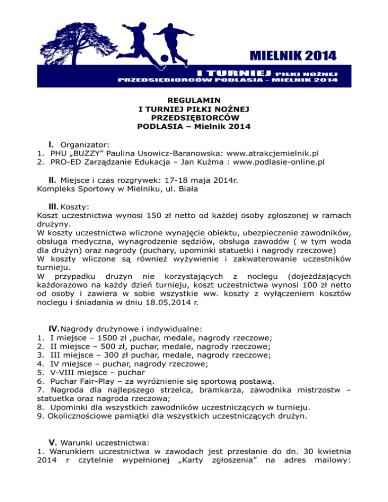 REGULAMIN I TURNIEJ PIŁKI NOŻNEJ PRZEDSIĘBIORCÓW PODLASIA – Mielnik 2014 I. Organizator: 1. PHU „BUZZY” Paulina Usowicz-Baranowska: www.atrakcjemielnik.pl 2. PRO-ED Zarządzanie Edukacja – Jan Kuźma : www.podlasie-online.pl II. Miejsce i czas rozgrywek: 17-18 maja 2014r. Kompleks Sportowy w Mielniku, ul. Biała III. Koszty: Koszt uczestnictwa wynosi 150 zł netto od każdej osoby zgłoszonej w ramach drużyny. W koszty uczestnictwa wliczone wynajęcie obiektu, ubezpieczenie zawodników, obsługa medyczna, wynagrodzenie sędziów, obsługa zawodów ( w tym woda dla drużyn) oraz nagrody (puchary, upominki statuetki i nagrody rzeczowe) W koszty wliczone są również wyżywienie i zakwaterowanie uczestników turnieju. W przypadku drużyn nie korzystających z noclegu (dojeżdżających każdorazowo na każdy dzień turnieju, koszt uczestnictwa wynosi 100 zł netto od osoby i zawiera w sobie wszystkie ww. koszty z wyłączeniem kosztów noclegu i śniadania w dniu 18.05.2014 r. IV. Nagrody drużynowe i indywidualne: 1. I miejsce – 1500 zł ,puchar, medale, nagrody rzeczowe; 2. II miejsce – 500 zł, puchar, medale, nagrody rzeczowe; 3. III miejsce – 300 zł puchar, medale, nagrody rzeczowe; 4. IV miejsce – puchar, nagrody rzeczowe; 5. V-VIII miejsce – puchar 6. Puchar Fair-Play – za wyróżnienie się sportową postawą. 7. Nagroda dla najlepszego strzelca, bramkarza, zawodnika mistrzostw – statuetka oraz nagroda rzeczowa; 8. Upominki dla wszystkich zawodników uczestniczących w turnieju. 9. Okolicznościowe pamiątki dla wszystkich uczestniczących drużyn. V. Warunki uczestnictwa: 1. Warunkiem uczestnictwa w zawodach jest przesłanie do dn. 30 kwietnia 2014 r czytelnie wypełnionej „Karty zgłoszenia” na adres mailowy: [email protected] oraz uregulowanie należności związanych ze zgłoszeniem drużyny na konto nr: 08 2030 0045 1110 0000 0202 4060 2. Karta zgłoszenia jest integralną częścią regulaminu. 3. Każdy przedsiębiorca może zgłosić od 6 do 12 zawodników w ramach jednej drużyny. 4. Każdy przedsiębiorca może zgłosić dowolna ilość osób towarzyszących (kierownik drużyny, trener, kibice). 5. Imienny skład drużyny należy przesłać do 7 dni przed turniejem, na dostarczonym przez organizatora formularzu. 6. Korekta ilości zgłoszonych osób do turnieju może być dokonana do siedmiu dni przed turniejem. Korektę należy dokonać poprzez przesłanie nowej „Karty zgłoszenia” z wpisaną odpowiednią ilością osób. 7. W turnieju mogą brać udział tylko pracownicy danego przedsiębiorstwa, którzy zatrudnieni są na umowę o pracę. Skład drużyny musi być zatwierdzony przez dyrektora/prezesa/właściciela/władze firmy, z którego wywodzi się kapitan drużyny. 7a) Możliwe jest wystawienie drużyny w skład której wchodzi kilku przedsiębiorców. 8. W turnieju nie mogą występować zawodnicy grający w ekstraklasie, I,II, III i IV lidze. Pod uwagę brana jest trwająca lub ostatnia przed turniejem runda rozgrywkowa. 9. Organizator dokona weryfikacji zawodników w kontekście ew. przynależności klubowej, na podstawie przesłanych składów drużyn. 10. Uczestnicy podczas turnieju, mają obowiązek posiadania dowodu osobistego lub innego dokumentu tożsamości. 11. Zawodnicy muszą w czasie trwania zawodów, na prośbę organizatora okazać dowód osobisty lub inny dokument tożsamości. Sprawdzenie dokumentów tożsamości odbywa się na prośbę zainteresowanej ekipy przeciwnej, wyłącznie przed rozpoczęciem danego spotkania. Zawodnik, który nie posiada dokumentu tożsamości nie może uczestniczyć w zawodach do końca turnieju. 12. Organizator ma prawo do weryfikacji zawodników i zdyskwalifikowania drużyny w każdej fazie zawodów w przypadku stwierdzenia próby naruszenia regulaminu dotyczącego przynależności do klubów, o których mowa w pkt. 9. VI. Dane organizacyjne: 1. Organizator zapewnia sędziowanie turnieju przez Kolegium Sędziów Podlaskiego Związku Piłki Nożnej. 2. Drużyna ma prawo do wycofania swojego udziału z turnieju na 14 dni przed jego rozpoczęciem pod warunkiem pisemnego powiadomienia o tym fakcie organizatora. W związku z wycofaniem się z zawodów w terminie zgodnym z regulaminem, firma nie ponosi żadnych konsekwencji finansowych, a organizator zwraca opłatę do 14 dni od daty rozegrania turnieju. 3. Wszyscy uczestnicy ubezpieczeni są od nieszczęśliwych wypadków. Ubezpieczenie obejmuje czas trwania zawodów. 4. Organizator zapewnia pierwszą pomoc medyczną przy urazach powstałych w czasie gry. 5. Organizator nie ponosi żadnej odpowiedzialności za udział w zawodach osób chorych i wynikające z tego tytułu wypadki i ich skutki. 6. Każdy zespół zobowiązany jest do wystąpienia w zawodach w jednolitych, numerowanych koszulkach. VII. System rozgrywek: 1. Dokładny system rozgrywek opracowany zostanie po zamknięciu listy zgłoszeń i zostanie przesłany do kierowników uczestniczących drużyn na tydzień przed zawodami. 2. Organizatorzy przewidują w pierwszym dniu zawodów rozgrywki w grupach systemem każdy z każdym. 3. W drugim dniu zawodów organizatorzy przewidują II rundę turnieju głównego oraz fazę finałową mistrzostw. Drużyny, które po pierwszym dniu turnieju nie zakwalifikują się do II rundy turnieju głównego, rozegrają w drugim dniu mecze o „Puchar Pocieszenia Mistrzostw”. 4. O ostatecznej kolejności decyduje ilość zdobytych punktów, wynik bezpośredniego spotkania między zainteresowanymi drużynami (ew. dodatkowa tabela pomocnicza między zainteresowanymi drużynami, w razie większej ilości drużyn z taka samą ilością punktów), stosunek bramek, większa ilość zdobytych bramek lub losowanie. W drugiej rundzie turnieju przy równej liczbie punktów, stosunku meczów i bramek, o kolejności w grupie decyduje wyższe miejsce zajęte przez drużynę w pierwszej fazie rozgrywek i dopiero losowanie. 5. Organizator ma prawo do ustaleni