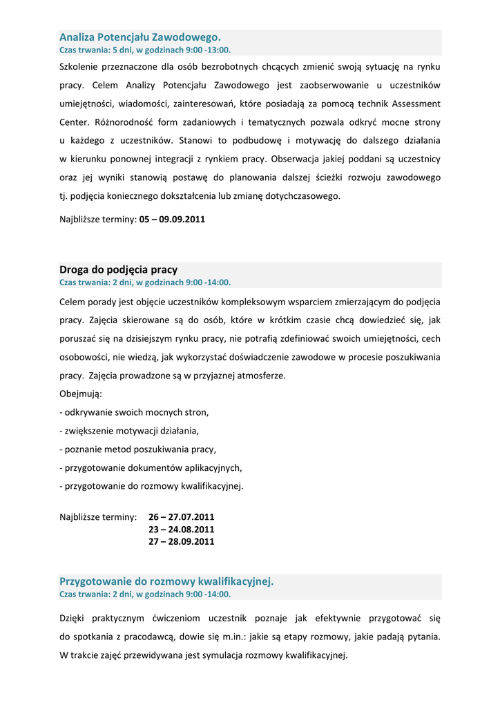 Analiza Potencjału Zawodowego. Czas trwania: 5 dni, w godzinach 9:00 -13:00. Szkolenie przeznaczone dla osób bezrobotnych chcących zmienić swoją sytuację na rynku pracy. Celem Analizy Potencjału Zawodowego jest zaobserwowanie u uczestników umiejętności, wiadomości, zainteresowań, które posiadają za pomocą technik Assessment Center. Różnorodność form zadaniowych i tematycznych pozwala odkryć mocne strony u każdego z uczestników. Stanowi to podbudowę i motywację do dalszego działania w kierunku ponownej integracji z rynkiem pracy. Obserwacja jakiej poddani są uczestnicy oraz jej wyniki stanowią postawę do planowania dalszej ścieżki rozwoju zawodowego tj. podjęcia koniecznego dokształcenia lub zmianę dotychczasowego. Najbliższe terminy: 05 – 09.09.2011 Droga do podjęcia pracy Czas trwania: 2 dni, w godzinach 9:00 -14:00. Celem porady jest objęcie uczestników kompleksowym wsparciem zmierzającym do podjęcia pracy. Zajęcia skierowane są do osób, które w krótkim czasie chcą dowiedzieć się, jak poruszać się na dzisiejszym rynku pracy, nie potrafią zdefiniować swoich umiejętności, cech osobowości, nie wiedzą, jak wykorzystać doświadczenie zawodowe w procesie poszukiwania pracy. Zajęcia prowadzone są w przyjaznej atmosferze. Obejmują: - odkrywanie swoich mocnych stron, - zwiększenie motywacji działania, - poznanie metod poszukiwania pracy, - przygotowanie dokumentów aplikacyjnych, - przygotowanie do rozmowy kwalifikacyjnej. Najbliższe terminy: 26 – 27.07.2011 23 – 24.08.2011 27 – 28.09.2011 Przygotowanie do rozmowy kwalifikacyjnej. Czas trwania: 2 dni, w godzinach 9:00 -14:00. Dzięki praktycznym ćwiczeniom uczestnik poznaje jak efektywnie przygotować się do spotkania z pracodawcą, dowie się m.in.: jakie są etapy rozmowy, jakie padają pytania. W trakcie zajęć przewidywana jest symulacja rozmowy kwalifikacyjnej. Celem szkolenia jest również pozyskanie informacji na temat zasad nawiązywania i podtrzymywania kontaktów, aktywnego słuchania, udzielania informacji zwrotnych, odczytywania mowy ciała oraz przezwyciężania barier komunikacyjnych. Najbliższe terminy: 20 – 21.07.2011 09 – 10.08.2011 14 – 15.09.2011 Przygotowanie do spotkania z pracodawcą. Czas trwania: 3 dni, w godzinach 9:00 -14:00. Zajęcia są adresowane do osób, które pragną zaznajomić się z technikami rekrutacji i selekcji stosowanymi przez firmy. Podczas warsztatu zostaną omówione podstawowe rodzaje i etapy rekrutacji oraz kilka najczęściej stosowanych metod selekcji: analiza dokumentów aplikacyjnych, wywiad telefoniczny, i kwestionariusze. Najbliższe terminy: 02 – 04.08.2011 20 – 22.09.2011 rozmowa kwalifikacyjna, obserwacja, testy