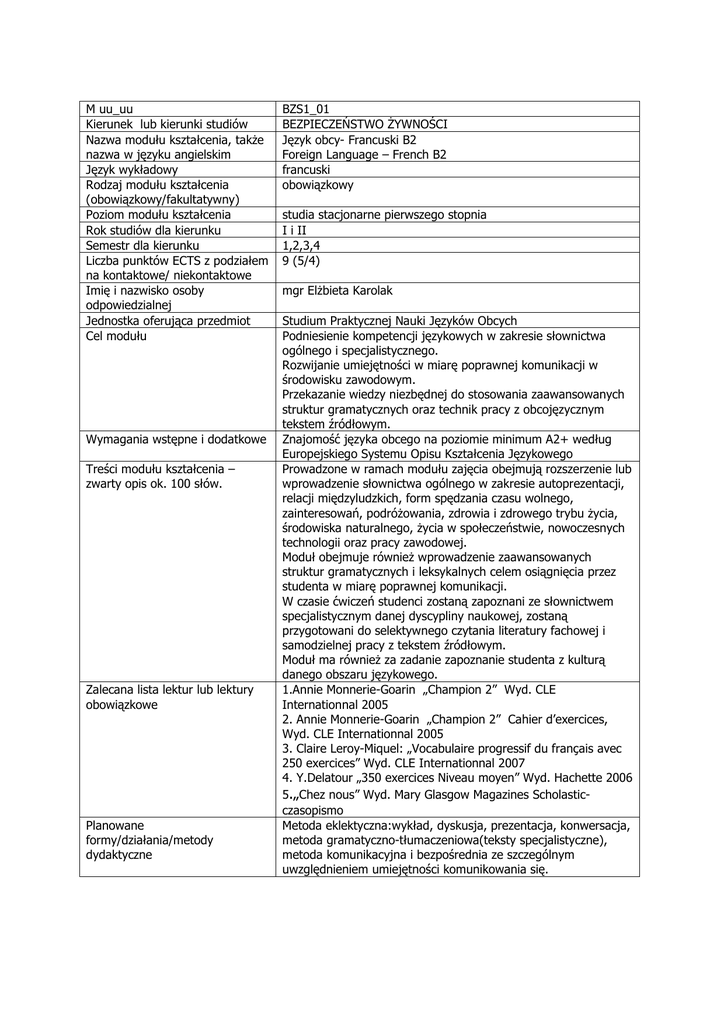 M uu_uu Kierunek lub kierunki studiów Nazwa modułu kształcenia, także nazwa w języku angielskim Język wykładowy Rodzaj modułu kształcenia (obowiązkowy/fakultatywny) Poziom modułu kształcenia Rok studiów dla kierunku Semestr dla kierunku Liczba punktów ECTS z podziałem na kontaktowe/ niekontaktowe Imię i nazwisko osoby odpowiedzialnej Jednostka oferująca przedmiot Cel modułu Wymagania wstępne i dodatkowe Treści modułu kształcenia – zwarty opis ok. 100 słów. Zalecana lista lektur lub lektury obowiązkowe Planowane formy/działania/metody dydaktyczne BZS1_01 BEZPIECZEŃSTWO ŻYWNOŚCI Język obcy- Francuski B2 Foreign Language – French B2 francuski obowiązkowy studia stacjonarne pierwszego stopnia I i II 1,2,3,4 9 (5/4) mgr Elżbieta Karolak Studium Praktycznej Nauki Języków Obcych Podniesienie kompetencji językowych w zakresie słownictwa ogólnego i specjalistycznego. Rozwijanie umiejętności w miarę poprawnej komunikacji w środowisku zawodowym. Przekazanie wiedzy niezbędnej do stosowania zaawansowanych struktur gramatycznych oraz technik pracy z obcojęzycznym tekstem źródłowym. Znajomość języka obcego na poziomie minimum A2+ według Europejskiego Systemu Opisu Kształcenia Językowego Prowadzone w ramach modułu zajęcia obejmują rozszerzenie lub wprowadzenie słownictwa ogólnego w zakresie autoprezentacji, relacji międzyludzkich, form spędzania czasu wolnego, zainteresowań, podróżowania, zdrowia i zdrowego trybu życia, środowiska naturalnego, życia w społeczeństwie, nowoczesnych technologii oraz pracy zawodowej. Moduł obejmuje również wprowadzenie zaawansowanych struktur gramatycznych i leksykalnych celem osiągnięcia przez studenta w miarę poprawnej komunikacji. W czasie ćwiczeń studenci zostaną zapoznani ze słownictwem specjalistycznym danej dyscypliny naukowej, zostaną przygotowani do selektywnego czytania literatury fachowej i samodzielnej pracy z tekstem źródłowym. Moduł ma również za zadanie zapoznanie studenta z kulturą danego obszaru językowego. 1.Annie Monnerie-Goarin „Champion 2” Wyd. CLE Internationnal 2005 2. Annie Monnerie-Goarin „Champion 2” Cahier d’exercices, Wyd. CLE Internationnal 2005 3. Claire Leroy-Miquel: „Vocabulaire progressif du français avec 250 exercices” Wyd. CLE Internationnal 2007 4. Y.Delatour „350 exercices Niveau moyen” Wyd. Hachette 2006 5.„Chez nous” Wyd. Mary Glasgow Magazines Scholasticczasopismo Metoda eklektyczna:wykład, dyskusja, prezentacja, konwersacja, metoda gramatyczno-tłumaczeniowa(teksty specjalistyczne), metoda komunikacyjna i bezpośrednia ze szczególnym uwzględnieniem umiejętności komunikowania się.