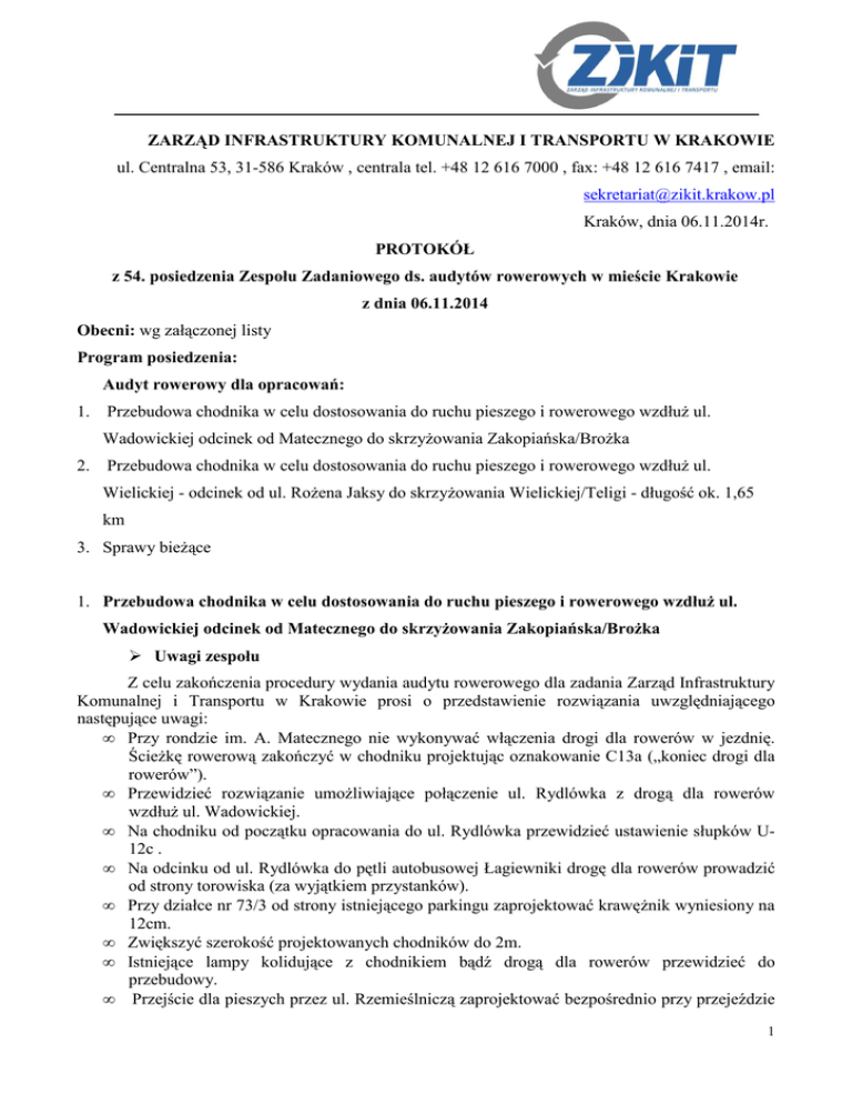 ZARZĄD INFRASTRUKTURY KOMUNALNEJ I TRANSPORTU W KRAKOWIE ul. Centralna 53, 31-586 Kraków , centrala tel. +48 12 616 7000 , fax: +48 12 616 7417 , email: [email protected] Kraków, dnia 06.11.2014r. PROTOKÓŁ z 54. posiedzenia Zespołu Zadaniowego ds. audytów rowerowych w mieście Krakowie z dnia 06.11.2014 Obecni: wg załączonej listy Program posiedzenia: Audyt rowerowy dla opracowań: 1. Przebudowa chodnika w celu dostosowania do ruchu pieszego i rowerowego wzdłuż ul. Wadowickiej odcinek od Matecznego do skrzyżowania Zakopiańska/Brożka 2. Przebudowa chodnika w celu dostosowania do ruchu pieszego i rowerowego wzdłuż ul. Wielickiej - odcinek od ul. Rożena Jaksy do skrzyżowania Wielickiej/Teligi - długość ok. 1,65 km 3. Sprawy bieżące 1. Przebudowa chodnika w celu dostosowania do ruchu pieszego i rowerowego wzdłuż ul. Wadowickiej odcinek od Matecznego do skrzyżowania Zakopiańska/Brożka Uwagi zespołu Z celu zakończenia procedury wydania audytu rowerowego dla zadania Zarząd Infrastruktury Komunalnej i Transportu w Krakowie prosi o przedstawienie rozwiązania uwzględniającego następujące uwagi: • Przy rondzie im. A. Matecznego nie wykonywać włączenia drogi dla rowerów w jezdnię. Ścieżkę rowerową zakończyć w chodniku projektując oznakowanie C13a („koniec drogi dla rowerów”). • Przewidzieć rozwiązanie umożliwiające połączenie ul. Rydlówka z drogą dla rowerów wzdłuż ul. Wadowickiej. • Na chodniku od początku opracowania do ul. Rydlówka przewidzieć ustawienie słupków U12c . • Na odcinku od ul. Rydlówka do pętli autobusowej Łagiewniki drogę dla rowerów prowadzić od strony torowiska (za wyjątkiem przystanków). • Przy działce nr 73/3 od strony istniejącego parkingu zaprojektować krawężnik wyniesiony na 12cm. • Zwiększyć szerokość projektowanych chodników do 2m. • Istniejące lampy kolidujące z chodnikiem bądź drogą dla rowerów przewidzieć do przebudowy. • Przejście dla pieszych przez ul. Rzemieślniczą zaprojektować bezpośrednio przy przejeździe 1 rowerowym. • W obrębie przystanków ścieżkę prowadzić za wiatą z zastosowaniem 3 przęseł wygrodzeń typu bariero-siedzisk. Na przystanku Łagiewniki ścieżkę prowadzić za wiatą a wygrodzenie zastosować od granicy działek nr 136/19 i 128/2 do granicy działki nr 219. Od granicy działki nr 219 prowadzić wspólny ciąg pieszo-rowerowy. Bezpośrednio przed przejazdem rowerowym przewidzieć wykonanie fragmentu wydzielonej ścieżki rowerowej. • Nawierzchnie wydzielonej drogi rowerowej w obrębie przystanków projektować w kolorze czerwonym. • Przewidzieć przestawienie istniejących stojaków rowerowych zlokalizowanych przy chodniku w obrębie pętli Łagiewniki. • Sprawdzić czy projektowane przejścia w obrębie pętli Łagiewniki nie znajdują się w obrębie zwrotnic. • Na przejazdach rowerowych zaprojektować krawężnik obniżony do 0cm w stosunku do poziomu nawierzchni. W przypadku, gdy przy krawężniku zlokalizowany jest ściek w projekcie przewidzieć wyprofilowanie ostrej krawędzi krawężnika, tak aby w miejscu styku ścieku i krawężnika nie było uskoku. • Zapewnić zachowanie 0,5m skrajni dla drogi dla rowerów. Na planie sytuacyjnym przedstawić wymiary pokazujące zachowanie skrajni przy przeszkodach punktowych m.in. latarniach, podporach reklam. • W projekcie przedstawić szczegóły konstrukcyjne przekroczenia torowiska drogą rowerową oraz chodnikiem. • W opisie technicznym i na przekrojach konstrukcyjnych zawrzeć zapis o konieczności mechanicznego wbudowania nawierzchni ścieżki rowerowej. Uwagi mieszkańców 1) krawężniki na przejazdach rowerowych należy projektować na 0cm, legenda na planie sytuacyjnym przewiduje obniżenie krawężników do +2cm tylko na przejściach dla pieszych, krawężnik na wjeździe z ul. Wadowickiej na ddr projektować również na 0cm 2) plan sytuacyjny nie pozwala na stwierdzenie czy wystąpią kolizje drogi rowerowej z przebudowanym oświetleniem ulicznym i sygnalizatorami oraz czy zostanie zachowana skrajnia dla ddr od latarni, masztów sygnalizacyjnych. Należy przedstawić wymiary pokazujące zachowanie skrajni przy przeszkodach punktowych latarniach, sygnalizatorach, słupach trakcyjnych, podporach reklam, bramownicach etc. 3) za wiatami na przystankach tramwajowych Rzemieślnicza i Łagiewniki przewidzieć wykonanie 2 przęseł bariero-siedzisk (w każdą stronę od wiaty) zapobiegające wtargnięciu pieszych na drogę rowerową 4) w opisie technicznym zawrzeć zapis o konieczności mechanicznego wbudowania nawierzchni ddr 5) przekrój konstrukcyjny D-D - czy została zachowana skrajnia od ddr do pleców wiaty Tejbrant City 90 6) przedstawić szczegóły konstrukcyjne przekroczenia torowiska drogą rowerową i chodnikiem, uwzględniające zastosowanie w strefie przyszynowej zalewy z masy bitumicznej np. Icosit KC 340/5 7) chodnik od dawnej stacji paliw do ul. Rydlówka (wzdłuż działek 379 i 380) należy zabezpieczyć przed nielegalnym parkowaniem słupkami U-12c, w przeciwnym razie dalej będzie robił za darmowy parking dla uciekających przed SPP 2 https://www.google.pl/maps/@50.0352522,19.9394638,3a,75y,40.16h,79.8t/data=!3m4!1e1!3m2!1s pTV588WRafXugK2PBSDWnA!2e0 8) rejon przejścia dla pieszych przez ul. Rydlówka w kierunku R. Matecznego zabezpieczyć słupkami U-12c w rozstawie osiowym 1,5m tak aby uniemożliwić przejazd pomiędzy słupkami i parkowanie na chodniku (przeciętna szerokość miejskiego samochodu osobowego wynosi 1,7m) 9) miejsca parkingowe przed biurowcem Hydropolu (działka 73/3), ddr przyklejona do zatoki postojowej, takie projektowanie kończy się tym, że większość kierowców dojeżdza autem do samego krawężnika i zabiera zwisem część szerokości użytkowej ddr, należy wykształcić 50cm bezpiecznik między ddr a miejscami postojowymi https://www.google.pl/maps/@50.0347612,19.9394583,3a,80.7y,256.79h,86.71t/data=!3m4!1