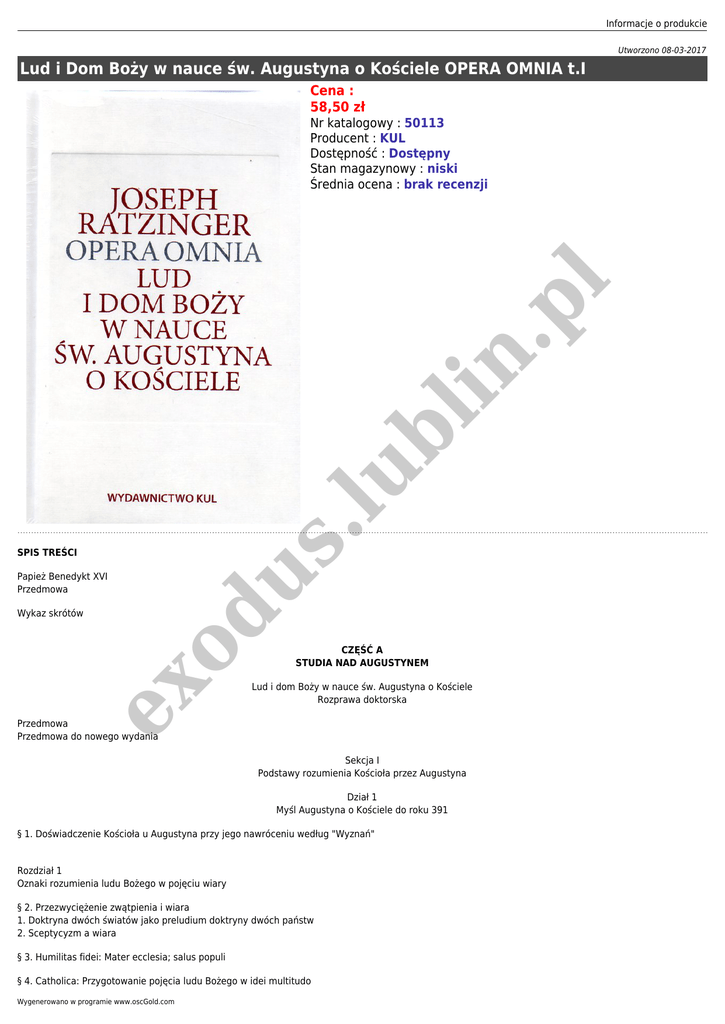 Informacje o produkcie Utworzono 08-03-2017 Lud i Dom Boży w nauce św. Augustyna o Kościele OPERA OMNIA t.I Cena : 58,50 zł SPIS TREŚCI Papież Benedykt XVI Przedmowa Wykaz skrótów od us .lu bl in .p l Nr katalogowy : 50113 Producent : KUL Dostępność : Dostępny Stan magazynowy : niski Średnia ocena : brak recenzji ex CZĘŚĆ A STUDIA NAD AUGUSTYNEM Lud i dom Boży w nauce św. Augustyna o Kościele Rozprawa doktorska Przedmowa Przedmowa do nowego wydania Sekcja I Podstawy rozumienia Kościoła przez Augustyna Dział 1 Myśl Augustyna o Kościele do roku 391 § 1. Doświadczenie Kościoła u Augustyna przy jego nawróceniu według "Wyznań" Rozdział 1 Oznaki rozumienia ludu Bożego w pojęciu wiary § 2. Przezwyciężenie zwątpienia i wiara 1. Doktryna dwóch światów jako preludium doktryny dwóch państw 2. Sceptycyzm a wiara § 3. Humilitas fidei: Mater ecclesia; salus populi § 4. Catholica: Przygotowanie pojęcia ludu Bożego w idei multitudo Wygenerowano w programie www.oscGold.com Rozdział 2 Dom Boży. Pojęcie miłości u wczesnego Augustyna § 5. Świątynia Boga w człowieku wewnętrznym § 6. Dilectio i unitas Retrospekcja i perspektywy Dział 2 Pojęcie Kościoła w tradycji afrykańskiej Rozdział 3 Pojęcie Kościoła u Tertuliana in .p l § 7. Kościół jako wspólnota disciplinae 1. Podobieństwo Boże ciała 2. Pytanie o zło i zbawienie 3. Szata zbawienia 4. Przywracanie podobieństwa do Boga przez disciplina § 8. Podstawowy sakramentalny sens idei disciplina Rozdział 4 Cyprian i Optat .lu od us § 10. Kościół w historii 1. Kościół a Stary Testament 2. Kościół a poganie 3. Właściwe miejsce Kościoła a) Lud Boży b) Chrystus pneumatyczny c) Mater ecclesia 4. Kościół a nowy świat bl § 9. Kościół z Ducha 1. Chrzest z Ducha a) Dualizm w rozumieniu obrzędu chrztu b) Skutki chrztu 2. Ciało Chrystusa i Duch Święty 3. Świątynia Boga 4. Kościół z Ducha jako herezja Zakończenie ex § 11. Cyprian I. Konkretno-prawne pojęcie Kościoła, jego wewnętrzna treść i teologiczne następstwa 1. Prawna struktura Kościoła: mater ecclesia i fraternitas christianorum 2. Tło polemiczne: schizma 3. Wewnętrzna treść: unitas 4. Teologiczna konsekwencja w interpretacji Starego Testamentu u Cypriana II. Eucharystyczno-sakramentalne pojęcie Kościoła 1. Ciało Chrystusa 2. Lud Boży w aspekcie wewnątrzsakramentalnym 3. Podsumowanie Dodatek Pochodne idei Kościoła w teologii Cypriana § 12. Optat z Milewy I. Kościół jako catholica, jako ecclesia omnium gentium II. Wspólnota prawdy 1. Jedność z odłączonymi "braćmi" a) Relacja między wiarą i Kościołem b) Stosunek Kościoła do herezji i schizmy c) Kościół Prawa: Stosunek do żydów i pogan 2. Oddzielenie się od donatystów a) Zakrycie prawdy widzianej w wierze b) Wypędzenie świętego ducha Bożego c) Budowanie wiedzy z własnej chwały 3. Podsumowanie III. Wspólnota miłości Dodatek Stosunek Kościoła i państwa według Optata Informacje o produkcie Sekcja II Lud i dom Boży w nauce Augustyna o Kościele Dział 1 Walka z donatyzmem Rozdział 5 Podstawy § 13. Kościół z wszystkich narodów - jeden lud Boży in .p l § 14. Caritas i pax: Communio sanctorum i communio sacramentorum 1. Konkretne ograniczenie caritas w ecclesia catholica 2. Prawdziwe miejsce caritas w ecclesia sancta 3. Jedność ecclesia catholica i ecclesia sancta 4. Przekształcenie Augustyna przez nowe postrzeganie ecclesia a) Przekształcenie idei Boga b) Nowa wizja ludzkiej drogi zbawienia c) Nowe miejsce Kościoła w mundus intelligibilis 5. Podsumowanie i wyniki Rozdział 6 Nauka o ludzie i domu Bożym § 15. Lud Boży bl § 16. Dom Boży 1. Teologia budowli kościelnej u Augustyna 2. Nawiązanie do biblijnej teologii domu .lu Dział 2 Pojęcie Kościoła w polemice z pogaństwem Rozdział 7 Podstawy ex od us § 17. Nowy kult 1. Wymóg ogólny: Nie ritus, lecz życie 2. Oddalenie człowieka od Boga. Pośrednik i pośrednicy 3. Ofiara Chrystusa i chrześcijan: Ciało Chrystusa I. Ciało Chrystusa w tradycji a) Antygnostycka teologia σῶμα u apologetów b) Antyariańska egzegeza Atanazego c) Powiązanie z nauką o Eucharystii i z etyką sakramentalną 1. Hilary 2. Chryzostom 3. Cyryl Aleksandryjski II. Nauka Augustyna o Ciele Chrystusa a) Jedność w Chrystusie przez wiarę b) Jedność z Duchem Chrystusa przez jedność z Ciałem Chrystusa c) Jedność z Ciałem Chrystusa przez jedność ze znakiem Ciała: Eucharystia a Kościół d) Metafizyczna treść idei Ciała Chrystusa. Ciało Chrystusa i Oblubienica Chrystusa 4. Perspektywa powszechna i jednostkowa, historyczna i metafizyczna Podsumowanie § 18. Nowa wiara Dodatek Nauka Mistrza Eckharta o inkorporacji Rozdział 8 Dom Boży § 19. "Dom Boży" w nauce Augustyna o Kościele I. Dom i namiot Boży; treść pojęciowa "domus" II. Świątynia Boga 1. Świątynia i Kościół 2. Kult "w duchu" czy kult Ciała Chrystusa? 3. Świątynia Boga w rozwoju III. Christus fundamentum 1. Christum habere in fundamento 2. Fundamentum i caput 3. Chrystus - kamień węgielny; dwie ściany domu Wygenerowano w programie www.oscGold.com IV. Podsumowanie i ocena Rozdział 9 Państwo i jego lud Wstępne uwagi terminologiczne I. Ogólne ujęcie lingwistyczne terminów "civitas" i "populus" 1. "Civitas" 2. "Populus" α) "populus" w znaczeniu ściślejszym. β) "Populi". II. Specyficzna sytuacja językowa Augustyna bl in .p l § 20. Starożytne pojęcie religii a civitas 1. Potrójne pojęcie teologii u Warrona 2. Augustynowa krytyka rozumienia teologii przez Warrona: Jedność między theologia naturalis i theologia civilis w chrześcijaństwie § 21. Aktualny stan badań nad civitas Dei § 22. Zewnętrzna zakres i rozumienie pojęcia obydwu civitates u Augustyna I. Zakres obydwu państw 1. Ponadhistoryczne pochodzenie obydwu państw aniołów 2. Aktualne relacje między państwem "wyższym" i "niższym" II. Rozumienie pojęciowe 1. Unitas 2. Justitia i utilitas 3.