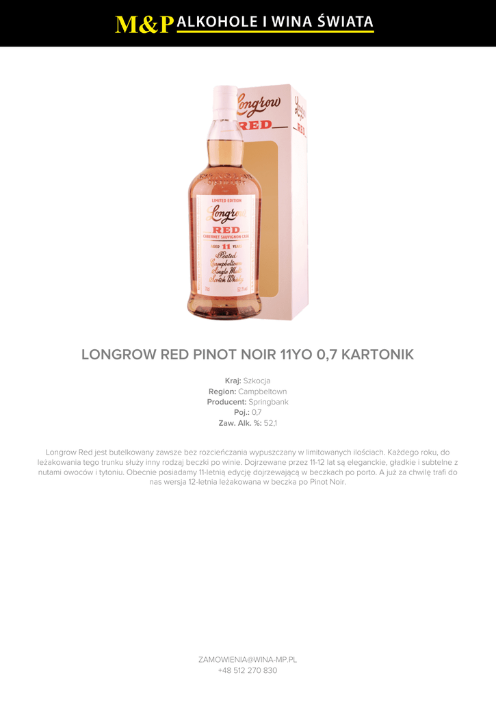 LONGROW RED PINOT NOIR 11YO 0,7 KARTONIK Kraj: Szkocja Region: Campbeltown Producent: Springbank Poj.: 0,7 Zaw. Alk. %: 52,1 Longrow Red jest butelkowany zawsze bez rozcieńczania wypuszczany w limitowanych ilościach. Każdego roku, do leżakowania tego trunku służy inny rodzaj beczki po winie. Dojrzewane przez 11-12 lat są eleganckie, gładkie i subtelne z nutami owoców i tytoniu. Obecnie posiadamy 11-letnią edycję dojrzewającą w beczkach po porto. A już za chwilę trafi do nas wersja 12-letnia leżakowana w beczka po Pinot Noir. [email protected] +48 512 270 830