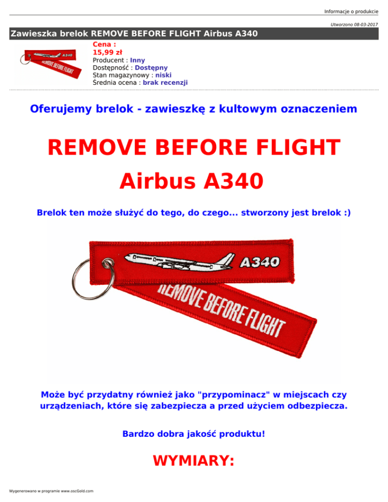 Informacje o produkcie Utworzono 08-03-2017 Zawieszka brelok REMOVE BEFORE FLIGHT Airbus A340 Cena : 15,99 zł Producent : Inny Dostępność : Dostępny Stan magazynowy : niski Średnia ocena : brak recenzji Oferujemy brelok - zawieszkę z kultowym oznaczeniem REMOVE BEFORE FLIGHT Airbus A340 Brelok ten może służyć do tego, do czego... stworzony jest brelok :) Może być przydatny również jako "przypominacz" w miejscach czy urządzeniach, które się zabezpiecza a przed użyciem odbezpiecza. Bardzo dobra jakość produktu! WYMIARY: Wygenerowano w programie www.oscGold.com Długość 13 cm Szerokość 3 cm