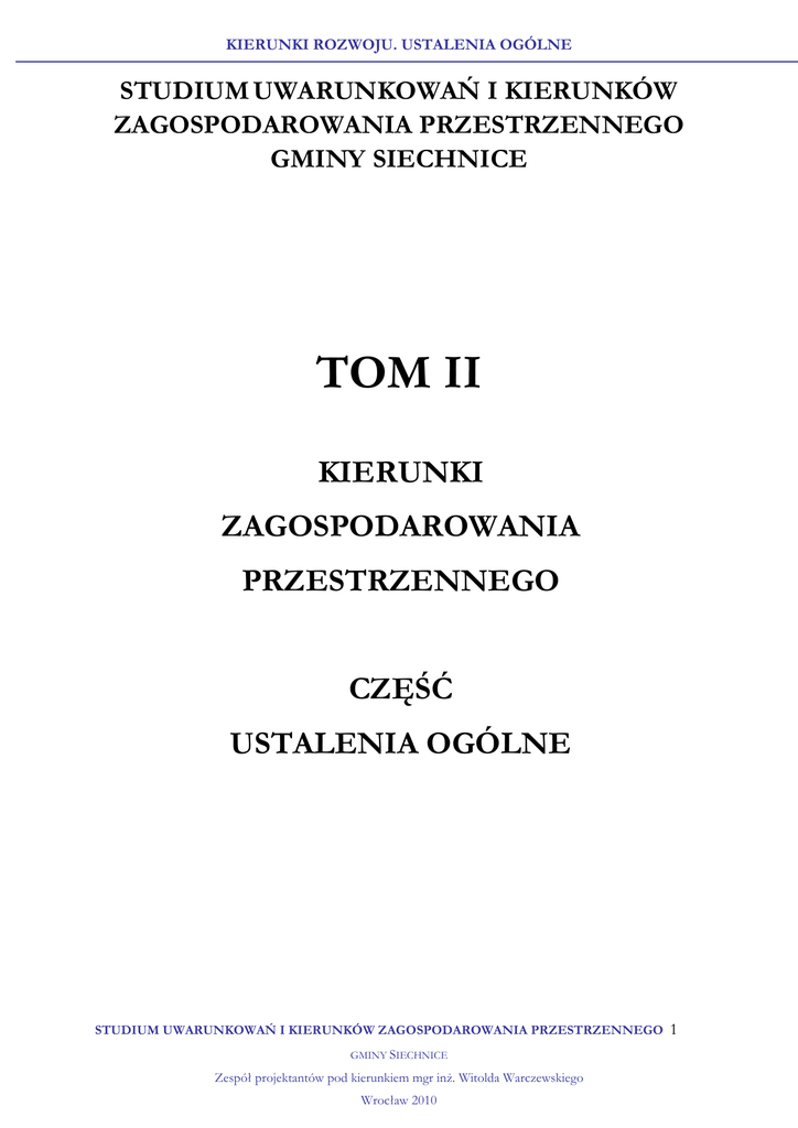 KIERUNKI ROZWOJU. USTALENIA OGÓLNE STUDIUM UWARUNKOWAŃ I KIERUNKÓW ZAGOSPODAROWANIA PRZESTRZENNEGO GMINY SIECHNICE TOM II KIERUNKI ZAGOSPODAROWANIA PRZESTRZENNEGO CZĘŚĆ USTALENIA OGÓLNE STUDIUM UWARUNKOWAŃ I KIERUNKÓW ZAGOSPODAROWANIA PRZESTRZENNEGO GMINY SIECHNICE Zespół projektantów pod kierunkiem mgr inż. Witolda Warczewskiego Wrocław 2010 1 KIERUNKI ROZWOJU. USTALENIA OGÓLNE SPIS TRESCI Kierunki zmian w strukturze przestrzennej gminy oraz w przeznaczeniu terenów uzasadnienie przyjętych rozwiązań i synteza ustaleń projektu studium ............................ 7 Kierunki zmian w strukturze funkcjonalno-przestrzennej gminy .................................................... 7 Kierunki zmian w przeznaczeniu terenów. .......................................................................................... 7 Kierunki i wskaźniki dotyczące zagospodarowania oraz użytkowania terenów, w tym tereny wyłączone spod zabudowy ....................................................................................... 9 Kierunki dotyczące zagospodarowania oraz użytkowania terenów ................................................. 9 Rodzaje zagospodarowania i przeznaczenia terenów ....................................................................... 17 Tereny zabudowy mieszkaniowej jednorodzinnej ........................................................................................17 Tereny zabudowy mieszkaniowej jednorodzinnej z usługami ....................................................................18 Tereny zabudowy mieszkaniowej jednorodzinnej rezydencjonalnej .........................................................20 Tereny zabudowy zagrodowej ..........................................................................................................................20 Tereny zabudowy mieszkaniowej niskiej intensywności ..............................................................................21 Tereny zabudowy mieszkaniowej niskiej intensywności z usługami .........................................................21 Tereny zabudowy mieszkaniowej wielorodzinnej .........................................................................................21 Teren zabudowy mieszkaniowej wielorodzinnej z usługami ......................................................................23 Tereny zabudowy usługowej z dopuszczeniem zabudowy mieszkaniowej ..............................................24 Tereny wielofunkcyjnego centrum miejskiego ..............................................................................................25 Tereny usług........................................................................................................................................................25 Tereny usług oświaty .........................................................................................................................................26 Tereny usług sportu ...........................................................................................................................................26 Tereny rezerwy dla rozwoju usług sportu ......................................................................................................27 Tereny usług zdrowia ........................................................................................................................................27 Tereny aktywności gospodarczej .....................................................................................................................27 Tereny rezerwy dla rozwoju aktywności gospodarczej ................................................................................28 Tereny produkcji ................................................................................................................................................28 Tereny produkcji rolniczej roślinnej................................................................................................................28 Tereny produkcji rolniczej zwierzęcej .............................................................................................................28 Tereny oczyszczania ścieków komunalnych i składowania odpadów komunalnych ..............................29 Tereny infrastruktury technicznej ....................................................................................................................29 Tereny cmentarzy ...............................................................................................................................................29 Tereny zieleni parkowej.....................................................................................................................................29 Tereny zieleni urządzonej .................................................................................................................................30 Tereny zieleni nieurządzonej ............................................................................................................................30 TUDIUM UWARUNKOWAŃ I KIERUNKÓW ZAGOSPODAROWANIA PRZESTRZENNEGO GMINY SIECHNICE Zespół projektantów pod kierunkiem mgr inż. Witolda Warczewskiego Wrocław 2010 2 KIERUNKI ROZWOJU. USTALENIA OGÓLNE Tereny zieleni izolacyjnej ..................................................................................................................................30 Tereny ogrodów i sadów ...................................................................................................................................31 Tereny komunikacji samochodowej ................................................................................................................31 Tereny dróg publicznych...................................................................................................................................31 Tereny komunikacji kolejowej.................................................................................
