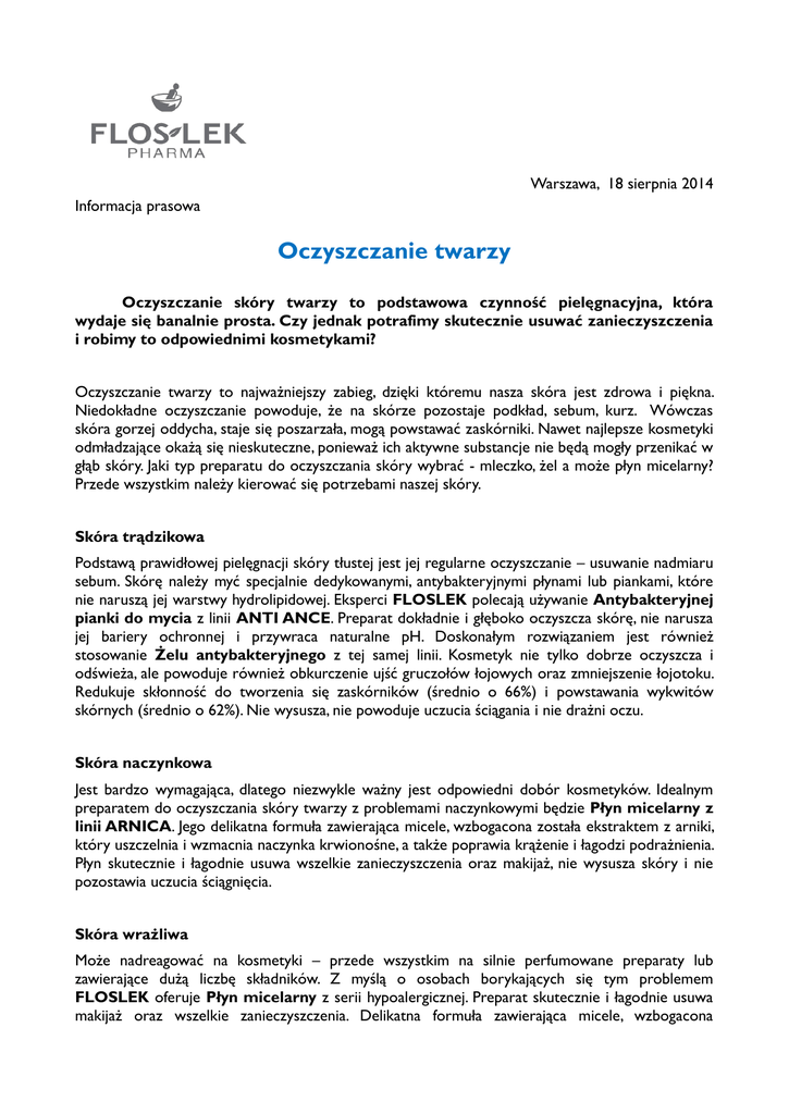 Warszawa, 18 sierpnia 2014 Informacja prasowa Oczyszczanie twarzy Oczyszczanie skóry twarzy to podstawowa czynność pielęgnacyjna, która wydaje się banalnie prosta. Czy jednak potrafimy skutecznie usuwać zanieczyszczenia i robimy to odpowiednimi kosmetykami? Oczyszczanie twarzy to najważniejszy zabieg, dzięki któremu nasza skóra jest zdrowa i piękna. Niedokładne oczyszczanie powoduje, że na skórze pozostaje podkład, sebum, kurz. Wówczas skóra gorzej oddycha, staje się poszarzała, mogą powstawać zaskórniki. Nawet najlepsze kosmetyki odmładzające okażą się nieskuteczne, ponieważ ich aktywne substancje nie będą mogły przenikać w głąb skóry. Jaki typ preparatu do oczyszczania skóry wybrać - mleczko, żel a może płyn micelarny? Przede wszystkim należy kierować się potrzebami naszej skóry. Skóra trądzikowa Podstawą prawidłowej pielęgnacji skóry tłustej jest jej regularne oczyszczanie – usuwanie nadmiaru sebum. Skórę należy myć specjalnie dedykowanymi, antybakteryjnymi płynami lub piankami, które nie naruszą jej warstwy hydrolipidowej. Eksperci FLOSLEK polecają używanie Antybakteryjnej pianki do mycia z linii ANTI ANCE. Preparat dokładnie i głęboko oczyszcza skórę, nie narusza jej bariery ochronnej i przywraca naturalne pH. Doskonałym rozwiązaniem jest również stosowanie Żelu antybakteryjnego z tej samej linii. Kosmetyk nie tylko dobrze oczyszcza i odświeża, ale powoduje również obkurczenie ujść gruczołów łojowych oraz zmniejszenie łojotoku. Redukuje skłonność do tworzenia się zaskórników (średnio o 66%) i powstawania wykwitów skórnych (średnio o 62%). Nie wysusza, nie powoduje uczucia ściągania i nie drażni oczu. Skóra naczynkowa Jest bardzo wymagająca, dlatego niezwykle ważny jest odpowiedni dobór kosmetyków. Idealnym preparatem do oczyszczania skóry twarzy z problemami naczynkowymi będzie Płyn micelarny z linii ARNICA. Jego delikatna formuła zawierająca micele, wzbogacona została ekstraktem z arniki, który uszczelnia i wzmacnia naczynka krwionośne, a także poprawia krążenie i łagodzi podrażnienia. Płyn skutecznie i łagodnie usuwa wszelkie zanieczyszczenia oraz makijaż, nie wysusza skóry i nie pozostawia uczucia ściągnięcia. Skóra wrażliwa Może nadreagować na kosmetyki – przede wszystkim na silnie perfumowane preparaty lub zawierające dużą liczbę składników. Z myślą o osobach borykających się tym problemem FLOSLEK oferuje Płyn micelarny z serii hypoalergicznej. Preparat skutecznie i łagodnie usuwa makijaż oraz wszelkie zanieczyszczenia. Delikatna formuła zawierająca micele, wzbogacona aktywnym kompleksem roślinnym, łagodzi i wzmacnia mechanizmy obronne skóry wrażliwej. Do oczyszczania skóry wrażliwej poleca się również stosowanie Mleczka do demakijażu z tej samej linii. Mleczko doskonale usuwa makijaż twarzy i oczu oraz inne naturalne zanieczyszczenia. Jest bardzo dobrze tolerowane, nie powoduje podrażnień skóry i oczu. FLOSLEK Pharma jest marką specjalistycznych dermokosmetyków stworzonych dla skóry problematycznej, wymagającej szczególnej pielęgnacji. Formuły preparatów FLOSLEK Pharma zostały przebadane przez akredytowane laboratoria badawcze i przetestowane pod nadzorem dermatologów przez osoby o skórze wrażliwej i skłonnej do alergii. Dermokosmetyki FLOSLEK gwarantują wysoką jakość, skuteczność i bezpieczeństwo stosowania. Charakteryzują się nie tylko wysoką efektywnością, ale również doskonałymi właściwościami aplikacyjnymi. Produkty Marki FLOSLEK Pharma są dostępne w aptekach. Serwis PR: Magdalena Ćwikła KiS Production Sp. z o.o. ul. Klimczaka 5 lok. 52 02-797 Warszawa tel.: 0-785-409-803 e-mail: [email protected] www.kisp.pl