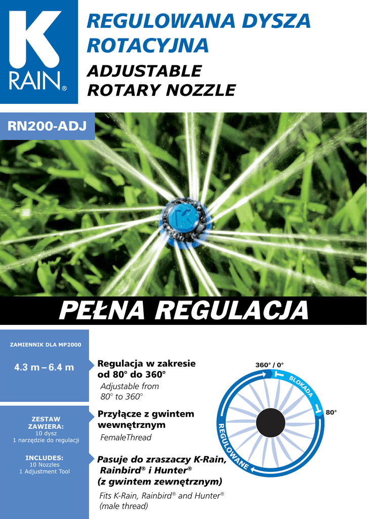 AdjustAbLE REGULOWANA DYSZA AdjustAbLE AdjustAbLE ROtARY NOZZLE ROTACYJNA ROtARY NOZZLE ROtARY NOZZLE ® ® ® boquilla rotatoria boquilla rotatoria ADJUSTABLE boquilla rotatoria aJuStablE ROTARY NOZZLE aJuStablE aJuStablE RN200-ADJ RN200-ADJ RN200-ADJ FuLLY AdjustAbLE 14' – 21' FuLLY PEŁNA REGULACJA FuLLYAdjustAbLE AdjustAbLE 4.3 m – 6.4 m Replaces MP-2000 Adjustable from 80° to 360° 360° / 0° FI X Ajustable de 80° a 360° SPRAY PATTERN SPRAY PATTERN OPTIONS D E 14' – 21' 14' – 21' ZAMIENNIK DLA MP2000 SPRAY PATTERN OPTIONS D E A ST A DD AE A DJU OPTIONS Regulacja w zakresie 360° / 0° 80° Adjustable Female Thread from 360° B/ 0° Adjustable from od 80° do 360° 80° to rosca 360° 4.3 m –MP-2000 6.4 m Boquilla LO de hembra F 10 Nozzles Replaces IX K 80° to 360° Adjustable from Ajustable de 80° a 360° FI 1 Replaces Adjustment Tool MP-2000 X 80° to 360° de 80°® a 360° Ajustable B Fits K-Rain, Rainbird INCLUYE: LE ® Przyłącze z gwintem 10 Boquillas and Hunter Sprays Female Thread ZESTAW 1 INCLUDES: Herramienta (male thread) wewnętrznym ZAWIERA: Boquilla de Thread rosca hembra Female 10 ajuste Nozzles de 10 dysz INCLUDES: Se puede usar con rociadores FemaleThread narzędzie do regulacji 11Adjustment Tool K-Rain, Boquilla rosca(rosca hembra 10 Nozzles Rainbird de y Hunter macho) 1Also Adjustment ® B Available Tool INCLUDES: A Fits K-Rain, Rainbird Pasuje do zraszaczy K-Rain, INCLUYE: LE N 10 Nozzles E ® RN100-ADJ ® ® ® 10 Boquillas and Hunter Sprays 1 Adjustment Tool Rainbird i Hunter B 8'-14' Fits K-Rain, Rainbird INCLUYE: LE 1 Herramienta ® (male thread) (z gwintem zewnętrznym) 10 Boquillas and Hunter Sprays de ajuste RN300-ADJ Se puede Rainbird usar con ® rociadores® 1 Herramienta Fits(male K-Rain, and Hunter thread) 22'-28' K-Rain, Rainbird y Hunter (rosca macho) de ajuste (male thread) usar con rociadores Se puede 4.3 m – 6.4 m INCLUDES: 80° A ST W TA LO S A DJU U GU EJ ARD 80° ROtARY NOZZLE AdjustAbLE ROtARY NOZZLE AdjustAbLEAdjustAbLE ROtARY NOZZLE REGULOWANA DYSZA ROTACYJNA AdjustAbLE ROtARY NOZZLE boquilla rotatoria aJuStablE boquilla rotatoria boquilla rotatoria aJuStablE ADJUSTABLE ROTARY aJuStablE NOZZLE boquilla rotatoria aJuStablE FILTER Filtro FILTER FILTER FLOW CONTROL RING Filtro FILTER Filtr CONTROL RING FLOW CONTROL RINGAnillo deFLOW Filtro Control CONTROL de Flujo Pierścień kontroli FLOW Filtro Filter Anillo de Control de RING Flujoprzepływu Anillo de Control de Flujo Flow Ring AnilloControl de Control de Flujo Dołączone narzędzie do Tool included for łatwej regulacji dyszy FIXED easy adjustment. Tool included for Tool included for incluida for Herramienta LEFT ToolSTART included easy adjustment. easy adjustment. para un ajuste fácil. easy adjustment. INDICATOR Herramienta incluida Herramienta Indicador para unde ajusteincluida fácil. para un ajuste fácil. posición de inicio Specyfikacja Specifications fijo a la izquierda Especificaciones Specifications Specifications Specifications RIGHT RIGHT ADJUSTMENT Strzałka RIGHT ARROW ADJUSTMENT RIGHT ADJUSTMENT ARROW FIXED LEFT START FIXED Znacznik lewego FIXED INDICATOR LEFT START Flecha de Indicador de kąta LEFT START ramienia INDICATOR posición de inicio INDICATOR Indicador de zraszania fijo a la izquierda ADJUSTMENT Flecha de ustalająca ARROW ARROW Ajuste Derecha Flecha deramię prawe Flecha de Ajuste Derecha kąta Ajuste zraszania Derecha Ajuste Derecha Right Adjustment Arrow Indicador de posición de inicio Fixed Left Startde inicio posición fijo a la izquierda Indicator fijo a la izquierda Especificaciones Zalecany rozstaw: Recommended Spacing: Adjusting the Arc Especificaciones 4,3 m - 6,4 m Espaciamiento Ajuste del Arco Recommended Spacing: Adjusting the Adjusting the Arc recomendado: Recommended Spacing: Recommended Spacing: Ustawianie kątaArc zraszania Adjusting the Arc 14’ - 21’ Espaciamiento 1. Position thedel Left Arco Start Indicator to desired start position. 14' – 21'del Arco Ajuste Ajuste Espaciamiento Adjusting the Arc Colocar el Indicador de inicio Izquierdo a la posición de inicio deseada. recomendado: Ajuste del Arco 4.3 m – 6.4 m recomendado: 1. Position thestart Left Start Indicator to desired start position. 1. Position the Left Start Indicator to desired position. 14' – 21' 2. Rotate the Right Adjustment Arrow to desired stop position. Ustaw znacznik lewego ramienia kąta zraszania w pozycji 1. Position the Left Start Indicator to desired start position. 14' – 21' el de Indicador de inicio Izquierdo a la posición de inicio deseada. Colocar elciśnienie a laColocar posición inicio deseada. Zalecane pressure Rating: 4.3 m –Indicador 6.4 mde inicio Izquierdo Hacer girar la Flecha de Ajuste Derecha a la posición de parada deseada. startowej. Colocar el Indicador de inicio Izquierdo a la posición de inicio deseada. 4.3 m – 6.4 m pracy: Position the Left Start Indicator to desired start position. presión de trabajo: 2.Arrow Rotate the Right Adjustment Arrow to desired 2.2.1Rotate the Right Adjustment desired position. do 3,5 barów 3. Flow can beto adjusted bystop turning the Flow Control Ring. stop position. pressure Rating: Przekręć strzałkę ustalającą prawe ramię kąta do pozycji 2. Rotate the Right Adjustment Arrow to desired stop position. 25 – 50 PSI Hacer girar la Flecha de Ajuste Derecha a la posición de parada deseada. Hacer girar la Flecha de Ajuste Derecha a la posición de parada deseada. Pressure Rating: Minimum/Maximum Flow reduction is a20%. pressure Rating: Hacer girar la Flecha de Ajuste Derecha la posición de parada deseada. końcowej. 2.1 a 3.5 bars 25 – 50 PSI presión de trabajo: El flujo puede serthe ajustado girando el Anillo de Control de Flujo. Reducción Right Adjustment Arrow to desired position. 3. Rotate Flow beControl by turning the stop Flow Control Ring. 3. Flow cande be adjusted by turning the can Flow presión de Flujo mínima/máxima esadjusted 20%. Ring. 25 – 50 PSItrabajo: W