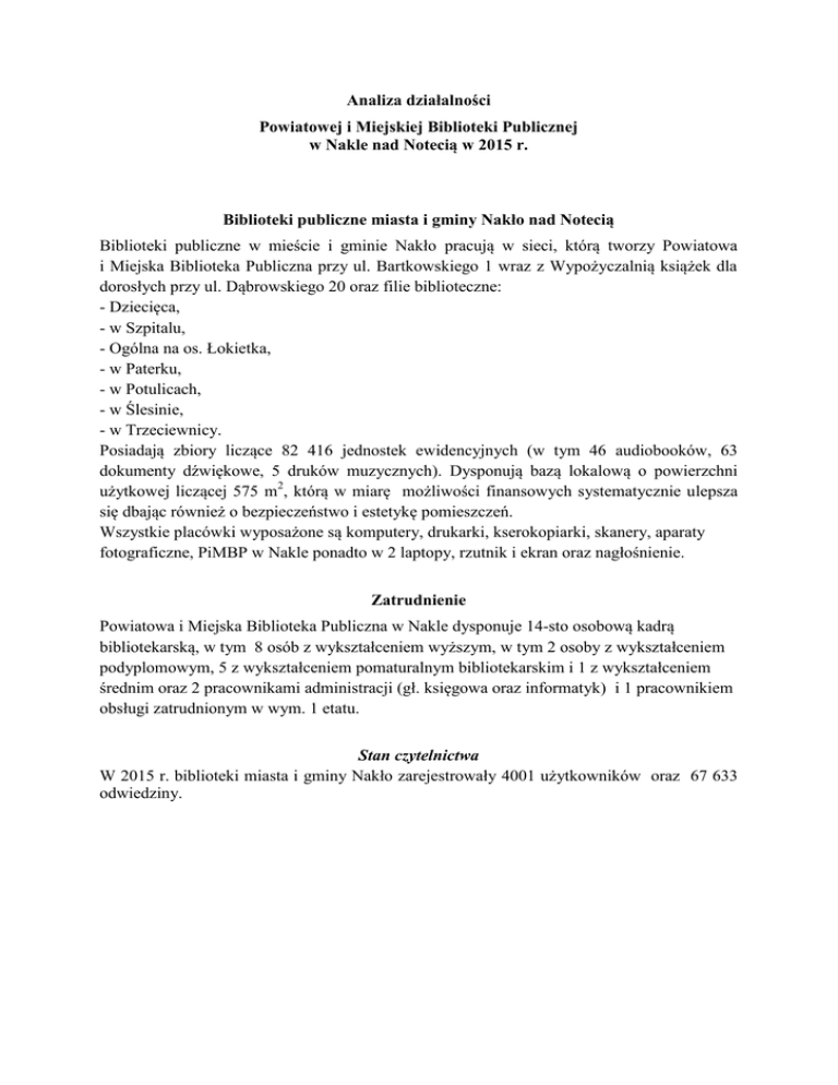 Analiza działalności Powiatowej i Miejskiej Biblioteki Publicznej w Nakle nad Notecią w 2015 r. Biblioteki publiczne miasta i gminy Nakło nad Notecią Biblioteki publiczne w mieście i gminie Nakło pracują w sieci, którą tworzy Powiatowa i Miejska Biblioteka Publiczna przy ul. Bartkowskiego 1 wraz z Wypożyczalnią książek dla dorosłych przy ul. Dąbrowskiego 20 oraz filie biblioteczne: - Dziecięca, - w Szpitalu, - Ogólna na os. Łokietka, - w Paterku, - w Potulicach, - w Ślesinie, - w Trzeciewnicy. Posiadają zbiory liczące 82 416 jednostek ewidencyjnych (w tym 46 audiobooków, 63 dokumenty dźwiękowe, 5 druków muzycznych). Dysponują bazą lokalową o powierzchni użytkowej liczącej 575 m2, którą w miarę możliwości finansowych systematycznie ulepsza się dbając również o bezpieczeństwo i estetykę pomieszczeń. Wszystkie placówki wyposażone są komputery, drukarki, kserokopiarki, skanery, aparaty fotograficzne, PiMBP w Nakle ponadto w 2 laptopy, rzutnik i ekran oraz nagłośnienie. Zatrudnienie Powiatowa i Miejska Biblioteka Publiczna w Nakle dysponuje 14-sto osobową kadrą bibliotekarską, w tym 8 osób z wykształceniem wyższym, w tym 2 osoby z wykształceniem podyplomowym, 5 z wykształceniem pomaturalnym bibliotekarskim i 1 z wykształceniem średnim oraz 2 pracownikami administracji (gł. księgowa oraz informatyk) i 1 pracownikiem obsługi zatrudnionym w wym. 1 etatu. Stan czytelnictwa W 2015 r. biblioteki miasta i gminy Nakło zarejestrowały 4001 użytkowników oraz 67 633 odwiedziny. 2 Użytkownicy aktywnie wypożyczający wg wieku Ogółem 3 589 do 5 lat 6-12 13-15 16-19 20-24 25-44 45-60 pow. 60 58 563 280 432 287 892 611 466 (1,62%) (15,69%) (7,80%) (12,04%) (8,00%) (24,85%) (17,02%) (12,98%) wg zajęcia Ogółem Osoby uczące się Osoby pracujące Pozostali 3 589 1535 1096 958 (42,77%) (30,54%) (26,69%) Z usług bibliotecznych skorzystało: - internet – 9 029 os. - usługi kserograficzne i wydruki komputerowe – 837 os. - wypożyczenia międzybiblioteczne – 53 os. Na zewnątrz wypożyczono 73 752 książki, 2 899 czasopism, natomiast na miejscu udostępniono 625 książek i 3 877 czasopism. Wypożyczalnia książek przy ul. Dąbrowskiego 20 realizuje formę udostępniania zbiorów ph.: „Książka na telefon” adresowaną do niepełnosprawnych i chorych mieszkańców Nakła. Na telefoniczne życzenie czytelnika bibliotekarz dostarcza literaturę do domu. W roku 2015 z tej formy korzystano 37 razy. Zakupy zbiorów bibliotecznych W 2015 r. zakupiono 2 784 książki, 13 audiobooków, 63 dok. dźwiękowe (płyty z muzyką) oraz 5 druków muzycznych (nuty), łącznie na kwotę 62 425,77 zł, w tym z dotacji powiatowej 387 książek i 13 audiobooków na łączną kwotę z 9 200,00 zł. Pozyskano również 99 darów o wartości 2 125,62 zł: - z Instytutu Książki w ramach Dyskusyjnych Klubów Książki - 24 egz. na wartość 599,52 zł - z innych źródeł - 75 egz. darów na wartość 1 526,10 zł. We wrześniu 2015 r. Powiatowa i Miejska Biblioteka Publiczna w Nakle rozpoczęła tworzyć dział muzyczny, na który składają się dokumenty dźwiękowe, druki muzyczne oraz książki. Powstał on jako wyraz uhonorowania Pana Rafała Blechacza za dotychczasowe sukcesy muzyczne i promocję Nakła. Artysta zgodził się objąć zbiory swoim patronatem. 3 Pozyskane środki ze źródeł zewnętrznych W 2015 r. Powiatowa i Miejska Biblioteka Publiczna w Nakle pozyskała: ● środki na zakup książek z Programu MKiDN „Zakup nowości wydawniczych do Bibliotek” w kwocie 24.927,00 zł ● darowizny książek na wartość 2.125,62 zł ● środki z Fundacji Orange w ramach Programu „Akademia Orange dla bibliotek” w kwocie 5.720,03 zł ● sfinansowanie rocznego dostępu do bazy Ibuk Libra przez Wojewódzką i Miejską Bibliotekę Publiczną w Bydgoszczy – koszt 1.900,00 zł ● darowizna z Banku Spółdzielczego w Nakle w wys. 1.500,00 zł ● dofinansowanie 3 spotkań autorskich z Programu Dyskusyjne Kluby Książki – koszty ogółem 2.000,00 zł ● dofinansowanie z Gminnego Programu Profilaktyki, Rozwiązywania Problemów Alkoholowych i Przeciwdziałania Narkomanii na organizację zajęć profilaktycznointegracyjnych w okresie wakacji letnich w wys. 1800,00 zł Razem wysokość środków wypracowanych i pozyskanych w bieżącym roku w formie rzeczowej i finansowej to kwota 53.076,10 zł, w tym dochody własne - 13.103,45 zł. Szkolenia pracowników merytorycznych Aby biblioteki publiczne w mieście i gminie aktywnie odpowiadały na zmieniające się potrzeby mieszkańców oraz były nowoczesnymi instytucjami konieczne jest stałe i systematyczne podnoszenie kompetencji zawodowych. Dlatego pracownicy PiMBP w Nakle systematycznie uczestniczą w szkoleniach i warsztatach zdobywając nowe umiejętności. Tylko w roku 2015 r. 12 bibliotekarzy uczestniczyło w 14 szkoleniach merytorycznych. Komputeryzacja Od stycznia 2015 r. we wszystkich placówkach Powiatowej i Miejskiej Biblioteki Publicznej w Nakle działa elektroniczny system rejestracji czytelników i udostępniania zbiorów. Dzięki niemu wszyscy czytelnicy po otrzymaniu elektronicznej karty bibliotecznej mają możliwość m.in. zamawiania, rezerwowania i prolongowania książek on-line. Chcąc jak najlepiej zaspokajać potrzeby użytkowników bibliotek od 1 września 2015 r. Powiatowa i Miejska Biblioteka Publiczna w Nakle rozszerzyła swoją ofertę umożliwiając czytelnikom dostęp do 1248 tytułów w czytelni IBUK Libra. Subskrypcja ważna do 31 sierpnia 2016 r., której roczny koszt wyniósł 1900 zł, została sfinansowana przez Wojewódzką i Miejską Bibliotekę Publiczną w Bydgoszczy. Baza IBUK Libra zawiera elektroniczne wersje książek specjalistycznych, naukowych, popularnonaukowych oraz beletrystycznych wydanych przez renomowane polskie oficyny. Czytelnicy placówek 4 bibliotecznych miasta i gminy mogą otrzymać osobiście od bibliotekarzy kody aktywacyjne do zdalne