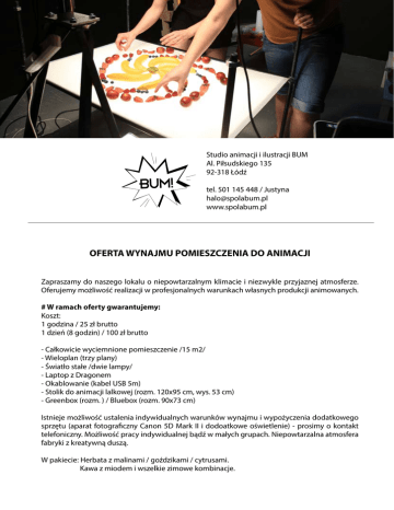 Studio animacji i ilustracji BUM Al. Piłsudskiego 135 92-318 Łódź tel. 501 145 448 / Justyna [email protected] www.spolabum.pl OFERTA WYNAJMU POMIESZCZENIA DO ANIMACJI Zapraszamy do naszego lokalu o niepowtarzalnym klimacie i niezwykle przyjaznej atmosferze. Oferujemy możliwość realizacji w profesjonalnych warunkach własnych produkcji animowanych. # W ramach oferty gwarantujemy: Koszt: 1 godzina / 25 zł brutto 1 dzień (8 godzin) / 100 zł brutto - Całkowicie wyciemnione pomieszczenie /15 m2/ - Wieloplan (trzy plany) - Światło stałe /dwie lampy/ - Laptop z Dragonem - Okablowanie (kabel USB 5m) - Stolik do animacji lalkowej (rozm. 120x95 cm, wys. 53 cm) - Greenbox (rozm. ) / Bluebox (rozm. 90x73 cm) Istnieje możliwość ustalenia indywidualnych warunków wynajmu i wypożyczenia dodatkowego sprzętu (aparat fotograficzny Canon 5D Mark II i dodoatkowe oświetlenie) - prosimy o kontakt telefoniczny. Możliwość pracy indywidualnej bądź w małych grupach. Niepowtarzalna atmosfera fabryki z kreatywną duszą. W pakiecie: Herbata z malinami / goździkami / cytrusami. Kawa z miodem i wszelkie zimowe kombinacje.