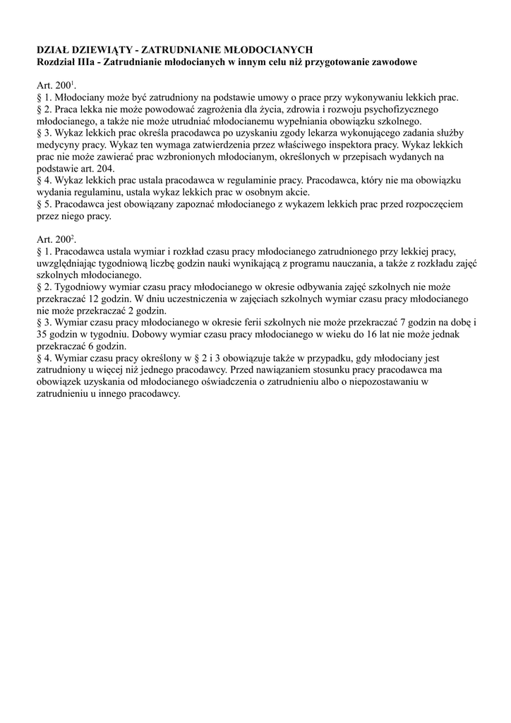 DZIAŁ DZIEWIĄTY - ZATRUDNIANIE MŁODOCIANYCH Rozdział IIIa - Zatrudnianie młodocianych w innym celu niż przygotowanie zawodowe Art. 2001. § 1. Młodociany może być zatrudniony na podstawie umowy o prace przy wykonywaniu lekkich prac. § 2. Praca lekka nie może powodować zagrożenia dla życia, zdrowia i rozwoju psychofizycznego młodocianego, a także nie może utrudniać młodocianemu wypełniania obowiązku szkolnego. § 3. Wykaz lekkich prac określa pracodawca po uzyskaniu zgody lekarza wykonującego zadania służby medycyny pracy. Wykaz ten wymaga zatwierdzenia przez właściwego inspektora pracy. Wykaz lekkich prac nie może zawierać prac wzbronionych młodocianym, określonych w przepisach wydanych na podstawie art. 204. § 4. Wykaz lekkich prac ustala pracodawca w regulaminie pracy. Pracodawca, który nie ma obowiązku wydania regulaminu, ustala wykaz lekkich prac w osobnym akcie. § 5. Pracodawca jest obowiązany zapoznać młodocianego z wykazem lekkich prac przed rozpoczęciem przez niego pracy. Art. 2002. § 1. Pracodawca ustala wymiar i rozkład czasu pracy młodocianego zatrudnionego przy lekkiej pracy, uwzględniając tygodniową liczbę godzin nauki wynikającą z programu nauczania, a także z rozkładu zajęć szkolnych młodocianego. § 2. Tygodniowy wymiar czasu pracy młodocianego w okresie odbywania zajęć szkolnych nie może przekraczać 12 godzin. W dniu uczestniczenia w zajęciach szkolnych wymiar czasu pracy młodocianego nie może przekraczać 2 godzin. § 3. Wymiar czasu pracy młodocianego w okresie ferii szkolnych nie może przekraczać 7 godzin na dobę i 35 godzin w tygodniu. Dobowy wymiar czasu pracy młodocianego w wieku do 16 lat nie może jednak przekraczać 6 godzin. § 4. Wymiar czasu pracy określony w § 2 i 3 obowiązuje także w przypadku, gdy młodociany jest zatrudniony u więcej niż jednego pracodawcy. Przed nawiązaniem stosunku pracy pracodawca ma obowiązek uzyskania od młodocianego oświadczenia o zatrudnieniu albo o niepozostawaniu w zatrudnieniu u innego pracodawcy.