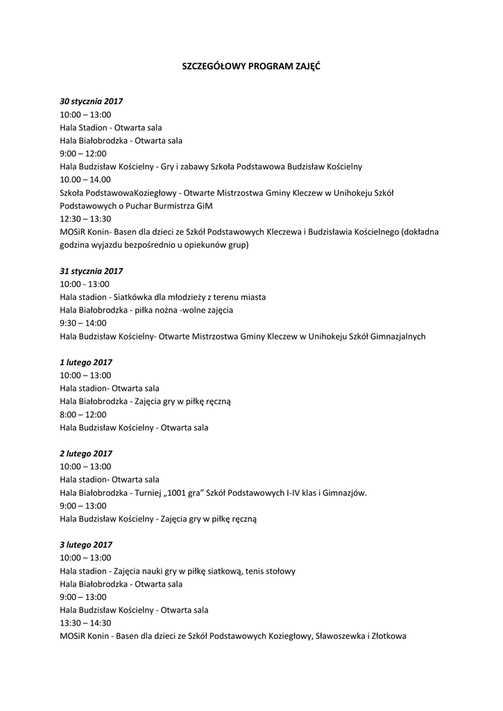 SZCZEGÓŁOWY PROGRAM ZAJĘĆ 30 stycznia 2017 10:00 – 13:00 Hala Stadion - Otwarta sala Hala Białobrodzka - Otwarta sala 9:00 – 12:00 Hala Budzisław Kościelny - Gry i zabawy Szkoła Podstawowa Budzisław Kościelny 10.00 – 14.00 Szkoła PodstawowaKoziegłowy - Otwarte Mistrzostwa Gminy Kleczew w Unihokeju Szkół Podstawowych o Puchar Burmistrza GiM 12:30 – 13:30 MOSiR Konin- Basen dla dzieci ze Szkół Podstawowych Kleczewa i Budzisławia Kościelnego (dokładna godzina wyjazdu bezpośrednio u opiekunów grup) 31 stycznia 2017 10:00 - 13:00 Hala stadion - Siatkówka dla młodzieży z terenu miasta Hala Białobrodzka - piłka nożna -wolne zajęcia 9:30 – 14:00 Hala Budzisław Kościelny- Otwarte Mistrzostwa Gminy Kleczew w Unihokeju Szkół Gimnazjalnych 1 lutego 2017 10:00 – 13:00 Hala stadion- Otwarta sala Hala Białobrodzka - Zajęcia gry w piłkę ręczną 8:00 – 12:00 Hala Budzisław Kościelny - Otwarta sala 2 lutego 2017 10:00 – 13:00 Hala stadion- Otwarta sala Hala Białobrodzka - Turniej „1001 gra” Szkół Podstawowych I-IV klas i Gimnazjów. 9:00 – 13:00 Hala Budzisław Kościelny - Zajęcia gry w piłkę ręczną 3 lutego 2017 10:00 – 13:00 Hala stadion - Zajęcia nauki gry w piłkę siatkową, tenis stołowy Hala Białobrodzka - Otwarta sala 9:00 – 13:00 Hala Budzisław Kościelny - Otwarta sala 13:30 – 14:30 MOSiR Konin - Basen dla dzieci ze Szkół Podstawowych Koziegłowy, Sławoszewka i Złotkowa (dokładna godzina wyjazdu bezpośrednio u opiekunów grup) 6 lutego 2017 10:00 – 13:00 Hala stadion - Turniej tenisa stołowego dla Szkół Podstawowych i Gimnazjalnych Hala Białobrodzka - Zajęcia gry w piłkę siatkową i piłkę nożną Hala Budzisław Kościelny - Zajęcia gry w piłkę ręczną 7 lutego 2017 10:00 – 13:00 Hala stadion - Otwarta sala Hala Białobrodzka - Nauka gry w tenisa ziemnego 11:00 – 13:30 Park Malta Kleczew - zajęcia plenerowe dla uczniów Szkól Podstawowych i Gimnazjów połączone z ogniskiem i pieczeniem kiełbasek 9.00 -13.00 Hala Budzisław K. - Otwarta sala 8 lutego 2017 10:00 – 13:00 Hala stadion - Nauka gry w piłkę koszykowa i piłkę nożną Hala Białobrodzka - Turniej piłki ręcznej Szkół Podstawowych o Puchar Burmistrza GiM Kleczew 9:30 – 12:30 Hala Budzisław Kościelny - Gry i zabawy Szkoła Podstawowa Budzisław Kościelny 13:00 – 14:00 MOSiR Konin- Basen dla dzieci ze Szkół Podstawowych Koziegłowy, Sławoszewka i Złotkowa (dokładna godzina wyjazdu bezpośrednio u opiekunów grup) 9 lutego 2017 10:00 – 13:00 Hala stadion - Zajęcia gry w piłkę nożną halową oraz piłkę koszykową Hala Białobrodzka - Festyn kulturalno – sportowy dla dzieci ze świetlic środowiskowych z terenu gminy Kleczew (MGOPS Kleczew) Hala Budzisław Kościelny - Zajęcia gry w piłkę siatkową 10 lutego 2017 10.00 – 13:00 Hala stadion- Zajęcia nauki gry w piłkę siatkową Hala Białobrodzka - Otwarta sala Hala Budzisław Kościelny - Zajęcia gry w piłkę ręczną i piłkę nożną halową 13:30 – 14:30 MOSiR Konin-Basen dla dzieci ze Szkół Podstawowych Kleczewa i Budzisławia Kościelnego (dokładna godzina wyjazdu bezpośrednio u opiekunów grup)