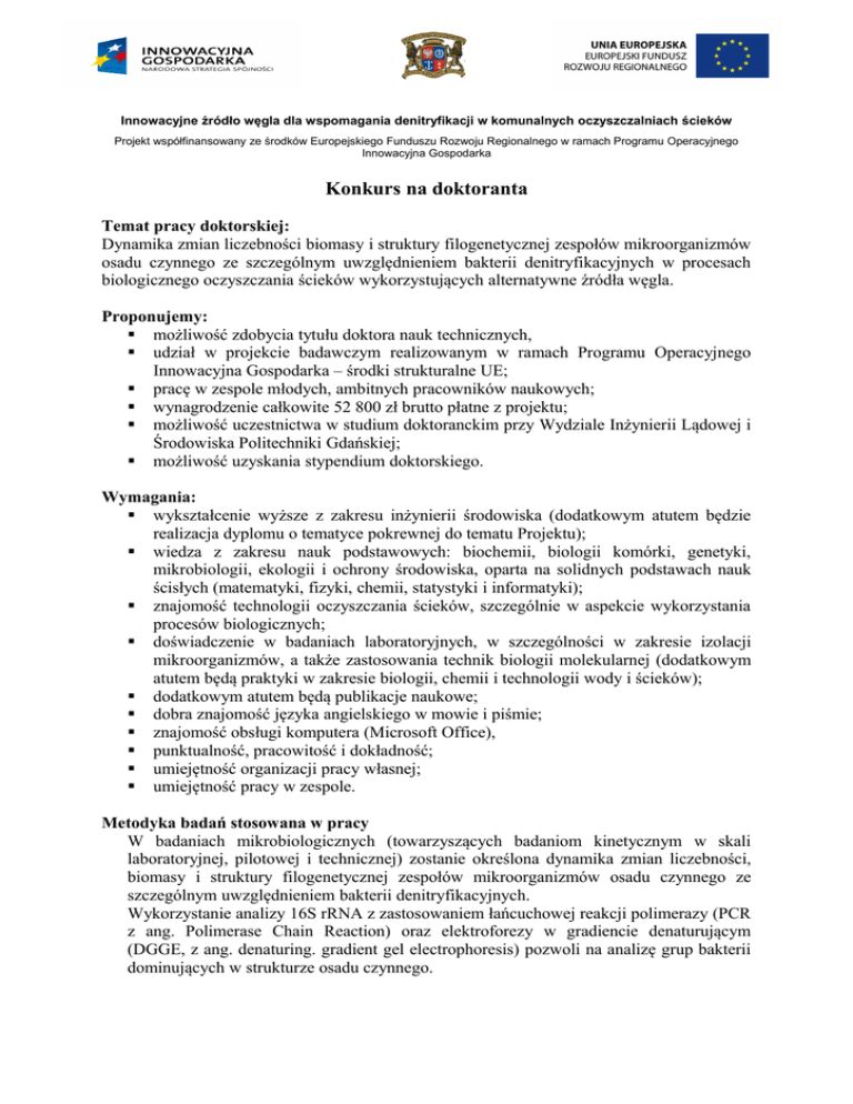 Innowacyjne źródło węgla dla wspomagania denitryfikacji w komunalnych oczyszczalniach ścieków Projekt współfinansowany ze środków Europejskiego Funduszu Rozwoju Regionalnego w ramach Programu Operacyjnego Innowacyjna Gospodarka Konkurs na doktoranta Temat pracy doktorskiej: Dynamika zmian liczebności biomasy i struktury filogenetycznej zespołów mikroorganizmów osadu czynnego ze szczególnym uwzględnieniem bakterii denitryfikacyjnych w procesach biologicznego oczyszczania ścieków wykorzystujących alternatywne źródła węgla. Proponujemy: możliwość zdobycia tytułu doktora nauk technicznych, udział w projekcie badawczym realizowanym w ramach Programu Operacyjnego Innowacyjna Gospodarka – środki strukturalne UE; pracę w zespole młodych, ambitnych pracowników naukowych; wynagrodzenie całkowite 52 800 zł brutto płatne z projektu; możliwość uczestnictwa w studium doktoranckim przy Wydziale Inżynierii Lądowej i Środowiska Politechniki Gdańskiej; możliwość uzyskania stypendium doktorskiego. Wymagania: wykształcenie wyższe z zakresu inżynierii środowiska (dodatkowym atutem będzie realizacja dyplomu o tematyce pokrewnej do tematu Projektu); wiedza z zakresu nauk podstawowych: biochemii, biologii komórki, genetyki, mikrobiologii, ekologii i ochrony środowiska, oparta na solidnych podstawach nauk ścisłych (matematyki, fizyki, chemii, statystyki i informatyki); znajomość technologii oczyszczania ścieków, szczególnie w aspekcie wykorzystania procesów biologicznych; doświadczenie w badaniach laboratoryjnych, w szczególności w zakresie izolacji mikroorganizmów, a także zastosowania technik biologii molekularnej (dodatkowym atutem będą praktyki w zakresie biologii, chemii i technologii wody i ścieków); dodatkowym atutem będą publikacje naukowe; dobra znajomość języka angielskiego w mowie i piśmie; znajomość obsługi komputera (Microsoft Office), punktualność, pracowitość i dokładność; umiejętność organizacji pracy własnej; umiejętność pracy w zespole. Metodyka badań stosowana w pracy W badaniach mikrobiologicznych (towarzyszących badaniom kinetycznym w skali laboratoryjnej, pilotowej i technicznej) zostanie określona dynamika zmian liczebności, biomasy i struktury filogenetycznej zespołów mikroorganizmów osadu czynnego ze szczególnym uwzględnieniem bakterii denitryfikacyjnych. Wykorzystanie analizy 16S rRNA z zastosowaniem łańcuchowej reakcji polimerazy (PCR z ang. Polimerase Chain Reaction) oraz elektroforezy w gradiencie denaturującym (DGGE, z ang. denaturing. gradient gel electrophoresis) pozwoli na analizę grup bakterii dominujących w strukturze osadu czynnego. Do badań zostaną zastosowane następujące metody badawcze: ekstrakcja DNA; amplifikacja PCR; analiza produktów PCR z zastosowaniem metody DGGE;. zastosowanie wybranych sond oligonukleotydowych do ilościowej analizy grup funkcyjnych w biocenozie. Analiza uzyskanych sekwencji i porównanie z genową biblioteką GenBank lub EMBL pozwoli na stwierdzenie, czy były one znane już uprzednio. Zgłoszenia prosimy składać: osobiście w biurze Wydziału Inżynierii Lądowej i Środowiska Politechniki Gdańskiej gmach „B” pokój 011, lub listem poleconym (decyduje data wpłynięcia do biura) na adres: Biuro projektu „Innowacyjne źródło węgla”, Wydział Inżynierii Lądowej i Środowiska, Politechnika Gdańska, 80-233 Gdańsk ul. Narutowicza 11/12 Zgłoszenie powinno zawierać: list motywacyjny, CV, ksero dyplomu ukończenia studiów; ewentualnie inne dokumenty potwierdzające spełnienie wymagań. Termin składania ofert: 23 lipca 2010 r. Wszystkie osoby, które w złożonych dokumentach potwierdzą spełnienie wymagań zostaną zaproszone na rozmowę kwalifikacyjną (powiadomienie pocztą elektroniczną) Z wybraną osobą podpisana zostanie umowa o dzieło wg załączonego wzoru (przystąpienie do konkursu oznacza akceptację wzoru umowy). Kontakt: dr inż. Krzysztof Czerwionka email: [email protected] tel: 058 347 16 82