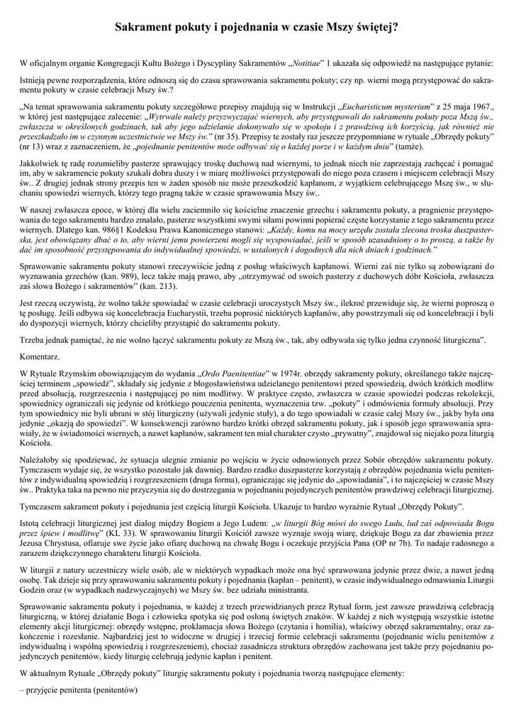 Sakrament pokuty i pojednania w czasie Mszy świętej? W oficjalnym organie Kongregacji Kultu Bożego i Dyscypliny Sakramentów „Notitiae” 1 ukazała się odpowiedź na następujące pytanie: Istnieją pewne rozporządzenia, które odnoszą się do czasu sprawowania sakramentu pokuty; czy np. wierni mogą przystępować do sakramentu pokuty w czasie celebracji Mszy św.? „Na temat sprawowania sakramentu pokuty szczegółowe przepisy znajdują się w Instrukcji „Eucharisticum mysterium” z 25 maja 1967., w której jest następujące zalecenie: „Wytrwale należy przyzwyczajać wiernych, aby przystępowali do sakramentu pokuty poza Mszą św., zwłaszcza w określonych godzinach, tak aby jego udzielanie dokonywało się w spokoju i z prawdziwą ich korzyścią, jak również nie przeszkadzało im w czynnym uczestnictwie we Mszy św.” (nr 35). Przepisy te zostały raz jeszcze przypomniane w rytuale „Obrzędy pokuty” (nr 13) wraz z zaznaczeniem, że „pojednanie penitentów może odbywać się o każdej porze i w każdym dniu” (tamże). Jakkolwiek tę radę rozumieliby pasterze sprawujący troskę duchową nad wiernymi, to jednak niech nie zaprzestają zachęcać i pomagać im, aby w sakramencie pokuty szukali dobra duszy i w miarę możliwości przystępowali do niego poza czasem i miejscem celebracji Mszy św.. Z drugiej jednak strony przepis ten w żaden sposób nie może przeszkodzić kapłanom, z wyjątkiem celebrującego Mszę św., w słuchaniu spowiedzi wiernych, którzy tego pragną także w czasie sprawowania Mszy św.. W naszej zwłaszcza epoce, w której dla wielu zaciemniło się kościelne znaczenie grzechu i sakramentu pokuty, a pragnienie przystępowania do tego sakramentu bardzo zmalało, pasterze wszystkimi swymi siłami powinni popierać częste korzystanie z tego sakramentu przez wiernych. Dlatego kan. 986§1 Kodeksu Prawa Kanonicznego stanowi: „Każdy, komu na mocy urzędu została zlecona troska duszpasterska, jest obowiązany dbać o to, aby wierni jemu powierzeni mogli się wyspowiadać, jeśli w sposób uzasadniony o to proszą, a także by dać im sposobność przystępowania do indywidualnej spowiedzi, w ustalonych i dogodnych dla nich dniach i godzinach.” Sprawowanie sakramentu pokuty stanowi rzeczywiście jedną z posług właściwych kapłanowi. Wierni zaś nie tylko są zobowiązani do wyznawania grzechów (kan. 989), lecz także mają prawo, aby „otrzymywać od swoich pasterzy z duchowych dóbr Kościoła, zwłaszcza zaś słowa Bożego i sakramentów” (kan. 213). Jest rzeczą oczywistą, że wolno także spowiadać w czasie celebracji uroczystych Mszy św., ilekroć przewiduje się, że wierni poproszą o tę posługę. Jeśli odbywa się koncelebracja Eucharystii, trzeba poprosić niektórych kapłanów, aby powstrzymali się od koncelebracji i byli do dyspozycji wiernych, którzy chcieliby przystąpić do sakramentu pokuty. Trzeba jednak pamiętać, że nie wolno łączyć sakramentu pokuty ze Mszą św., tak, aby odbywała się tylko jedna czynność liturgiczna”. Komentarz. W Rytuale Rzymskim obowiązującym do wydania „Ordo Paenitentiae” w 1974r. obrzędy sakramenty pokuty, określanego także najczęściej terminem „spowiedź”, składały się jedynie z błogosławieństwa udzielanego penitentowi przed spowiedzią, dwóch krótkich modlitw przed absolucją, rozgrzeszenia i następującej po nim modlitwy. W praktyce często, zwłaszcza w czasie spowiedzi podczas rekolekcji, spowiednicy ograniczali się jedynie od krótkiego pouczenia penitenta, wyznaczenia tzw. „pokuty” i odmówienia formuły absolucji. Przy tym spowiednicy nie byli ubrani w stój liturgiczny (używali jedynie stuły), a do tego spowiadali w czasie całej Mszy św., jakby była ona jedynie „okazją do spowiedzi”. W konsekwencji zarówno bardzo krótki obrzęd sakramentu pokuty, jak i sposób jego sprawowania sprawiały, że w świadomości wiernych, a nawet kapłanów, sakrament ten miał charakter czysto „prywatny”, znajdował się niejako poza liturgią Kościoła. Należałoby się spodziewać, że sytuacja ulegnie zmianie po wejściu w życie odnowionych przez Sobór obrzędów sakramentu pokuty. Tymczasem wydaje się, że wszystko pozostało jak dawniej. Bardzo rzadko duszpasterze korzystają z obrzędów pojednania wielu penitentów z indywidualną spowiedzią i rozgrzeszeniem (druga forma), ograniczając się jedynie do „spowiadania”, i to najczęściej w czasie Mszy św.. Praktyka taka na pewno nie przyczynia się do dostrzegania w pojednaniu pojedynczych penitentów prawdziwej celebracji liturgicznej. Tymczasem sakrament pokuty i pojednania jest częścią liturgii Kościoła. Ukazuje to bardzo wyraźnie Rytuał „Obrzędy Pokuty”. Istotą celebracji liturgicznej jest dialog między Bogiem a Jego Ludem: „w liturgii Bóg mówi do swego Ludu, lud zaś odpowiada Bogu przez śpiew i modlitwę” (KL 33). W sprawowaniu liturgii Kościół zawsze wyznaje swoją wiarę, dziękuje Bogu za dar zbawienia przez Jezusa Chrystusa, ofiaruje swe życie jako ofiarę duchową na chwałę Bogu i oczekuje przyjścia Pana (OP nr 7b). To nadaje radosnego a zarazem dziękczynnego charakteru liturgii Kościoła. W liturgii z natury uczestniczy wiele osób, ale w niektórych wypadkach może ona być sprawowana jedynie przez dwie, a nawet jedną osobę. Tak dzieje się przy sprawowaniu sakramentu pokuty i pojednania (kapłan – penitent), w czasie indywidualnego odmawiania Liturgii Godzin oraz (w wypadkach nadzwyczajnych) we Mszy św. bez udziału ministranta. Sprawowanie sakramentu pokuty i pojednania, w każdej z trzech przewidzianych przez Rytuał form, jest zawsze prawdziwą celebracją liturgiczną, w której działanie Boga i człowieka spotyka się pod osłoną świętych znaków. W każdej z nich występują wszystkie istotne elementy akcji liturgicznej: obrzędy wstępne, proklamacja słowa Bożego (czytania i homilia), właściwy obrz
