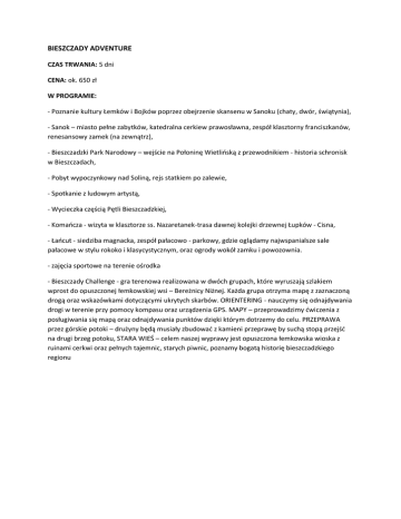 BIESZCZADY ADVENTURE CZAS TRWANIA: 5 dni CENA: ok. 650 zł W PROGRAMIE: - Poznanie kultury Łemków i Bojków poprzez obejrzenie skansenu w Sanoku (chaty, dwór, świątynia), - Sanok – miasto pełne zabytków, katedralna cerkiew prawosławna, zespół klasztorny franciszkanów, renesansowy zamek (na zewnątrz), - Bieszczadzki Park Narodowy – wejście na Połoninę Wietlińską z przewodnikiem - historia schronisk w Bieszczadach, - Pobyt wypoczynkowy nad Soliną, rejs statkiem po zalewie, - Spotkanie z ludowym artystą, - Wycieczka częścią Pętli Bieszczadzkiej, - Komańcza - wizyta w klasztorze ss. Nazaretanek-trasa dawnej kolejki drzewnej Łupków - Cisna, - Łańcut - siedziba magnacka, zespół pałacowo - parkowy, gdzie oglądamy najwspanialsze sale pałacowe w stylu rokoko i klasycystycznym, oraz ogrody wokół zamku i powozownia. - zajęcia sportowe na terenie ośrodka - Bieszczady Challenge - gra terenowa realizowana w dwóch grupach, które wyruszają szlakiem wprost do opuszczonej łemkowskiej wsi – Bereżnicy Niżnej. Każda grupa otrzyma mapę z zaznaczoną drogą oraz wskazówkami dotyczącymi ukrytych skarbów. ORIENTERING - nauczymy się odnajdywania drogi w terenie przy pomocy kompasu oraz urządzenia GPS. MAPY – przeprowadzimy ćwiczenia z posługiwania się mapą oraz odnajdywania punktów dzięki którym dotrzemy do celu. PRZEPRAWA przez górskie potoki – drużyny będą musiały zbudować z kamieni przeprawę by suchą stopą przejść na drugi brzeg potoku, STARA WIEŚ – celem naszej wyprawy jest opuszczona łemkowska wioska z ruinami cerkwi oraz pełnych tajemnic, starych piwnic, poznamy bogatą historię bieszczadzkiego regionu