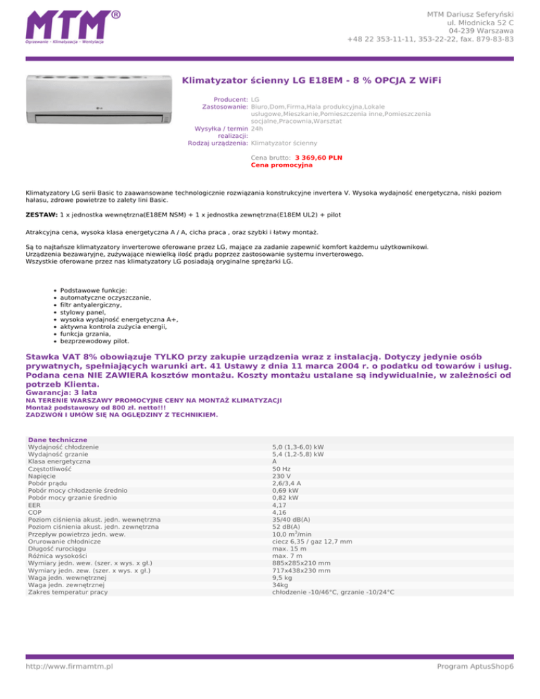 MTM Dariusz Seferyński ul. Młodnicka 52 C 04-239 Warszawa +48 22 353-11-11, 353-22-22, fax. 879-83-83 Klimatyzator ścienny LG E18EM - 8 % OPCJA Z WiFi Producent: LG Zastosowanie: Biuro,Dom,Firma,Hala produkcyjna,Lokale usługowe,Mieszkanie,Pomieszczenia inne,Pomieszczenia socjalne,Pracownia,Warsztat Wysyłka / termin 24h realizacji: Rodzaj urządzenia: Klimatyzator ścienny Cena brutto: 3 369,60 PLN Cena promocyjna Klimatyzatory LG serii Basic to zaawansowane technologicznie rozwiązania konstrukcyjne invertera V. Wysoka wydajność energetyczna, niski poziom hałasu, zdrowe powietrze to zalety lini Basic. ZESTAW: 1 x jednostka wewnętrzna(E18EM NSM) + 1 x jednostka zewnętrzna(E18EM UL2) + pilot Atrakcyjna cena, wysoka klasa energetyczna A / A, cicha praca , oraz szybki i łatwy montaż. Są to najtańsze klimatyzatory inverterowe oferowane przez LG, mające za zadanie zapewnić komfort każdemu użytkownikowi. Urządzenia bezawaryjne, zużywające niewielką ilość prądu poprzez zastosowanie systemu inverterowego. Wszystkie oferowane przez nas klimatyzatory LG posiadają oryginalne sprężarki LG. Podstawowe funkcje: automatyczne oczyszczanie, filtr antyalergiczny, stylowy panel, wysoka wydajność energetyczna A+, aktywna kontrola zużycia energii, funkcja grzania, bezprzewodowy pilot. Stawka VAT 8% obowiązuje TYLKO przy zakupie urządzenia wraz z instalacją. Dotyczy jedynie osób prywatnych, spełniających warunki art. 41 Ustawy z dnia 11 marca 2004 r. o podatku od towarów i usług. Podana cena NIE ZAWIERA kosztów montażu. Koszty montażu ustalane są indywidualnie, w zależności od potrzeb Klienta. Gwarancja: 3 lata NA TERENIE WARSZAWY PROMOCYJNE CENY NA MONTAŻ KLIMATYZACJI Montaż podstawowy od 800 zł. netto!!! ZADZWOŃ I UMÓW SIĘ NA OGLĘDZINY Z TECHNIKIEM. Dane techniczne Wydajność chłodzenie Wydajność grzanie Klasa energetyczna Częstotliwość Napięcie Pobór prądu Pobór mocy chłodzenie średnio Pobór mocy grzanie średnio EER COP Poziom ciśnienia akust. jedn. wewnętrzna Poziom ciśnienia akust. jedn. zewnętrzna Przepływ powietrza jedn. wew. Orurowanie chłodnicze Długość rurociągu Różnica wysokości Wymiary jedn. wew. (szer. x wys. x gł.) Wymiary jedn. zew. (szer. x wys. x gł.) Waga jedn. wewnętrznej Waga jedn. zewnętrznej Zakres temperatur pracy http://www.firmamtm.pl Powered by TCPDF (www.tcpdf.org) 5,0 (1,3-6,0) kW 5,4 (1,2-5,8) kW A 50 Hz 230 V 2,6/3,4 A 0,69 kW 0,82 kW 4,17 4,16 35/40 dB(A) 52 dB(A) 10,0 m3/min ciecz 6,35 / gaz 12,7 mm max. 15 m max. 7 m 885x285x210 mm 717x438x230 mm 9,5 kg 34kg chłodzenie -10/46°C, grzanie -10/24°C Program AptusShop6