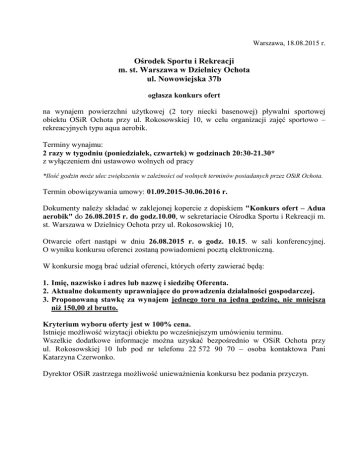 Warszawa, 18.08.2015 r. Ośrodek Sportu i Rekreacji m. st. Warszawa w Dzielnicy Ochota ul. Nowowiejska 37b ogłasza konkurs ofert na wynajem powierzchni użytkowej (2 tory niecki basenowej) pływalni sportowej obiektu OSiR Ochota przy ul. Rokosowskiej 10, w celu organizacji zajęć sportowo – rekreacyjnych typu aqua aerobik. Terminy wynajmu: 2 razy w tygodniu (poniedziałek, czwartek) w godzinach 20:30-21.30* z wyłączeniem dni ustawowo wolnych od pracy *Ilość godzin może ulec zwiększeniu w zależności od wolnych terminów posiadanych przez OSiR Ochota. Termin obowiązywania umowy: 01.09.2015-30.06.2016 r. Dokumenty należy składać w zaklejonej kopercie z dopiskiem "Konkurs ofert – Adua aerobik" do 26.08.2015 r. do godz.10.00, w sekretariacie Ośrodka Sportu i Rekreacji m. st. Warszawa w Dzielnicy Ochota przy ul. Rokosowskiej 10, Otwarcie ofert nastąpi w dniu 26.08.2015 r. o godz. 10.15. w sali konferencyjnej. O wyniku konkursu oferenci zostaną powiadomieni pocztą elektroniczną. W konkursie mogą brać udział oferenci, których oferty zawierać będą: 1. Imię, nazwisko i adres lub nazwę i siedzibę Oferenta. 2. Aktualne dokumenty uprawniające do prowadzenia działalności gospodarczej. 3. Proponowaną stawkę za wynajem jednego toru na jedną godzinę, nie mniejszą niż 150,00 zł brutto. Kryterium wyboru oferty jest w 100% cena. Istnieje możliwość wizytacji obiektu po wcześniejszym umówieniu terminu. Wszelkie dodatkowe informacje można uzyskać bezpośrednio w OSiR Ochota przy ul. Rokosowskiej 10 lub pod nr telefonu 22 572 90 70 – osoba kontaktowa Pani Katarzyna Czerwonko. Dyrektor OSiR zastrzega możliwość unieważnienia konkursu bez podania przyczyn. FORMULARZ OFERTOWY Nazwa i adres Oferenta:………………………………………………………….……………. Adres korespondencyjny;………………………………………………………………..…….. Tel………………………………….. fax…………………….e-mail………………………….. Regon…………………………………...……..NIP…………………………………………… Adres e-mail do korespondencji ……………………..…..@..................................................... Osoba do kontaktu…………………………………………Tel. komórkowy………………… W nawiązaniu do ogłoszenia o konkursie ofert z dnia 18.08.2015 r. na wynajem powierzchni użytkowych w obiekcie Ośrodka Sportu i Rekreacji m. st. Warszawy w Dzielnicy Ochota przy ul. Rokosowskiej 10 w Warszawie: I. II. III. Oświadczam, że spełniam warunki udziału niniejszym w postępowaniu. Zobowiązuję się do prowadzenia działalności obligatoryjnej wskazanej w niniejszym ogłoszeniu. Proponuję stawkę ………….………. zł brutto za wynajem 1 toru na 1 godzinę (słownie ……………………………………………………………………. złotych). ................................. (miejscowość) ……………….. 2015 r. (data) …………………………………………… (Podpis i pieczątka imienna osoby/osób upoważnionych do reprezentowania Oferenta)
