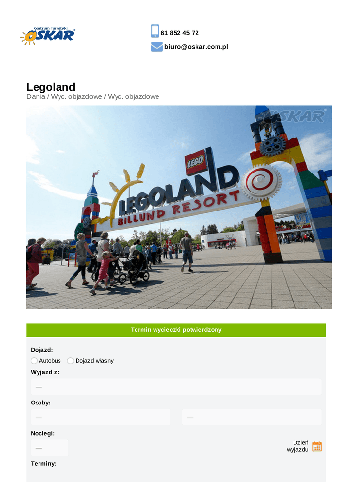 61 852 45 72 [email protected] Legoland Dania / Wyc. objazdowe / Wyc. objazdowe Termin wycieczki potwierdzony Dojazd: Autobus Dojazd własny Wyjazd z: Osoby: Noclegi: Dzień wyjazdu Terminy: Pokój: Wyżywienie: Najtańsza oferta Zaliczka do 11 marca 2017: 99,00 zł do 11 marca 2017: 99,00 zł Suma: 99,00 zł Opis oferty Miejscowość Legoland Duński Park Legoland w Billund jest najstarszym i największym parkiem wśród wszystkich Parków Opinie Logoland na świecie. Park został otwarty w 1968 roku. Rocznie przyciąga około 1,8 mln odwiedzających w różnym wieku i jest tym samym największą duńską atrakcją turystyczną poza Kopenhagą. Wszystko w Rozkład Bilund jazdy jest zbudowane z klocków Lego, a obserwowane z wysokości przypomina miasteczko. Legoland W Legolandzie znajdują się różne atrakcje, między innymi miniatury autentycznych budowli (stadion drużyny FC Kopenhaga, Pałac Królewski, olbrzymi posąg Indianina, statua wolności i inne miniatury, związane zwłaszcza z tematyką duńską), karuzele, kina. Ponadto organizowane są także spektakle z udziałem aktorów. W Legolandzie znajduje się również ponad 30-metrowej wysokości kolejka górska oraz hotel o nazwie "Hotel Legoland". Park zajmuje powierzchnię 123 000 m2. Park podzielony jest na kilka krain tematycznych- DUPLO® Land, Imagination Zone, LEGOREDO® Town, Adventure Land, Miniland, Pirate Land, Polar Land, Knights Kingdom. Zakwaterowanie Oferta nie obejmuje zakwaterowania. Ubezpieczenie Warunki ubezpieczenia Bezpieczne Podróże Signal Iduna dokument do pobrania www.oskar.com.pl/zalaczniki/owu Warunki ubezpieczenia Kosztów Imprezy Turystycznej Signal Iduna dokument do pobrania www.oskar.com.pl/zalaczniki/owurg Pakiet KOMFORT gwarancja wyboru miejsca w autokarze napoje w autokarze w cenie (6 x do wyboru: kawa, herbata, zimny napój 0,2l) cena: 50 zł/os Pakiet PRESTIGE gwarancja wyboru miejsca w autokarze napoje w autokarze w cenie (6 x do wyboru: kawa, herbata, zimny napój 0,2l) pierwszeństwo wejścia na pokład autokaru nadbagaż 5 kg w cenie napoje do obiadokolacji (0,2l) cena: 100 zł/os Karta Dużej Rodziny www.oskar.com.pl/zalaczniki/karta_duzej_rodziny Warunki promocji FIRST MINUTE www.oskar.com.pl/zalaczniki/warunki_promocji Turystyczny Fundusz Gwarancyjny W związku z powołaniem do życia w dniu 26.11.2016 Turystycznego Funduszu Gwarancyjnego każdy klient Biura Podróży Oskar zobowiązany jest do zapłaty kwoty w wysokości 10zł/os. przy każdorazowej rezerwacji imprezy turystycznej (obowiązuje od dnia 26.11.2016). Kwota przeznaczona na Turystyczny Fundusz Gwarancyjny zostanie automatycznie doliczona do wartości rezerwacji (w momencie jej dokonania). Wyjątkiem są imprezy turystyczne odbywające się w krajach posiadających granicę z Rzeczpospolitą Polską. Składka nie jest przychodem biura. DWUpak i TRZYpak DWUpak z rabatem do 25% na osobe TRZYpak z rabatem do 50% na osobe Promocja obowiązuje przy zakupie 2 lub 3 spośród typów ofert: Karnawał w Wenecji, Wyspa Tropikalna, Legoland, Heide Park, Alzacja: Strasburg + Colmar, Festiwal Tulipanów i Amsterdam, Parada Kwiatów, Hamburg + Kraina M iniatur, Kopenhaga + Ogrody Tivoli, Salzburg i Hallstatt, Wodospad Rheinfall i Wyspa M ainau. Rabat naliczany jest od ceny podstawowej i dotyczy najtańszej spośród wybranych ofert. Istnieje możliwość dowolnej kombinacji rezerwacji wyjazdów przy zalożeniu, że dane osobowe uczestników nie ulegają zmianie. Udogodnienia Klimatyzacja Animacje dla dzieci Regulowane fotele Tacki Zawodowy kierowca Pasy bezpieczeństwa Toaleta w autokarze Podnóżki Dla rodzin z dziećmi Bez paszportu Program ramowy Dzień 1 (piątek) Wyjazd wg. rozkładu jazdy, nocny przejazd przez Niemcy. Dzień 2 (sobota) Przyjazd do Billund. Całodzienny pobyt w krainie zabawy i przygód. Markę klocków Lego znają wszyscy. W parku każdy znajdzie coś dla siebie, zarówno dzieci, jak i dorośli, spędzą tam fantastyczny dzień. Wrażenie robią modele słynnych obiektów, zachwyca park miniatur ze znanymi budynkami, stolicami, miastami, wioskami, zbudowany z 20 mln klocków oraz miasteczko z Dzikiego Zachodu, gdzie spotkać można poszukiwaczy złota, kowbojów, Indian, szeryfa, a także udać się na przejażdżkę pociągiem lub canoe. W Strefie Wyobraźni znajduje się akwarium i największe w Skandynawii kino 4D. W godzinach wieczornych wyjazd w drogę powrotną. Nocny przejazd przez Niemcy. Dzień 3 (niedziela) Przyjazd do Polski. Cena obejmuje przejazd autokarem klasy LUX (klimatyzacja, cafe - bar, DVD, WC) opiekę pilota w czasie podróży ubezpieczenie SIGNAL IDUNA (KL 10000 euro, NNW 10000 zł, BP 500 zł) Cena nie obejmuje Dopłaty wymagane na miejscu bilet wstępu do Legoland 45 euro/os; płatne obowiązkowo u pilota w autokarze Informacje dodatkowe dokument tożsamości: paszport lub dowód osobisty Chcesz wiedzieć szybciej? Polub nas na facebooku OSKAR Sp. z o.o. pl.Wolności 2/4c, 61-738 Poznań Potrzebujesz pomocy? Zadzwoń lub napisz: 61 852 45 72 [email protected] Zadzwoń Projekt i wdrożenie: Simply User