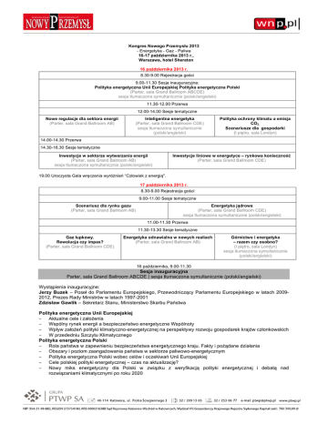Kongres Nowego Przemysłu 2013 - Energetyka - Gaz - Paliwa 16-17 października 2013 r., Warszawa, hotel Sheraton 16 października 2013 r. 8.30-9.00 Rejestracja gości 9.00-11.30 Sesja inauguracyjna: Polityka energetyczna Unii Europejskiej Polityka energetyczna Polski (Parter, sala Grand Ballroom ABCDE) sesja tłumaczona symultanicznie (polski/angielski) 11.30-12.00 Przerwa 12.00-14.00 Sesje tematyczne Nowe regulacje dla sektora energii (Parter, sala Grand Ballroom AB) Inteligentna energetyka (Parter, sala Grand Ballroom CDE) sesja tłumaczona symultanicznie (polski/angielski) Polityka ochrony klimatu a emisja CO2. Scenariusze dla gospodarki (I piętro, sala Londyn) 14.00-14.30 Przerwa 14.30-16.30 Sesje tematyczne Inwestycje w sektorze wytwarzania energii (Parter, sala Grand Ballroom AB) sesja tłumaczona symultanicznie (polski/angielski) Inwestycje liniowe w energetyce – rynkowa konieczność (Parter, sala Grand Ballroom CDE) 19.00 Uroczysta Gala wręczenia wyróżnień “Człowiek z energią". 17 października 2013 r. 8.30-9.00 Rejestracja gości 9.00-11.00 Sesje tematyczne Scenariusz dla rynku gazu (Parter, sala Grand Ballroom AB) Energetyka jądrowa (Parter, sala Grand Ballroom CDE) sesja tłumaczona symultanicznie (polski/angielski) 11.00-11.30 Przerwa 11.30-13.30 Sesje tematyczne Gaz łupkowy. Rewolucja czy impas? (Parter, sala Grand Ballroom CDE) Energetyka odnawialna w nowych realiach (Parter, sala Grand Ballroom AB) Górnictwo i energetyka – razem czy osobno? (I piętro, sala Londyn) sesja tłumaczona symultanicznie (polski/angielski) 16 października, 9.00-11.30 Sesja inauguracyjna Parter, sala Grand Ballroom ABCDE | sesja tłumaczona symultanicznie (polski/angielski) Wystąpienia inauguracyjne: Jerzy Buzek – Poseł do Parlamentu Europejskiego, Przewodniczący Parlamentu Europejskiego w latach 20092012, Prezes Rady Ministrów w latach 1997-2001 Zdzisław Gawlik – Sekretarz Stanu, Ministerstwo Skarbu Państwa Polityka energetyczna Unii Europejskiej − Aktualne cele i założenia − Wspólny rynek energii a bezpieczeństwo energetyczne Wspólnoty − Wpływ założeń polityki klimatyczno-energetycznej na perspektywy rozwoju gospodarek krajów członkowskich − W przededniu Szczytu Klimatycznego Polityka energetyczna Polski − Rola państwa w zapewnieniu bezpieczeństwa energetycznego kraju. Fakty i pożądane działania − Obszary i poziom zaangażowania państwa w sektorze paliwowo-energetycznym − Polityka energetyczna Polski wobec celów i oczekiwań Unii Europejskiej − Cele polskiej polityki energetycznej – czas na aktualizację? − Nowy miks energetyczny dla Polski w związku z weryfikacją polityki energetycznej i debatą nad rozwiązaniami klimatycznymi po roku 2020 Energetyka atomowa – rewizja terminu czy zamrożenie projektu? Bezpieczeństwo energetyczne, korzystne ceny, nowe inwestycje – pożądany scenariusz rozwoju polskiego sektora elektroenergetycznego − Polityka energetyczna Polski w kontekście inwestycji w państwach sąsiadujących z naszym krajem Udział w dyskusji zapowiedzieli (kolejność alfabetyczna): Ireneusz Łazor – Prezes Zarządu, Towarowa Giełda Energii SA; Henryk Majchrzak – Prezes Zarządu, Polskie Sieci Elektroenergetyczne SA; Jacek Murawski – Wiceprezes Zarządu ds. Finansowych i IT, PGNiG SA; Paweł Olechnowicz – Prezes Zarządu, Dyrektor Generalny, Grupa LOTOS SA; Wojciech Ostrowski – Wiceprezes, PGE Polska Grupa Energetyczna SA; Janusz Steinhoff – Wicepremier, Minister Gospodarki w latach 1997-2001; Robert Stelmaszczyk – Prezes Zarządu, RWE Stoen Operator Sp. z o.o.; Krzysztof Zamasz – Prezes Zarządu, ENEA SA Moderator: Wojciech Kuśpik – Prezes Zarządu, PTWP SA, Wydawca Miesięcznika Gospodarczego Nowy Przemysł oraz portalu wnp.pl − − 16 października, 12.00-14.00 Nowe regulacje dla sektora energii Parter, sala Grand Ballroom AB − Mały i duży trójpak konstytucją polskiej energetyki − Systemy wsparcia odnawialnych źródeł energii − Rynek mocy Udział w dyskusji zapowiedzieli (kolejność alfabetyczna): Andrzej Czerwiński – Poseł na Sejm RP, Przewodniczący, Parlamentarny Zespół ds. Energetyki; Andrzej Gajewski – Prezes Zarządu, PGNiG Termika SA; Grzegorz Górski – Prezes Zarządu, GDF SUEZ Energia Polska SA, Członek Zarządu, GDF SUEZ Energy Europe; Ireneusz Łazor – Prezes Zarządu, Towarowa Giełda Energii SA; Michał Srebrzyński – Dyrektor ds. Sprzedaży i Origination, Alpiq Energy SE Spółka Europejska Oddział w Polsce; Jacek Szymczak – Prezes Zarządu, Izba Gospodarcza Ciepłownictwo Polskie Moderator: Jacek Giziński – Radca Prawny, Partner, DLA Piper Wiater sp. k. 16 października, 12.00-14.00 Inteligentna energetyka Parter, sala Grand Ballroom CDE | sesja tłumaczona symultanicznie (polski/angielski) − Smart metering i smart grid – doświadczenia zagraniczne i krajowe − Smart cities − Koszty wdrożeń, potencjalne korzyści i beneficjenci, zagrożenia i bariery − Inteligentne zarządzanie w energetyce – efektywność procesów biznesowych − Obsługa klienta w oparciu o nowoczesne standardy, technologie i narzędzia informatyczne − Inteligentne zarządzanie zasobami i infrastrukturą w sektorze energetycznym (kadry, informacja, koszty i zakupy) − Warunki, które zapewnią efektywność funkcjonowania inteligentnych rozwiązań w energetyce Udział w dyskusji zapowiedzieli (kolejność alfabetyczna): Maciej Bando – Wiceprezes, Urząd Regulacji Energetyki; Mirosław Czarnecki – Dyrektor Regionalny, Europa Środkowo-Wschodnia, Intergraph Process, Power & Marine Division, Intergraph Polska Sp. z o.o.; Jacek Murawski – Wiceprezes Zarządu ds. Finansowych i IT, PGNiG SA; Grzegorz Onichimowski – Prezes Zarządu, WSEInfoEngine SA, Prezes Zarządu Towarowej Giełdy Energii SA w latach 2002-2012; Michael Wolf – Managing Director, PSI Energie EE Moderator: Ireneusz Chojnacki – Redaktor, Miesięcznik Gospodarczy Nowy Przemysł, port