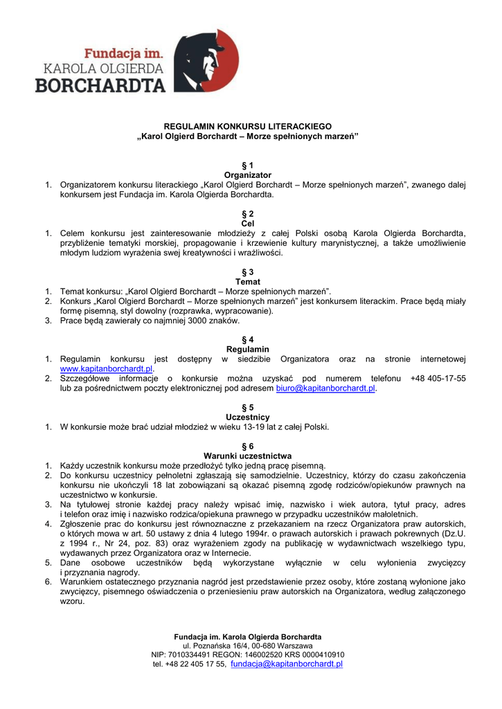 REGULAMIN KONKURSU LITERACKIEGO „Karol Olgierd Borchardt – Morze spełnionych marzeń” §1 Organizator 1. Organizatorem konkursu literackiego „Karol Olgierd Borchardt – Morze spełnionych marzeń”, zwanego dalej konkursem jest Fundacja im. Karola Olgierda Borchardta. §2 Cel 1. Celem konkursu jest zainteresowanie młodzieży z całej Polski osobą Karola Olgierda Borchardta, przybliżenie tematyki morskiej, propagowanie i krzewienie kultury marynistycznej, a także umożliwienie młodym ludziom wyrażenia swej kreatywności i wrażliwości. §3 Temat 1. Temat konkursu: „Karol Olgierd Borchardt – Morze spełnionych marzeń”. 2. Konkurs „Karol Olgierd Borchardt – Morze spełnionych marzeń” jest konkursem literackim. Prace będą miały formę pisemną, styl dowolny (rozprawka, wypracowanie). 3. Prace będą zawierały co najmniej 3000 znaków. §4 Regulamin w siedzibie 1. Regulamin konkursu jest dostępny Organizatora oraz na stronie internetowej www.kapitanborchardt.pl. 2. Szczegółowe informacje o konkursie można uzyskać pod numerem telefonu +48 405-17-55 lub za pośrednictwem poczty elektronicznej pod adresem [email protected]. §5 Uczestnicy 1. W konkursie może brać udział młodzież w wieku 13-19 lat z całej Polski. 1. 2. 3. 4. 5. 6. §6 Warunki uczestnictwa Każdy uczestnik konkursu może przedłożyć tylko jedną pracę pisemną. Do konkursu uczestnicy pełnoletni zgłaszają się samodzielnie. Uczestnicy, którzy do czasu zakończenia konkursu nie ukończyli 18 lat zobowiązani są okazać pisemną zgodę rodziców/opiekunów prawnych na uczestnictwo w konkursie. Na tytułowej stronie każdej pracy należy wpisać imię, nazwisko i wiek autora, tytuł pracy, adres i telefon oraz imię i nazwisko rodzica/opiekuna prawnego w przypadku uczestników małoletnich. Zgłoszenie prac do konkursu jest równoznaczne z przekazaniem na rzecz Organizatora praw autorskich, o których mowa w art. 50 ustawy z dnia 4 lutego 1994r. o prawach autorskich i prawach pokrewnych (Dz.U. z 1994 r., Nr 24, poz. 83) oraz wyrażeniem zgody na publikację w wydawnictwach wszelkiego typu, wydawanych przez Organizatora oraz w Internecie. Dane osobowe uczestników będą wykorzystane wyłącznie w celu wyłonienia zwycięzcy i przyznania nagrody. Warunkiem ostatecznego przyznania nagród jest przedstawienie przez osoby, które zostaną wyłonione jako zwycięzcy, pisemnego oświadczenia o przeniesieniu praw autorskich na Organizatora, według załączonego wzoru. Fundacja im. Karola Olgierda Borchardta ul. Poznańska 16/4, 00-680 Warszawa NIP: 7010334491 REGON: 146002520 KRS 0000410910 tel. +48 22 405 17 55, [email protected] 7. Organizator zastrzega sobie prawo do nieodpłatnego reprodukowania prac konkursowych w celach reklamowych (w prasie, telewizji, katalogach i plakatach wystaw oraz we wszelakich innych wydawnictwach). 8. Organizator zastrzega sobie prawo do wykorzystania prac zgłoszonych do konkursu w aukcji, z której dochód będzie przeznaczony na rzecz Fundacji im. Karola Olgierda Borchardta. §7 Termin i warunki dostarczania prac 1. Prace należy przesłać pocztą na adres Organizatora: Fundacja im. Karola Olgierda Borchardta Ul. Poznańska 16/4 00-680 Warszawa z dopiskiem: „Konkurs literacki” w terminie do 15 marca 2015 roku. 2. Organizator zastrzega sobie prawo wydłużenia terminu nadsyłania prac. 3. Prace nadesłane po terminie nie brały udziału w konkursie. 4. Organizator nie ponosi odpowiedzialności za uszkodzenia powstałe podczas przesyłki. 5. Prace przechodzą na własność Organizatora i nie będą odsyłane. 1. 2. 3. 4. 5. 6. 7. 8. 9. 10. 11. 12. §8 Zasady przyznawania nagród O wyłonieniu zwycięzców konkursu decyduje powołana w tym celu Komisja Konkursowa, zwana dalej Komisją. Komisję powołuje Organizator. W skład komisji wchodzą Anna Krawczyk, Prezes Zarządu Fundacji; Kpt. Krzysztof Mazurkiewicz, Kapitan żaglowca STS Kapitan Borchardt; Agnieszka Szustowska, przedstawiciel Biura Żaglowca. Prace nie spełniające warunków regulaminowych nie będą oceniane przez Komisję. Organizator przyzna laureatom konkursu nagrodę w postaci rejsu na żaglowcu STS Kapitan Borchardt przewidzianego jak następuje: na trasie: Gibraltar (Malaga) – Porto – La Coruña – Falmouth – Gdańsk, w terminie: 24.04.2015 - 24.05.2015. Organizator zastrzega sobie prawo do wszelkich zmian w zakresie trasy i terminu rejsu wynikłych z niezależnych od niego czynników, takich jak niekorzystne działanie warunków atmosferycznych, siły wyższej, bądź osób trzecich. Nagroda nie obejmuje transportu do miejsca zaokrętowania (Gibraltar) oraz z miejsca wyokrętowania (Gdańsk) do miejsca zamieszkania laureata. Laureat jest zobowiązany pokryć koszty transportu we własnym zakresie. Komisja dokona wyboru co najmniej 10, maksymalnie 30 najlepszych prac konkursowych (liczba nagrodzonych prac zależy od wsparcia sponsorów). Wszyscy uczestnicy konkursu otrzymają pamiątkowe dyplomy. Laureaci konkursu zostaną powiadomieni o przyznaniu nagród pisemnie. Decyzja Komisji jest ostateczna i nieodwołalna. Informacja o terminie i miejscu wręczania nagród zostanie podana po rozstrzygnięciu konkursu na stronie internetowej Organizatora. Laureaci konkursu, którzy nie będą mogli uczestniczyć w uroczystości wręczenia nagród, będą mogli odebrać nagrody w terminie późniejszym. Nagroda specjalna – rejs na żaglowcu STS Kapitan Borchardt przepada o ile laureat tej nagrody nie będzie mógł w nim wziąć udziału. §9 Postanowienia Końcowe 1. Dane osobowe uczestników Konkursu będą wykorzystane zgodnie z ustawą z dnia 29 sierpnia 1997 roku o ochronie danych osobowych (Dz. U.Nr.133. poz. 883 ze zm.) 2. Udział w Konkursie oznacza zgodę jego uczestnika na warunki określone w niniejszym Regulaminie. Fundacja im. Karola Olgierda Borchardta ul. Poznańska 16/4, 00-680 Warszawa NIP: 7010334491 REGON: 146002520 KRS 0000410910 tel. +48 22 405 17 55, [email pr