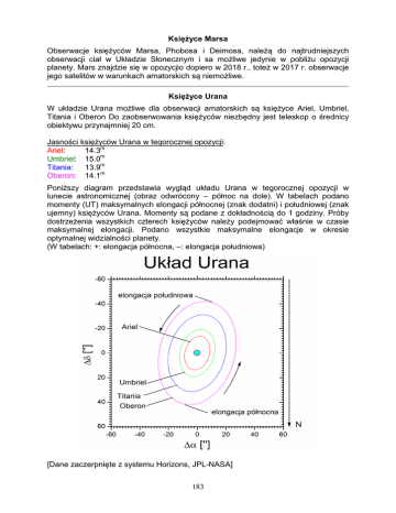 Księżyce Marsa Obserwacje księżyców Marsa, Phobosa i Deimosa, należą do najtrudniejszych obserwacji ciał w Układzie Słonecznym i sa możliwe jedynie w pobliżu opozycji planety. Mars znajdzie się w opozycjio dopiero w 2018 r., toteż w 2017 r. obserwacje jego satelitów w warunkach amatorskich są niemożliwe. Księżyce Urana W układzie Urana możliwe dla obserwacji amatorskich są księżyce Ariel, Umbriel, Titania i Oberon Do zaobserwowania księżyców niezbędny jest teleskop o średnicy obiektywu przynajmniej 20 cm. Jasności księżyców Urana w tegorocznej opozycji: Ariel: 14.3m Umbriel: 15.0m Titania: 13.9m Oberon: 14.1m Poniższy diagram przedstawia wygląd układu Urana w tegorocznej opozycji w lunecie astronomicznej (obraz odwrócony – północ na dole). W tabelach podano momenty (UT) maksymalnych elongacji północnej (znak dodatni) i południowej (znak ujemny) księżyców Urana. Momenty są podane z dokładnością do 1 godziny. Próby dostrzeżenia wszystkich czterech księżyców należy podejmować właśnie w czasie maksymalnej elongacji. Podano wszystkie maksymalne elongacje w okresie optymalnej widzialności planety. (W tabelach: +: elongacja północna, –: elongacja południowa) [Dane zaczerpnięte z systemu Horizons, JPL-NASA] 183 Ariel Data IX 15 16 17 18 20 21 22 23 25 26 27 28 30 X 1 2 4 5 godz. elong. h m " 3:00 13.8 9:00 -13.8 15:00 13.8 21:00 -13.8 4:00 13.8 10:00 -13.8 16:00 13.8 22:00 -13.9 05:00 13.8 11:00 -13.9 17:00 13.9 23:00 -13.9 6:00 13.9 12:00 -13.9 18:00 13.9 0:00 -13.9 6:00 13.9 Data X 7 9 10 11 12 14 15 16 17 19 20 21 22 24 25 26 godz. elong. h m " 19:00 13.9 1:00 -13.9 7:00 13.9 14:00 -13.9 20:00 13.9 2:00 -13.9 8:00 13.9 15:00 -13.9 21:00 13.9 3:00 -13.9 9:00 13.9 16:00 -13.9 22:00 13.9 4:00 -13.9 10:00 13.9 17:00 -13.9 Data X 27 29 30 31 XI 2 3 4 5 7 8 9 10 12 13 14 godz. h m 23:00 5:00 11:00 18:00 0:00 6:00 12:00 19:00 1:00 7:00 13:00 20:00 2:00 8:00 14:00 elong. " 13.9 -13.9 13.9 -13.9 13.9 -13.9 13.9 -13.9 13.9 -13.9 13.9 -13.9 13.9 -13.8 13.8 Umbriel Data IX 15 17 19 22 24 26 28 30 X 2 4 godz. elong. h m " 19:00 19.2 21:00 -19.3 23:00 19.2 1:00 -19.3 2:00 19.2 4:00 -19.3 6:00 19.3 8:00 -19.4 9:00 19.3 11:00 -19.4 Data X 6 8 10 12 14 16 18 21 23 25 godz. h m 13:00 14:00 16:00 18:00 20:00 21:00 23:00 1:00 3:00 4:00 184 elong. " 19.3 -19.4 19.3 -19.4 19.3 -19.4 19.4 -19.4 19.3 -19.4 Data X 27 29 31 XI 2 4 6 8 10 12 14 godz. elong. h m " 6:00 19.3 8:00 -19.4 9:00 19.3 11:00 -19.4 13:00 19.3 15:00 -19.4 16:00 19.3 18:00 -19.4 20:00 19.2 22:00 -19.3 Titania Data IX 16 21 25 29 godz. h m 19:00 3:00 12:00 20:00 elong. " -31.5 31.7 -31.6 31.8 Data X 4 8 12 17 21 25 30 godz. elong. h m " 5:00 -31.7 13:00 31.8 21:00 -31.7 6:00 31.9 14:00 -31.7 23:00 31.9 7:00 -31.7 Data godz. elong. h m " XI 3 16:00 31.8 8 0:00 -31.7 12 9:00 31.7 Oberon Data IX 15 21 28 godz. elong. h m " 0:00 41.6 8:00 -42.3 1:00 42.4 Data X 4 11 18 25 31 godz. elong. h m " 19:00 -42.5 12:00 42.5 6:00 -42.5 0:00 42.5 17:00 -42.4 185 Data godz. elong. h m " XI 7 11:00 42.4 14 4:00 -42.3