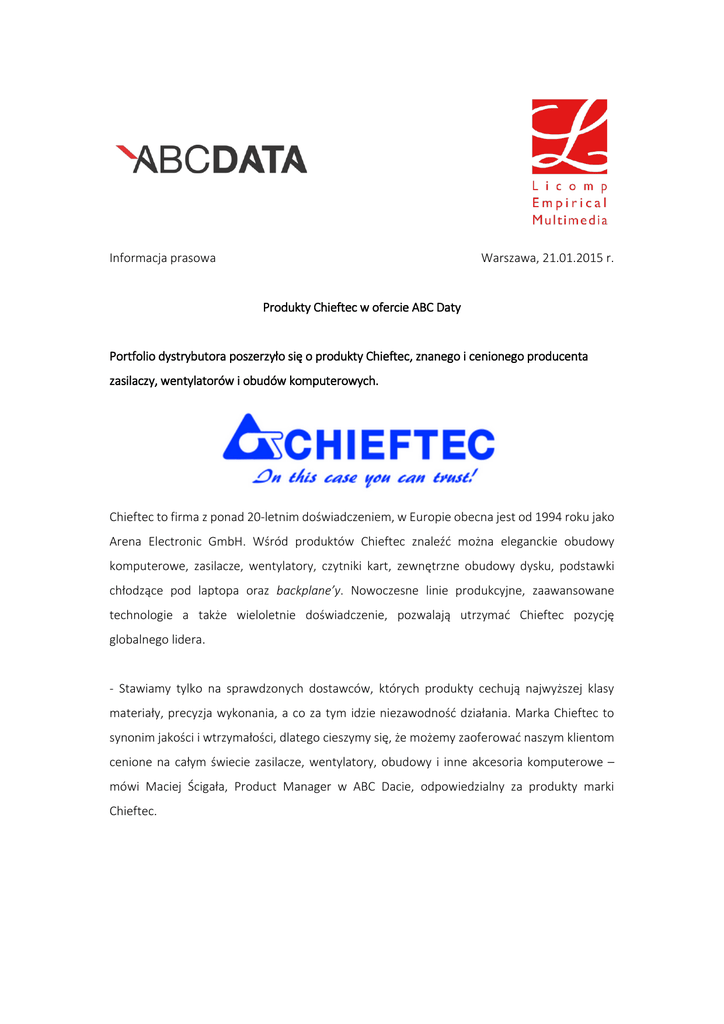 Informacja prasowa Warszawa, 21.01.2015 r. Produkty Chieftec w ofercie ABC Daty Portfolio dystrybutora poszerzyło się o produkty Chieftec, znanego i cenionego producenta zasilaczy, wentylatorów i obudów komputerowych. Chieftec to firma z ponad 20-letnim doświadczeniem, w Europie obecna jest od 1994 roku jako Arena Electronic GmbH. Wśród produktów Chieftec znaleźć można eleganckie obudowy komputerowe, zasilacze, wentylatory, czytniki kart, zewnętrzne obudowy dysku, podstawki chłodzące pod laptopa oraz backplane’y. Nowoczesne linie produkcyjne, zaawansowane technologie a także wieloletnie doświadczenie, pozwalają utrzymać Chieftec pozycję globalnego lidera. - Stawiamy tylko na sprawdzonych dostawców, których produkty cechują najwyższej klasy materiały, precyzja wykonania, a co za tym idzie niezawodność działania. Marka Chieftec to synonim jakości i wtrzymałości, dlatego cieszymy się, że możemy zaoferować naszym klientom cenione na całym świecie zasilacze, wentylatory, obudowy i inne akcesoria komputerowe – mówi Maciej Ścigała, Product Manager w ABC Dacie, odpowiedzialny za produkty marki Chieftec. Kontrakt dystrybucyjny pomiędzy firmami ABC Data S.A. i Arena Electronic GmbH zapewnia stały dostęp do wszystkich produktów oferowanych przez producenta na rynku polskim. Stanowi również gwarancję autentyczności produktów Chieftec sprzedawanych przez dystrybutora w ramach zawartej umowy. O ABC Data S.A. ABC Data S.A. jest liderem rynku dystrybucji sprzętu IT i elektroniki użytkowej w Polsce oraz jedynym podmiotem działającym bezpośrednio w dziewięciu państwach Europy Środkowej i Wschodniej (należących do UE). Firma od ponad 20 lat oferuje sprzęt komputerowy, oprogramowanie i elektronikę użytkową. ABC Data dysponuje największą na rynku ofertą ponad 56 tys. produktów ponad 300 renomowanych dostawców. W czerwcu 2011 r. ABC Data S.A. rozpoczęła sprzedaż produktów pod własną marką Colorovo oferując m.in. tablety CityTab, smartfony CityTone, przenośne baterie do ładowania urządzeń mobilnych PowerBox, atramenty i tonery do drukarek. W lutym 2014 r. ABC Data po raz piąty na przestrzeni sześciu lat otrzymała nagrodę EMEA Channel Academy 2014 dla najlepszego dystrybutora regionu Europy Środkowo-Wschodniej. Osoba do kontaktu: Anna Klinowska ABC Data S.A. [email protected] +48 605 503 742