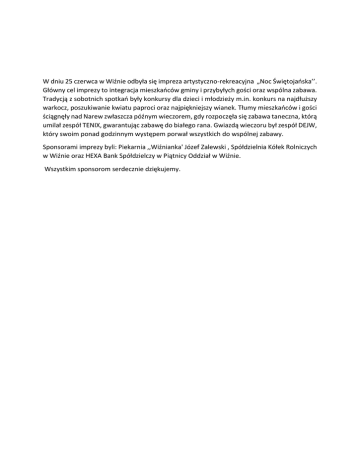 W dniu 25 czerwca w Wiźnie odbyła się impreza artystyczno-rekreacyjna „Noc Świętojańska’’. Główny cel imprezy to integracja mieszkańców gminy i przybyłych gości oraz wspólna zabawa. Tradycją z sobotnich spotkań były konkursy dla dzieci i młodzieży m.in. konkurs na najdłuższy warkocz, poszukiwanie kwiatu paproci oraz najpiękniejszy wianek. Tłumy mieszkańców i gości ściągnęły nad Narew zwłaszcza późnym wieczorem, gdy rozpoczęła się zabawa taneczna, którą umilał zespół TENIX, gwarantując zabawę do białego rana. Gwiazdą wieczoru był zespół DEJW, który swoim ponad godzinnym występem porwał wszystkich do wspólnej zabawy. Sponsorami imprezy byli: Piekarnia ,,Wiźnianka' Józef Zalewski , Spółdzielnia Kółek Rolniczych w Wiźnie oraz HEXA Bank Spółdzielczy w Piątnicy Oddział w Wiźnie. Wszystkim sponsorom serdecznie dziękujemy.