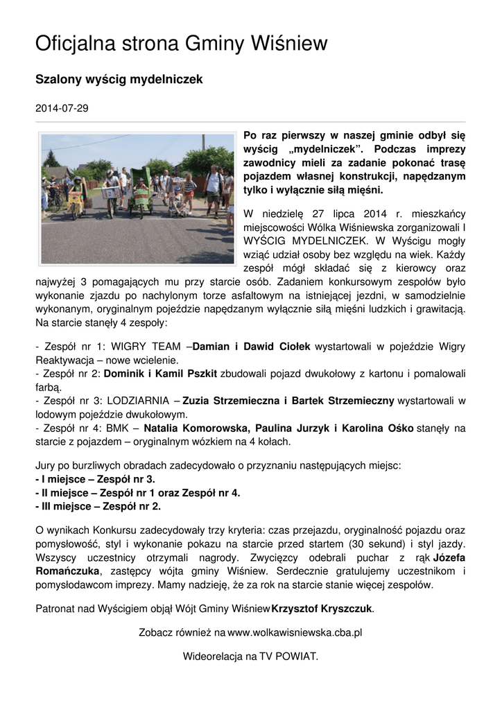 Oficjalna strona Gminy Wiśniew Szalony wyścig mydelniczek 2014-07-29 Po raz pierwszy w naszej gminie odbył się wyścig „mydelniczek”. Podczas imprezy zawodnicy mieli za zadanie pokonać trasę pojazdem własnej konstrukcji, napędzanym tylko i wyłącznie siłą mięśni. W niedzielę 27 lipca 2014 r. mieszkańcy miejscowości Wólka Wiśniewska zorganizowali I WYŚCIG MYDELNICZEK. W Wyścigu mogły wziąć udział osoby bez względu na wiek. Każdy zespół mógł składać się z kierowcy oraz najwyżej 3 pomagających mu przy starcie osób. Zadaniem konkursowym zespołów było wykonanie zjazdu po nachylonym torze asfaltowym na istniejącej jezdni, w samodzielnie wykonanym, oryginalnym pojeździe napędzanym wyłącznie siłą mięśni ludzkich i grawitacją. Na starcie stanęły 4 zespoły: - Zespół nr 1: WIGRY TEAM –Damian i Dawid Ciołek wystartowali w pojeździe Wigry Reaktywacja – nowe wcielenie. - Zespół nr 2: Dominik i Kamil Pszkit zbudowali pojazd dwukołowy z kartonu i pomalowali farbą. - Zespół nr 3: LODZIARNIA – Zuzia Strzemieczna i Bartek Strzemieczny wystartowali w lodowym pojeździe dwukołowym. - Zespół nr 4: BMK – Natalia Komorowska, Paulina Jurzyk i Karolina Ośko stanęły na starcie z pojazdem – oryginalnym wózkiem na 4 kołach. Jury po burzliwych obradach zadecydowało o przyznaniu następujących miejsc: - I miejsce – Zespół nr 3. - II miejsce – Zespół nr 1 oraz Zespół nr 4. - III miejsce – Zespół nr 2. O wynikach Konkursu zadecydowały trzy kryteria: czas przejazdu, oryginalność pojazdu oraz pomysłowość, styl i wykonanie pokazu na starcie przed startem (30 sekund) i styl jazdy. Wszyscy uczestnicy otrzymali nagrody. Zwycięzcy odebrali puchar z rąk Józefa Romańczuka, zastępcy wójta gminy Wiśniew. Serdecznie gratulujemy uczestnikom i pomysłodawcom imprezy. Mamy nadzieję, że za rok na starcie stanie więcej zespołów. Patronat nad Wyścigiem objął Wójt Gminy Wiśniew Krzysztof Kryszczuk. Zobacz również na www.wolkawisniewska.cba.pl Wideorelacja na TV POWIAT. Więcej zdjęć w Fotogalerii.