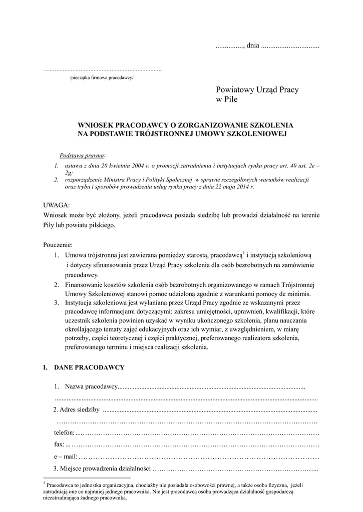 ..............., dnia ................................ ……………………………………………………………….. /pieczątka firmowa pracodawcy/ Powiatowy Urząd Pracy w Pile WNIOSEK PRACODAWCY O ZORGANIZOWANIE SZKOLENIA NA PODSTAWIE TRÓJSTRONNEJ UMOWY SZKOLENIOWEJ Podstawa prawna: 1. 2. ustawa z dnia 20 kwietnia 2004 r. o promocji zatrudnienia i instytucjach rynku pracy art. 40 ust. 2e – 2g; rozporządzenie Ministra Pracy i Polityki Społecznej w sprawie szczegółowych warunków realizacji oraz trybu i sposobów prowadzenia usług rynku pracy z dnia 22 maja 2014 r. UWAGA: Wniosek może być złożony, jeżeli pracodawca posiada siedzibę lub prowadzi działalność na terenie Piły lub powiatu pilskiego. Pouczenie: 1. Umowa trójstronna jest zawierana pomiędzy starostą, pracodawcą 1 i instytucją szkoleniową i dotyczy sfinansowania przez Urząd Pracy szkolenia dla osób bezrobotnych na zamówienie pracodawcy. 2. Finansowanie kosztów szkolenia osób bezrobotnych organizowanego w ramach Trójstronnej Umowy Szkoleniowej stanowi pomoc udzieloną zgodnie z warunkami pomocy de minimis. 3. Instytucja szkoleniowa jest wyłaniana przez Urząd Pracy zgodnie ze wskazanymi przez pracodawcę informacjami dotyczącymi: zakresu umiejętności, uprawnień, kwalifikacji, które uczestnik szkolenia powinien uzyskać w wyniku ukończonego szkolenia, planu nauczania określającego tematy zajęć edukacyjnych oraz ich wymiar, z uwzględnieniem, w miarę potrzeby, części teoretycznej i części praktycznej, preferowanego realizatora szkolenia, preferowanego terminu i miejsca realizacji szkolenia. I. DANE PRACODAWCY 1. Nazwa pracodawcy................................................................................................................ ............................................................................................................................................................. 2. Adres siedziby ................................................................................................................................ ……………………………………………………………………………………………………… telefon: ..... …………………………………………………………………………………………… fax: ... ………………………………………………………………………………………………… e – mail: ……………………………………………………………………………………… 3. Miejsce prowadzenia działalności ………………………………………………………………... Pracodawca to jednostka organizacyjna, chociażby nie posiadała osobowości prawnej, a także osoba fizyczna, jeżeli zatrudniają one co najmniej jednego pracownika. Nie jest pracodawcą osoba prowadząca działalność gospodarczą niezatrudniająca żadnego pracownika. 1 ……………………………………………………………………………………………………….. 4. Numer REGON ..... ……………………………………………………………………………… 5. Numer NIP .... …………………………………………………………………………………… 6. Numer KRS (w przypadku spółek handlowych i kapitałowych)……………………………………………... 7. Data rozpoczęcia prowadzenia działalności gospodarczej (zgodnie z wpisem w odpowiednim rejestrze) ……………………………………………………………………………………………………….. 8. Rodzaj działalności (symbol podklasy prowadzonej działalności określony zgodnie z PKD)………………………. ...................................................................................................... 9. Forma prawna działalności wnioskodawcy ................................................................................... ............................................................................................................................................................. (np. spółdzielnia, Spółka (podać jaka), działalność indywidualna, inna) 10. Imię i nazwisko oraz stanowisko osoby uprawnionej do podpisania umowy ..…………………. ……………………………………………………………………………………………………….. 11. Imię i nazwisko, numer telefonu, adres poczty elektronicznej osoby wskazanej przez pracodawcę do kontaktów z Urzędem ………………………………………………………… …………………………………………………………………………………………………... 12. Liczba zatrudnionych pracowników 2 na dzień składania wniosku …………………………… OŚWIADCZENIE WNIOSKODAWCY Świadomy/a odpowiedzialności karnej za składanie fałszywych zeznań (art. 233 kk) oświadczam, że: 2 Pracownik zgodnie z art. 2 ustawy z dnia 26 czerwca 1974 r. – Kodeks Pracy to osoba zatrudniona na podstawie umowy o pracę, powołania, wyboru, mianowania lub spółdzielczej umowy o pracę. 1. � Prowadzę działalność gospodarczą / � Nie prowadzę działalności gospodarczej* w rozumieniu przepisów ustawy o swobodzie działalności gospodarczej oraz*: 2. � Zalegam / � Nie zalegam* w dniu złożenia wniosku z wypłacaniem wynagrodzeń pracownikom oraz z opłacaniem należnych składek na ubezpieczenia społeczne, ubezpieczenia zdrowotne, Fundusz Pracy, Fundusz Gwarantowanych Świadczeń Pracowniczych oraz Fundusz Emerytur Pomostowych; 3. � Zalegam* / � Nie zalegam* w dniu złożenia wniosku z opłacaniem innych danin publicznych; 4. � Posiadam* / � Nie posiadam* w dniu złożenia wniosku nieuregulowanych w terminie zobowiązań cywilnoprawnych; 5. � Spełniam warunki /�Nie spełniam warunków / � Nie dotyczy rozporządzenia komisji (UE) Nr 1407/2013 z dnia 18 grud