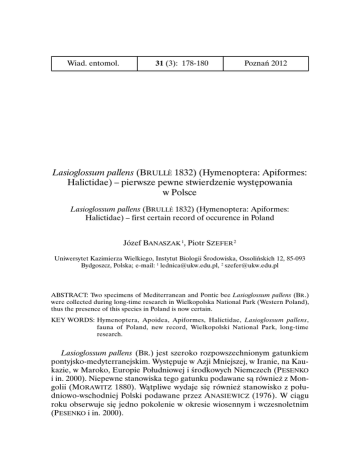 Wiad. entomol. 31 (3): 178-180 Poznań 2012 Lasioglossum pallens (BRULLÈ 1832) (Hymenoptera: Apiformes: Halictidae) – pierwsze pewne stwierdzenie występowania w Polsce Lasioglossum pallens (BRULLÈ 1832) (Hymenoptera: Apiformes: Halictidae) – first certain record of occurence in Poland Józef BANASZAK 1, Piotr SZEFER 2 Uniwersytet Kazimierza Wielkiego, Instytut Biologii Środowiska, Ossolińskich 12, 85-093 Bydgoszcz, Polska; e-mail: 1 [email protected], 2 [email protected] ABSTRACT: Two specimens of Mediterranean and Pontic bee Lasioglossum pallens (BR .) were collected during long-time research in Wielkopolska National Park (Western Poland), thus the presence of this species in Poland is now certain. KEY WORDS: Hymenoptera, Apoidea, Apiformes, Halictidae, Lasioglossum pallens, fauna of Poland, new record, Wielkopolski National Park, long-time research. Lasioglossum pallens (BR.) jest szeroko rozpowszechnionym gatunkiem pontyjsko-medyterranejskim. Występuje w Azji Mniejszej, w Iranie, na Kaukazie, w Maroko, Europie Południowej i środkowych Niemczech (PESENKO i in. 2000). Niepewne stanowiska tego gatunku podawane są również z Mongolii (MORAWITZ 1880). Wątpliwe wydaje się również stanowisko z południowo-wschodniej Polski podawane przez A NASIEWICZ (1976). W ciągu roku obserwuje się jedno pokolenie w okresie wiosennym i wczesnoletnim (P ESENKO i in. 2000). LASIOGLOSSUM PALLENS – [...] STWIERDZENIE WYSTĘPOWANIA W POLSCE 179 Charakterystycznymi cechami budowy samic wyróżniającymi Lasioglossum pallens spośród innych krajowych gatunków z tego rodzaju jest krótka, poprzecznie eliptyczna głowa i rogowo przeświecające tylne części tergitów odwłoka. Sternit V odwłoka u samców posiada bardzo głębokie półkoliste wycięcie na dystalnej krawędzi. W ramach kontynuacji wieloletnich badań zmian fauny pszczół prowadzonych między innymi w Wielkopolskim Parku Narodowym (B ANASZAK 1997; BANASZAK i in. 2003) (zachodnia Polska) zebrano dwa osobniki zidentyfikowane jako Lasioglossum pallens (BR.): – Wielkopolski Park Narodowy, Osowa Góra (UTM: XT29), dąbrowa, 13 V 2008 – 1%, leg. J. BANASZAK; 7 V 2009 - 1&, leg. P. SZEFER, coll. J. BANASZAK. Pomimo tak długo trwających kompleksowych badań w Wielkopolskim Parku Narodowym (zob. także CIERZNIAK 2003) do tej pory nie wykazano tego gatunku z kontrolowanych stanowisk. Okazy odłowiono w zbiorowisku leśnym nawiązującym do świetlistej dąbrowy Potentillo albae-Quercetum. Dokładny opis siedliska znaleźć można w pracy BANASZAKA i in. (2003). Występowanie Lasioglossum pallens (BR.) w Polsce wymagało potwierdzenia. Wcześniej wykazany został z okolic Chełma Lubelskiego (południowo-wschodnia Polska) w trakcie badań nad pszczołami zapylającymi koniczynę czerwoną (ANASIEWICZ 1976). Niemożliwość weryfikacji przez specjalistę taksonoma zebranych okazów kazała poddać w wątpliwość fakt występowania gatunku w kraju, stąd też stanowisko to zostało uznane za prawdopodobne i z taką adnotacją umieszczone w wykazie pszczół Polski (BANASZAK 2000) oraz monografii dotyczącej krajowych Halictidae (P ESENKO i in. 2000). Stwierdzenie Lasioglossum pallens (BR.) w Wielkopolskim Parku Narodowym można zatem uznać za pierwsze pewne stwierdzenie w Polsce. Jedynym podawanym w literaturze pasożytem gniazdowym opisywanego gatunku jest Sphecodes majalis PÈREZ, 1903 nie wykazany dotąd z obszaru Polski, ale możliwe jest także stwierdzenie kleptopasożyta innego gatunku wykorzystującego gniazda Lasioglossum pallens (BR.). SUMMARY Lasioglossum pallens (BR .) is a widely distributed bee species in the Mediterranean and Pontic regions. It was earlier determined in a collection from Chełm near Lublin (SE Poland in 1970s), but has never been confirmed by a specialist, so it still has been considered probable to find in Poland. During long-time research in Wielkopolski National Park (Western Poland) two specimens (male and female) of Lasioglossum pallens (B R.) were found. Consequently this species can be now added to the Checklist of Polish Bees. 180 J. BANASZAK, P. SZEFER Moreover, there is only one known species of cuckoo bee that uses the nests of Lasioglossum pallens (B R.), namely Sphecodes majalis PÈREZ, 1903. It is also highly probable that the mentioned cleptoparasite will be found in Poland or other species associated with Lasioglossum pallens (B R.) will be discovered. PIŚMIENNICTWO ANASIEWICZ A. 1976: Dzikie błonkówki pszczołowate (Apoidea, Hymenoptera) występujące w biocenozie kwitnącej koniczyny czerwonej. Polskie Pismo Entomologiczne, 46: 145-153. BANASZAK J. 1997: Local changes in the population of wild bees. I. Changes in the fauna ten years later. Ochrona Przyrody, 54: 119-130. BANASZAK J. 2000: A checklist of the bee species (Hymenoptera: Apoidea) of Poland, with remarks on their taxonomy and zoogeography: revised version. Fragmenta Faunistica, 43: 135-193. BANASZAK J., C IERZNIAK T., RATYŃSKA H. 2003: Local changes in populations of wild bees (Hymenoptera: Apoidea): 20 years later. Polskie Pismo Entomologiczne, 72: 261-282. CIERZNIAK T. 2003: Changes in bee fauna (Apoidea) of the Wielkopolska National Park over the last half century. Fragmenta Faunistica, 46: 151-170. PESENKO Yu. A., BANASZAK J., CIERZNIAK T. 2002. Błonkówki – Hymenoptera, Pszczołowate – Apidae, Podrodzina – Halictinae. Klucze do oznaczania Owadów Polski, Toruń, XXIV, 68d: 1-111. PESENKO Yu. A., BANASZAK J., RADCHENKO V.G., CIERZNIAK T. 2000: Bees of the family Halictidae (excluding Sphecodes) of Poland. Bydgoszcz University Press, Bydgoszcz. 348 ss.