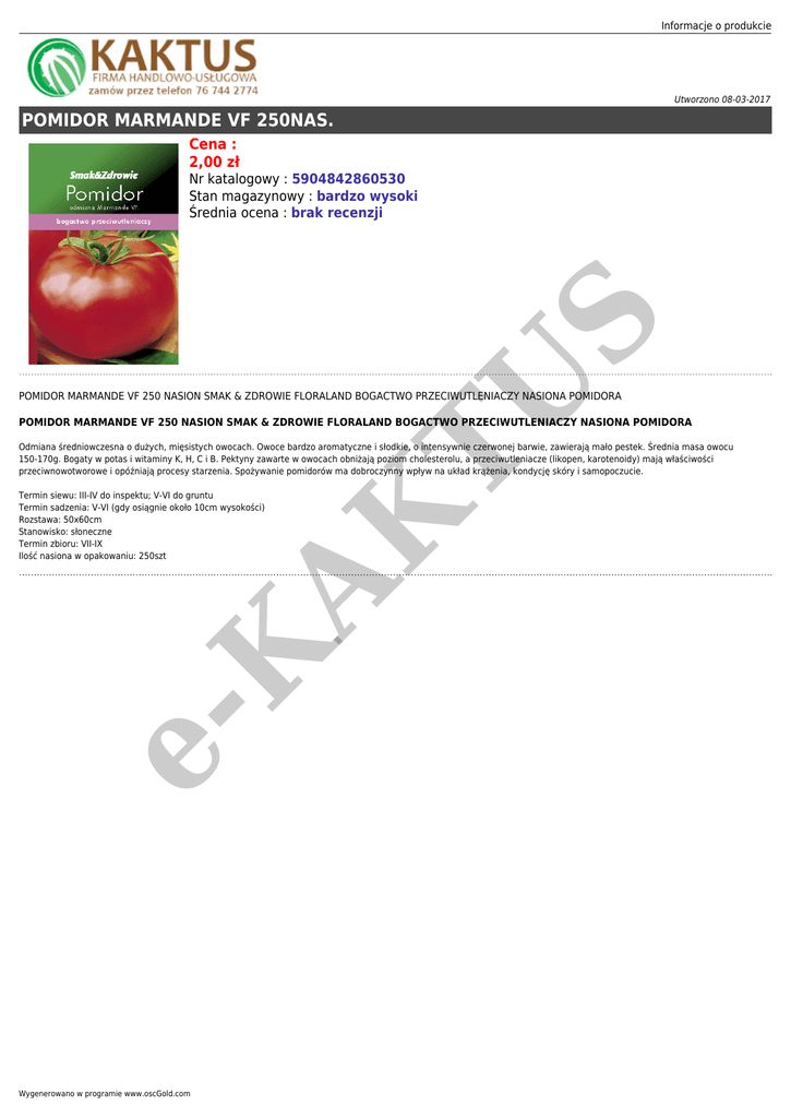 Informacje o produkcie Utworzono 08-03-2017 POMIDOR MARMANDE VF 250NAS. Cena : 2,00 zł AK TU S Nr katalogowy : 5904842860530 Stan magazynowy : bardzo wysoki Średnia ocena : brak recenzji POMIDOR MARMANDE VF 250 NASION SMAK & ZDROWIE FLORALAND BOGACTWO PRZECIWUTLENIACZY NASIONA POMIDORA POMIDOR MARMANDE VF 250 NASION SMAK & ZDROWIE FLORALAND BOGACTWO PRZECIWUTLENIACZY NASIONA POMIDORA Odmiana średniowczesna o dużych, mięsistych owocach. Owoce bardzo aromatyczne i słodkie, o intensywnie czerwonej barwie, zawierają mało pestek. Średnia masa owocu 150-170g. Bogaty w potas i witaminy K, H, C i B. Pektyny zawarte w owocach obniżają poziom cholesterolu, a przeciwutleniacze (likopen, karotenoidy) mają właściwości przeciwnowotworowe i opóźniają procesy starzenia. Spożywanie pomidorów ma dobroczynny wpływ na układ krążenia, kondycję skóry i samopoczucie. eK Termin siewu: III-IV do inspektu; V-VI do gruntu Termin sadzenia: V-VI (gdy osiągnie około 10cm wysokości) Rozstawa: 50x60cm Stanowisko: słoneczne Termin zbioru: VII-IX Ilość nasiona w opakowaniu: 250szt Wygenerowano w programie www.oscGold.com