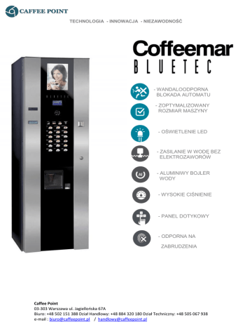 TECHNOLOGIA - INNOWACJA - NIEZAWODNOŚĆ - WANDALOODPORNA BLOKADA AUTOMATU - ZOPTYMALIZOWANY ROZMIAR MASZYNY - OŚWIETLENIE LED - ZASILANIE W WODĘ BEZ ELEKTROZAWORÓW - ALUMINIWY BOJLER WODY - WYSOKIE CIŚNIENIE - PANEL DOTYKOWY - ODPORNA NA ZABRUDZENIA Caffee Point 03-303 Warszawa ul. Jagiellońska 67A Biuro: +48 502 151 388 Dział Handlowy: +48 884 320 180 Dział Techniczny: +48 505 067 938 e-mail : [email protected] / [email protected] TECHNOLOGIA - INNOWACJA - NIEZAWODNOŚĆ COFFEEMAR BLUETEC G546 JOFEMAR VENDING specjalizuje się w projektowaniu, produkcji i sprzedaży rozwiązań sprzedaży i automatycznego dozowania, systemów płatności, telemetrii oraz oprogramowania do zarządzania na rynku Vending. COFFEEMAR BLUETEC G546 to jedyny automat na rynku do gorących napoi który wykorzystuje zawór w jednostce zaparzającej w celu utrzymania stałego poziomu ciśnienia w trakcie parzenia kawy, pozwala to wyodrębnić zapach oraz smak ziaren kawy od pierwszej do ostatniej kropli napoju. Własny moduł mielenia oraz parzenia ziaren kawy, Anty-zbrylający system dozowania cukru pozwala na serwowanie doskonałych w smaku napoi. CECHY • zawór ciśnienia w urządzeniu do zaparzania, aby utrzymać na stałym poziomie ciśnienie podczas całego cyklu parzenia. • kocioł aluminiowy z rezystorem, przykryte sondy ,bez kontaktu z wodą (unikanie powstawanie tlenku wapnia). • dwa modele dozownika kubka, w zależności od średnicy (65-67 mm lub 67-69 mm). • Regulowany dozownik Stir-kij, pomiędzy 75 mm a 115 mm długości. • Samoczyszczący system misek mieszających, wyjścia produktów i miksera montaż: ręczne lub automatyczne (programowalny). • Anty-parowy systemu cukru, dodając bezpośrednio do filiżanki. • Stała kontrola temperatury wody w bojlerze. • Zmotoryzowany dystrybutor wody bez elektrozaworów. • własny moduł ( młynek do ziaren kawy ). • Łatwe czyszczenie i konserwacja wymiennych elementów. • Obudowa stalowa zabezpieczona przed rdzą i odpornym zamkiem, zintegrowany z odpornymi drzwiami • 92 x 53 mm, wyświetlacz graficzny • możliwość zamontowania monitora do wyświetlania reklam lub informacji Caffee Point 03-303 Warszawa ul. Jagiellońska 67A Biuro: +48 502 151 388 Dział Handlowy: +48 884 320 180 Dział Techniczny: +48 505 067 938 e-mail : [email protected] / [email protected] TECHNOLOGIA - INNOWACJA - NIEZAWODNOŚĆ DANE TECHNICZNE COFFEEMAR G 250 Ilość pojemników Ilość wyborów + preselekcja Ilość mixerów Wyświetlacz Wymiary Waga Przyłącze wody Zasilanie Max pobór prądu Protokół wykonawczy Pojemność pojemnika na kawę w ziarnach Pojemność pojemnika na mleko Pojemność pojemnika na czekoladę Pojemność pojemnika Instant 1 Pojemność pojemnika Instant 2 Pojemnośc zbiornika na cukier Pojemnośc podajnika kubków 6 + 1 ziarna kawy 18 +3 4 szt. Graficzny 92 x 35 mm 1825 x 600 x 575 mm 140 kg ¾ cala 230 V/ 50 Hz 1100 Wat MDB/EXE 3570 gr. 2450 gr. 2000 gr. 720 gr. 1500 gr. 3400 gr. 500 szt. OPCJA - Zestaw wewnętrznego zaopatrzenia w wodę, jeden lub dwa zbiorniki 25L - Filtry do wody: anty smakowe . - Telemetria przez GSM lub modem GPRS przy użyciu oprogramowania Jofemar Vending . - Czytnik banknotów Jofemar. - Karty J130 ( płatność karta pracowniczą / kluczem ) Jofemar Caffee Point 03-303 Warszawa ul. Jagiellońska 67A Biuro: +48 502 151 388 Dział Handlowy: +48 884 320 180 Dział Techniczny: +48 505 067 938 e-mail : [email protected] / [email protected]