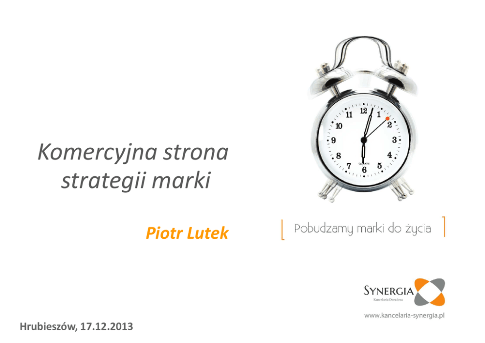 Komercyjna strona strategii marki Piotr Lutek Hrubieszów, 17.12.2013 Cały świat jest marką Marka to pieniądze Dodatkowa marża 140% -,49 € 1,19 € Woda jest ważna ale nie bardzo Nie każdy wizerunek to pieniądze Price Nie wszystkie elementy wizerunku są elementami kapitału... Kapitał marki to podzbiór wizerunku marki, który zapewnia zdolność zmiany krzywej popytu produktu lub usługi (na korzyść lub niekorzyść) Zmiana popytu powinna być celem każdego brandingu $ B ran de d Curve Unbrand ed Curve Share Quantity (share) Brand Equity Marka to przyszłość Jak wskazuje Jesper Kunde, siłą napędową współczesnych gospodarek będą marki posiadające zdolność „uchwycenia” wyjątkowych i niepowtarzalnych z punktu widzenia konsumenta wartości. Regiony posiadające silną markę można określić jako posiadające określony zasób „kapitału”, tym wyższy im większa jest lojalność, świadomość, postrzeganą jakość, silne skojarzenia, utożsamiane z marką wartości. Komunikacja a doświadczanie Marka w komunikacji Wizerunek kreowany przez komunikację Powiedzieć (obiecać) można wszystko Opiera się na perswazji i generowaniu zaufania do marki Marka w doświadczeniu Marka oferująca doświadczenie odbiorcy Wymusza autentyczność (weryfikuje obietnicę marki) Odwołuje się do najsilniejszego kryterium – osobistego doświadczenia odbiorcy Vegas – Miasto Grzechu Szybkie śluby i szybkie rozwody Ponadprzeciętna dawka doznań wieczorów kawalerskich i panieńskich Światowa stolica hazardu Światowa stolica SPA Oglądanie damy już nie starcza Gdzie jest Gotania? Słaba opowieść Atrakcyjna oferta Mało atrakcyjna oferta Silna opowieść UTRACONA WZMACNIAĆ SZANSA I NIE PSUĆ WSZYSTKO DO ZROBIENIA ROZCZAROWUJĄCE DOŚWIADCZENIE Lata nie miesiące „W geologii liczą się siła i czas. Nic więcej” W 1966, po 19 latach, Andy Dufresne uciekł z więzienia w Shawshank Z marką regionu jest dokładnie tak samo