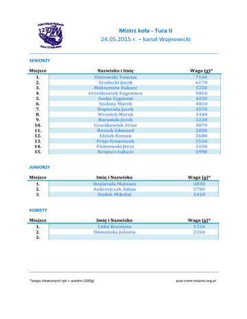 Mistrz koła - Tura II 24.05.2015 r. – kanał Wojnowicki SENIORZY Miejsce 1. 2. 3. 4. 5. 6. 7. 8. 9. 10. 11. 12. 13. 14. 15. Nazwisko i Imię Ostrowski Tomasz Gradecki Jacek Maksymów Łukasz Grześkowiak Eugeniusz Suska Zygmunt Szalony Marek Dopierała Jacek Wesołek Marek Baraniak Jacek Grześkowiak Artur Roszak Edmund Idziak Roman Projs Franciszek Piotrowski Jerzy Kropacz Łukasz Waga (g)* 7140 6170 5250 5010 4220 4010 3570 3340 3220 3070 2850 2680 2510 2150 1990 JUNIORZY Miejsce 1. 2. 3. Imię i Nazwisko Dopierała Mateusz Andrzejczak Adam Dudek Mikołaj Waga (g)* 4830 2780 1410 Imię i Nazwisko Litke Krystyna Domańska Jolanta Waga (g)* 1320 2260 KOBIETY Miejsce 1. 2. 3. *waga złowionych ryb + wiadro (500g) pzw-srem-miasto.org.pl