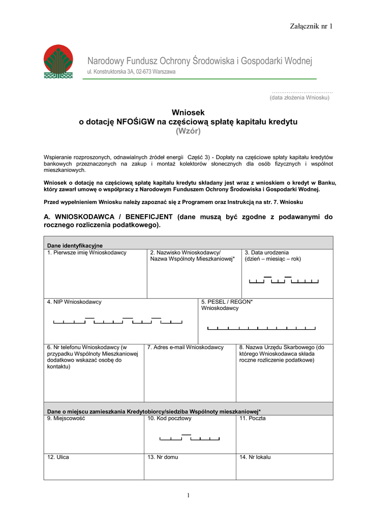 Wniosek o dotację NFOŚiGW na częściową spłatę kapitału kredytu