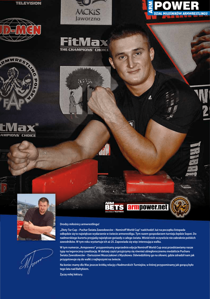 Drodzy miłośnicy armwrestlingu! „Złoty Tur Cup – Puchar Świata Zawodowców – Nemiroff World Cup" nadchodzi! Już na początku listopada odbędzie się to największe wydarzenie w świecie armwrestligu. Tym razem gospodarzem turnieju będzie Sopot. Do nadmorskiego kurortu przyjadą największe gwiazdy z całego świata. Wśród nich oczywiście nie zabraknie polskich zawodników. W tym roku wystartuje ich aż 25. Zapowiada się więc interesująca walka. W tym numerze „Armpowera” przypominamy poprzednie edycje Nemiroff World Cup oraz przedstawiamy nasze typy na tegoroczną rywalizację. W dalszej części przyjrzymy się również ubiegłorocznemu medaliście Pucharu Świata Zawodowców – Dariuszowi Muszczakowi z Myszkowa. Odwiedziliśmy go na siłowni, gdzie zdradził nam jak przygotowuje się do walki z najlepszymi na świecie. Na koniec mamy dla Was jeszcze krótką relację z Nadmorskich Turniejów, w której przypominamy jak gorącą było tego lata nad Bałtykiem. Życzę miłej lektury. Radosław Staroń (Ostróda) vs Tomasz Tański (Łódź) NADMORSKIE TURNIEJE Wielkie emocje, często szokujące rozstrzygnięcia przy armwrestlingowym stole, niesamowita adrenalina, polscy mistrzowie światowego formatu, armwrestling na najwyższym, sportowym poziomie i rywalizacja z reguły przy pięknej, słonecznej pogodzie nad samym brzegiem morza – tak pokrótce można zrelacjonować trzy Turnieje Nadmorskie w siłowaniu na ręce, które odbyły się w drugiej połowie lata 2010. O rganizatorką i inicjatorką tego przedsięwzięcia była najsilniejsza kobieta w Polsce – Marlena Wawrzyniak z Grudziądza wraz z Ogólnopolską Siecią Szkół dla Dorosłych „Twoja-Szkoła”. W trzy kolejne soboty rozpoczynając od dnia 7 sierpnia, nadmorskie miejscowości gościły wielu utytułowanych oraz znanych armwrestlerów z polskiej i międzynarodowej areny armwrestlingowej. W każdym z turniejów rozegrano 7 kategorii wagowych: mężczyźni prawa ręka: 78 kg, 95 kg, +95 kg, open; lewa ręka: open; kobiety: prawa, lewa Organizatorka turniejów – Marlena Wawrzyniak KiF nr 10 / 2010 ręka open. W ostatniej, finałowej edycji turniejowej (Gdańsk) dodatkowo rozegrano kat. niepełnosprawnych: -70 kg, +70 kg. Przyjrzyjmy się więc po kolei poszczególnym edycjom turniejowym. I EDYCJA KOŁOBRZEG 2010 Dnia 7 sierpnia br. odbył się pierwszy z trzech turniejów, a miejscem zawodów była Przystań Żywiec (bar na plaży) w Kołobrzegu. Wielką nieobecną była organizatorka Marlena Wawrzyniak, która z racji swojej funkcji nie startowała w żadnej edycji turniejowej. Po przeprowadzeniu weryfikacji wagi zawodników panel sędziowski w składzie: Daniel Gajda i Jakub Gralak rozpoczęli zawody. Na listach startowych przewijało się wiele znanych w polskim świecie armwrestlingowym nazwisk. Rywalizację rozpoczęto od kategorii kobiet, które tego dnia nie zawiodły i stawiły się do walki. Najlepsze okazały się: Małgorzata Ostrowska z Strzegomia (złoto prawa ręka i 4 miejsce lewa), Milena Morczyńska Grudziądza (srebro prawa i lewa ręka), Aleksandra Lewandowska z Gdyni (brąz lewa ręka) i Marta Opalińska z Grudziądza (złoto lewa ręka i brąz prawa). Następnie przyszła pora na mężczyzn. W kategorii do 78 kg bezkonkurencyjny był Dawid Bartosiewicz z Choszczna. Drugi był Radosław Staroń z Ostródy (w Open na lewą rękę zajął 1 miejsce), a trzeci Jarosław Grulkowski. W cięższej kategorii do 95 kg wygrał Łukasz Obłuski z Gdyni. Srebrny medal wywalczył Dariusz Niciński, a brązowy Łukasz Radomski, który w open na prawą rękę również wywalczył medal koloru brązowego. W kategorii powyżej 95 kg najlepszym okazał się Artur Głowiński z Choszczna. Dodatkowo do puli wygranych Artur dołożył medal koloru złotego w kategorii open ręki prawej. Drugie miejsce przypadło Wiesławowi Łąckiemu z Choszczna, trzecie natomiast Łukaszowi Biegun z MCKiS Tytan Jaworzno. Nie zawiódł również Rafał Woźny z Wałbrzycha, który w rezultacie zdobył srebro lewej i prawej ręki kategorii open. Niestety w czasie zawodów nad Kołobrzegiem rozpętała się ulewa. Większość osób schowała się pod dachem w barze. A od mikrofonu, komputera i odtwarzacza muzyki odłączono dopływ prądu. Mimo to, rywalizację udało się rozegrać do końca. Na koniec w pośpiechu rozegrano jeszcze miniturniej o dużą zgrzewkę napoju wyskokowego. Walcząc do jednej przegranej ostatecznie najlepszym okazał się Łukasz Obłuski z Gdyni. Z prawej: Sławomir Malas (Grudziądz) Z KRAJU 81 II EDYCJA USTKA 2010 Dokładnie tydzień później armwrestling zawitał do Ustki. Była to druga edycja Turnieju Nadmorskiego. Tym razem pogoda nie popsuła planów i wszystkich zgromadzonych przy „Baya Beach” przywitało słońce. Nad przebiegiem zawodów czuwał panel sędziowski: Judyta Lasota, Maciej Stelmaszyk i Andrzej Głąbała. Rywalizację rozpoczęto o godz. 14. Najlepszym wśród panów w kategorii do 78 kg był Maciej Stelmaszyk (drugi – Jarosław Grulkowski, trzeci – Michał Ożga). W kategorii do 95 kg wygrał Bartosz Jakubowski z Choszczna (srebro – Wiesław Rzanny, który dodatkowo do puli wygranych dołożył jeszcze medal koloru brązowego w kategorii open reki lewej, brąz – Arkadiusz Dettlaff). W najcięższej kategorii – powyżej 95 kg zwyciężył Marcin Lachowicz z Piaseczna. Dodatkowo Marcin okazał się bezkonkurencyjny w kategorii open lewej i prawej ręki. Drugi na podium uplasował się Artur Głowiński (srebro w kategorii open na lewą i prawą rękę). Miejsce trzecie tej kategorii wywalczył Łukasz Obłuski. W kategorii open na prawą rękę brąz wywalczył Krzysztof Kubiak. Przyszła kolej na kobiety, które jak się okazało nie dały szans innym podczas tych trzech turniejowych zmagań. Mowa tutaj o: Małgorzacie Ostrowskiej (złoto lewa ręka i srebro prawa), Milenie Morczyńskiej (brąz lewa ręka i złoto prawa) oraz Marcie Opalińskiej (s