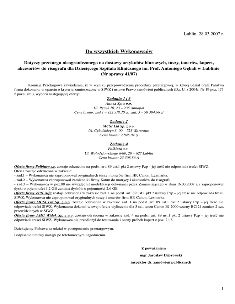 Lublin, 28.03.2007 r. Do wszystkich Wykonawców Dotyczy przetargu nieograniczonego na dostawy artykułów biurowych, tuszy, tonerów, kopert, akcesoriów do risografu dla Dziecięcego Szpitala Klinicznego im. Prof. Antoniego Gębali w Lublinie (Nr sprawy 41/07) Komisja Przetargowa zawiadamia, iż w wyniku przeprowadzenia procedury przetargowej, w której udział brała Państwa firma dokonano, w oparciu o kryteria zamieszczone w SIWZ i ustawę Prawo zamówień publicznych (Dz. U. z 2004r. Nr 19 poz. 177 z późn. zm.), wyboru następującej oferty: Zadania 1 i 3 Annex Sp. z o.o. Ul. Rynek 10, 23 – 235 Annopol Ceny brutto: zad 1 – 122 318,30 zł; zad. 3 – 58 304,66 zł Zadanie 2 MCSI Ltd Sp. z o.o. Ul. Cybulskiego 3, 00 – 725 Warszawa Cena brutto: 2 845,04 zł Zadanie 4 Polbiuro s.c. Ul. Wołodyjowskiego 6/80, 20 – 627 Lublin Cena brutto: 25 508,86 zł Oferta firmy Polbiuro s.c. zostaje odrzucona na podst. art. 89 ust.1 pkt 2 ustawy Pzp – jej treść nie odpowiada treści SIWZ. Oferta zostaje odrzucona w zakresie: zad.1 – Wykonawca nie zaproponował oryginalnych tuszy i tonerów firm HP, Canon, Lexmarka. zad.2 – Wykonawca zaproponował zamienniki firmy Katun do matrycy i akcesoriów do risografu zad.3 – Wykonawca w poz.88 nie uwzględnił modyfikacji dokonanej przez Zamawiającego w dniu 16.03.2007 r. i zaproponował dyski o pojemności 1,2 GB zamiast dysków o pojemności 2,6 GB Oferta firmy ZPH Alfa zostaje odrzucona w zakresie zad. 1 na podst. art. 89 ust.1 pkt 2 ustawy Pzp – jej treść nie odpowiada treści SIWZ. Wykonawca nie zaproponował oryginalnych tuszy i tonerów firm HP, Canon, Lexmarka. Oferta firmy MCSI Ltd Sp. z o.o. zostaje odrzucona w zakresie zad. 1 na podst. art. 89 ust.1 pkt 2 ustawy Pzp – jej treść nie odpowiada treści SIWZ. Wykonawca dokonał w swej ofercie wyliczenia dla 3 szt. tuszu Canon BJ 2000 czarny BCI21 zamiast 2 szt. przewidzianych w SIWZ. Oferta firmy AHU Widok Sp. z o.o. zostaje odrzucona w zakresie zad. 4 na podst. art. 89 ust.1 pkt 2 ustawy Pzp – jej treść nie odpowiada treści SIWZ. Wykonawca nie przedłożył do testowania i oceny próbek kopert z poz. 2 i 8. Dziękujemy Państwu za udział w postępowaniu przetargowym. Podpisanie umowy nastąpi po telefonicznym uzgodnieniu. Z poważaniem mgr Jarosław Dąbrowski inspektor ds. zamówień publicznych 1