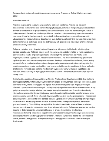 Sprawozdanie z obytych praktyk w ramach programu Erasmus w Bułgarii lipiec-wrzesień 2012 Stanisław Walczak Praktyki zagraniczne są czymś wspaniałym, polecam każdemu. Nie ma się na czym zastanawiać. Ja miałem o tyle komfortową sytuację że jechała ze mną cała grupa studentów z Polski a wiadomo że w grupie raźniej no i zawsze można liczyć na pomoc innych. Także z dokumentami również nie miałem problemu. Uczelnia i biuro wymiany było niesamowicie pomocne. Przed wyjazdem oprócz wszystkich dokumentów jeszcze musiałem wyrobić ubezpieczenie. Naszym krajem docelowym była Bułgaria, członek Unii Europejskiej więc ilość dokumentów nie jest długa a nie ma żadnej wizy lub pozwolenia na pobyt. Granice nawet przejeżdżaliśmy na dowód. Bułgaria – piękny kraj z bogatą kulturą i łagodnym klimatem. Jeśli chodzi o kulturę jest bardzo podobna do Polskiej, nawet język niesamowicie podobny, także w razie napotkania człowieka bez języka angielskiego można łatwo się było porozumieć po Polsku (no i migowym). Ludzie są przyjaźni, radośni i uśmiechnięci… no może z małymi wyjątkami ale ogólnie jestem pod niesamowitym wrażeniem. Praktyki odbywaliśmy w firmie, która jedną ze swoich ferm miała niedaleko miasta Burgas nad morzem tam też mieszkaliśmy. Oprócz praktyk w wolnym czasie spędzaliśmy nad morzem, także oprócz praktyk mieliśmy wakacje. Znaleźliśmy również czas na kilka niedalekich wycieczek. Ceny w Bułgarii są zbliżone do Polskich. Mieszkaliśmy w wynajętym mieszkaniu razem z kilkoma studentami więc było w miarę tanio. Jeśli chodzi o praktyki. Pracowaliśmy w Firmie: Photovoltaic Development Ltd. Jest to firma zajmująca się fotowoltaiką czyli wytwarzaniem prądu elektrycznego z energii słonecznej. Jest to Polska firma, która ze względu na lepsze warunki klimatyczne czyli więcej słońca jak również z powodów ekonomicznych I politycznych (dogodne warunki do inwestowania w tej gałęzi przemysłu) budują właśnie tam swoje fermy fotowoltaiczne. Praktyka okazała się niezwylke owocna. Oprócz zwykłej pracy papierkowej mogliśmy także współpracować przy projektowaniu nowych ferm (chociaż słowo współpraca jest trochę przesadzone – lepsze jest podpatrywanie) jednak I to było bardzo uczące. Oprócz pracy umysłowej mogliśmy pomagać w utrzymaniu działającej fermie a także budować nową – skręcaliśmy nowe panele do gotowych stelaży. To robiliśmy na wyjeździe do wioski niedaleko miasta Sliven – miejsca bardzo korzystnego do zakładania tam ferm fotowoltaicznych. Cała praca okazała się bardzo bogata w doświadczenie, umiejętność pracy w grupie (również w środowisku międzynarodowym), znajomość zagadnień najnowocześniejszych technologii słonecznych a także sprawdzenie jak to wygląda “od środka”. Praktyki są również dobre dla sprawdzenia siebie, swoich umięjętności interpersonalnych i umięjętności radzenia sobie w nowym środowisku. Cały wyjazd zaliczam do udanych. Mam nadzieję że zdobytą wiedzę I doświadczenie wykorzystam w przyszłości w życiu zawodowym. Bardzo się cieszę że dane mi było być na zagranicznych praktykach a wspomnienia z nich zachowam na długo. Praktyki z program Erasmus polecam każdemu. Nie ma się czego bać. Stanisław Walczak