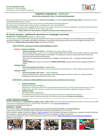 Centrum Ogrodnicze TRACZ Sosnowiec 35, 95-010 Stryków www.tracz.pl, www.facebook.com/traczco WARSZTATY OGRODNICZE – JESIEŃ 2015r oferta dla przedszkoli i klas I-IV szkół podstawowych Warsztaty ogrodnicze dla dzieci są organizowane w Sosnowcu pod Łodzią (w siedzibie Centrum Ogrodniczego TRACZ) w przytulnym wnętrzu Sali Ogrodowej Restauracji Le Jardin. Łączny czas trwania warsztatów to około 1,5h na miejscu (z krótką przerwą pomiędzy zajęciami). Nie organizujemy transportu (choć możemy polecić sprawdzonych i tanich przewoźników). Koszt warsztatów na jedno dziecko wynosi 15 zł i jest to kwota w całości przeznaczona na zakup niezbędnych materiałów wykorzystywanych podczas warsztatów ogrodniczych (doniczki, ziemia, rośliny, nawóz itp.) Rośliny sadzone lub siane podczas wszystkich warsztatów dzieci zabierają do domu. W okresie wrzesień - październik zapraszamy na następujące warsztaty: WARSZTATY OGRODNICZE składają się z dwóch części. W części pierwszej warsztatów dzieci uczą się przesadzania różnych roślin (w zależności od tematu) oraz dowiadują się jak je pielęgnować, sprawdzają wilgotność i pH podłoża specjalnymi przyrządami, a prowadzący przytaczają w trakcie pracy różne anegdoty dotyczące roślin i ogrodnictwa. Każde dziecko sadzi własną roślinę, którą zabiera do domu. CZĘŚĆ PIERWSZA - proponujemy Państwu cztery warianty do wyboru: NOWOŚĆ: WARIANT PIERWSZY: Warsztaty ogrodnicze (35-45min) – Roślinkowe pucu, pucu, chlastu, chlastu. Dzieci poznają roślinę – mydlnicę lekarską, która przed wiekami była używana zamiast mydła, a obecnie wykorzystuje się ją do produkcji najdelikatniejszych kosmetyków. Przesadzają ją, a po pracy myją rączki jej liśćmi, które przy pocieraniu pod wodą tworzą zieloną pianę. Ilość miejsc na te warsztaty jest ograniczona ze względu na dostępność roślin – o zapisach decyduje kolejność zgłoszeń. DRUGA CZĘŚĆ tego wariantu warsztatów to ZAJĘCIA PLASTYCZNE, podczas których dzieci ozdabiają dozownik na mydło. WARIANT DRUGI: Warsztaty ogrodnicze (35-45min) – Kwiaty jesieni Dzieci przesadzają do kolorowych wrzosy lub chryzantemy drobnokwiatowe – kwiaty będące symbolami jesieni. WARIANT TRZECI: Warsztaty ogrodnicze (35-45min) – Zioła i przyprawy Podczas warsztatów dzieci sadzą aromatyczne zioła wykorzystywane również w kuchni np.: miętę, tymianek. Dowiadują się czym zioła różnią się od innych roślin. CZĘŚĆ DRUGA - proponujemy dwa warianty do dowolnego łączenia z tematami części pierwszej: WARIANT PIERWSZY: Koszyczek Pani Jesieni (35-45min.) Zapraszamy na spacer po szkółce roślin w poszukiwaniu jesiennych liści i owoców. Dzieci dowiadują się co to jest szkółka roślin, jak zmienia się wraz z porami roku oraz poznają przyrodnicze zagadnienia związane z jesienią. WARIANT DRUGI: Warsztaty plastyczne (35-45min) Prace wykonywane podczas warsztatów są powiązane tematycznie z ogrodnictwem i jesienią. W ostatnim tygodniu października podczas warsztatów dzieci wykonują lampion na Halloween. WYBÓR I REZERWACJA TERMINU: Warsztaty odbywają się od poniedziałku do piątku w godz. 10:00-11:30 (lub w innych godzinach dogodnych dla dzieci). Terminy proszę ustalać i rezerwować indywidualnie pod nr tel.: 512 357 101 lub adresem e-mail: [email protected] O przyjęciu decyduje kolejność zgłoszeń. WARSZTATY - GALERIA Na tej stronie: http://www.facebook.com/media/set/?set=a.10150279513261265.381000.217795256264&type=1 mogą Państwo zobaczyć przykładowe zdjęcia obrazujące dotychczas przeprowadzane u nas warsztaty. Pod tym linkiem znajduje się odcinek programu "Maja w ogrodzie" http://tvnplayer.pl/programy-online/maja-w-ogrodzie-odcinki,314/odcinek416,ekologiczne-i-piekne-ogrody-styrii,S00E416,17944.html, w którym znajduje się relacja z warsztatów. Zapraszamy do odwiedzania naszej strony poświęconej wyłącznie warsztatom: http://traczcentrum.wix.com/warsztaty-ogrodnicze Serdecznie zapraszamy!